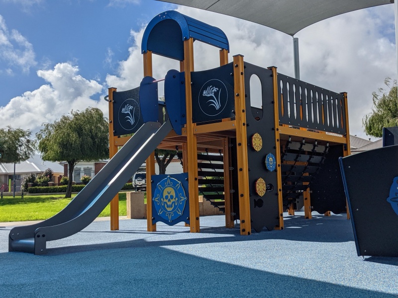 Pirattematiserad lekbåt för aktiv lek, samarbete och fantasifulla äventyr på lekplatsen.