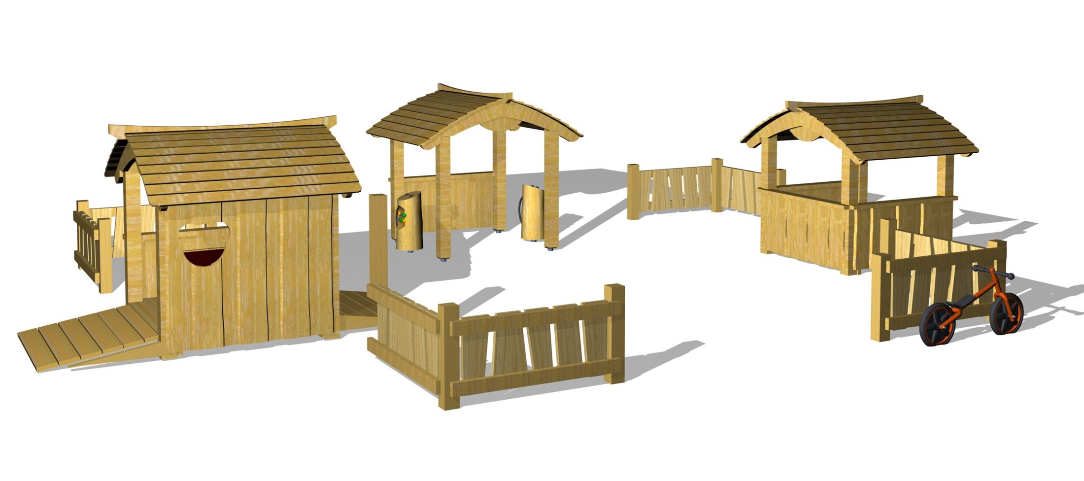 Denna produkt är utformad för fantasifull lek och socialt samspel i offentlig miljö. Complete cycling town with carwash, petrol station and playhouse. The parts are assembled into a cozy little village with some fence sections. Denna cycling city is ideal together with a cycle path, it provides both ample opportunity to unfold in various role-playing games. But it also provides some optimal framework for learning traffic rules and how to behave in traffic. Teknisk information: Åldersgrupp: 1+.