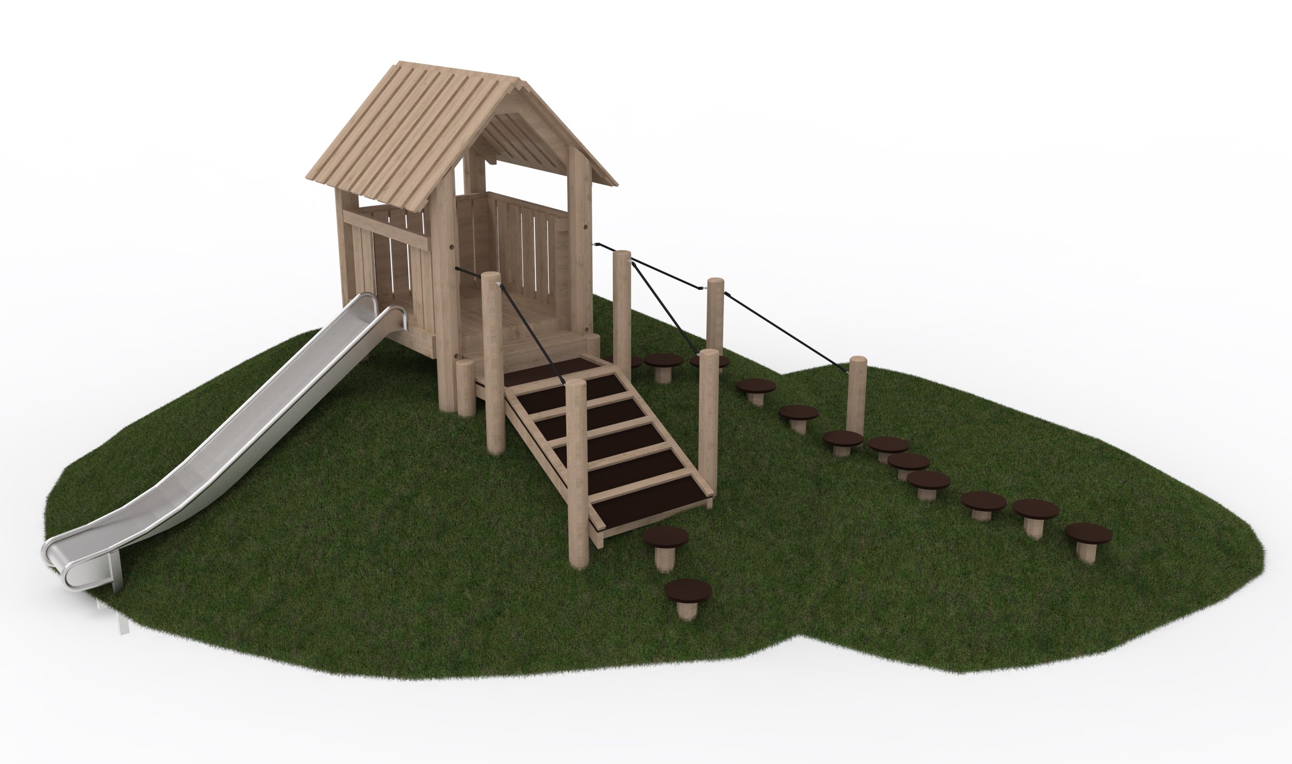 Robiniaseriens lekhus för aktiv utelek, motorisk utveckling och trygg samvaro i naturpräglad miljö.