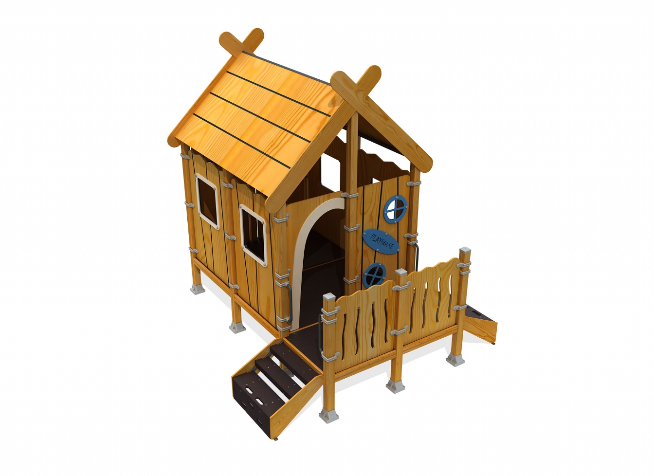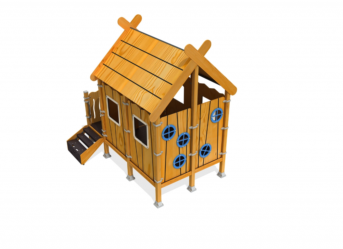 Lekhus Pelela är utvecklad för lekplatser där man vill skapa plats för fantasi, möten och lugnare lek. Produkten har bredd 343 cm, djup 322 cm och höjd 347 cm. Specifikationen omfattar säkerhetszon L 643 x W 622. Utförandet i aluminiumkopplingar, marinplywood och gummi ger en tålig konstruktion som lämpar sig för återkommande användning i krävande miljöer. Den är anpassad för upp till 12 barn och rekommenderad ålder 1-12.