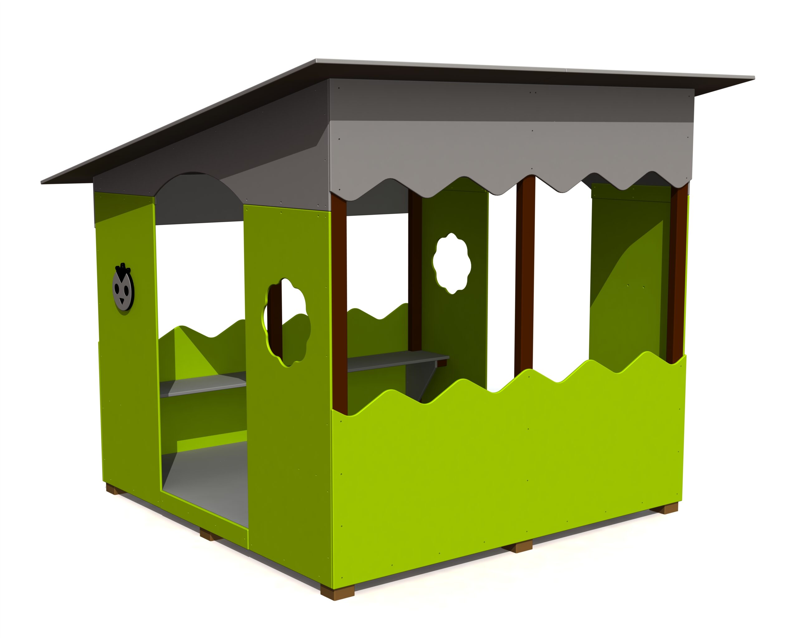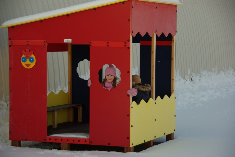 Skyddsugglan är en härlig färgstark konstruktion, där man kan hitta skydd från regn och sol, spela spel eller förvara saker. Inne i huset finns bänkar på två sidor som bekvämt har plats för 8-10 barn. Det finns uggle-faced ställningar på utsidan bredvid dörröppningarna.