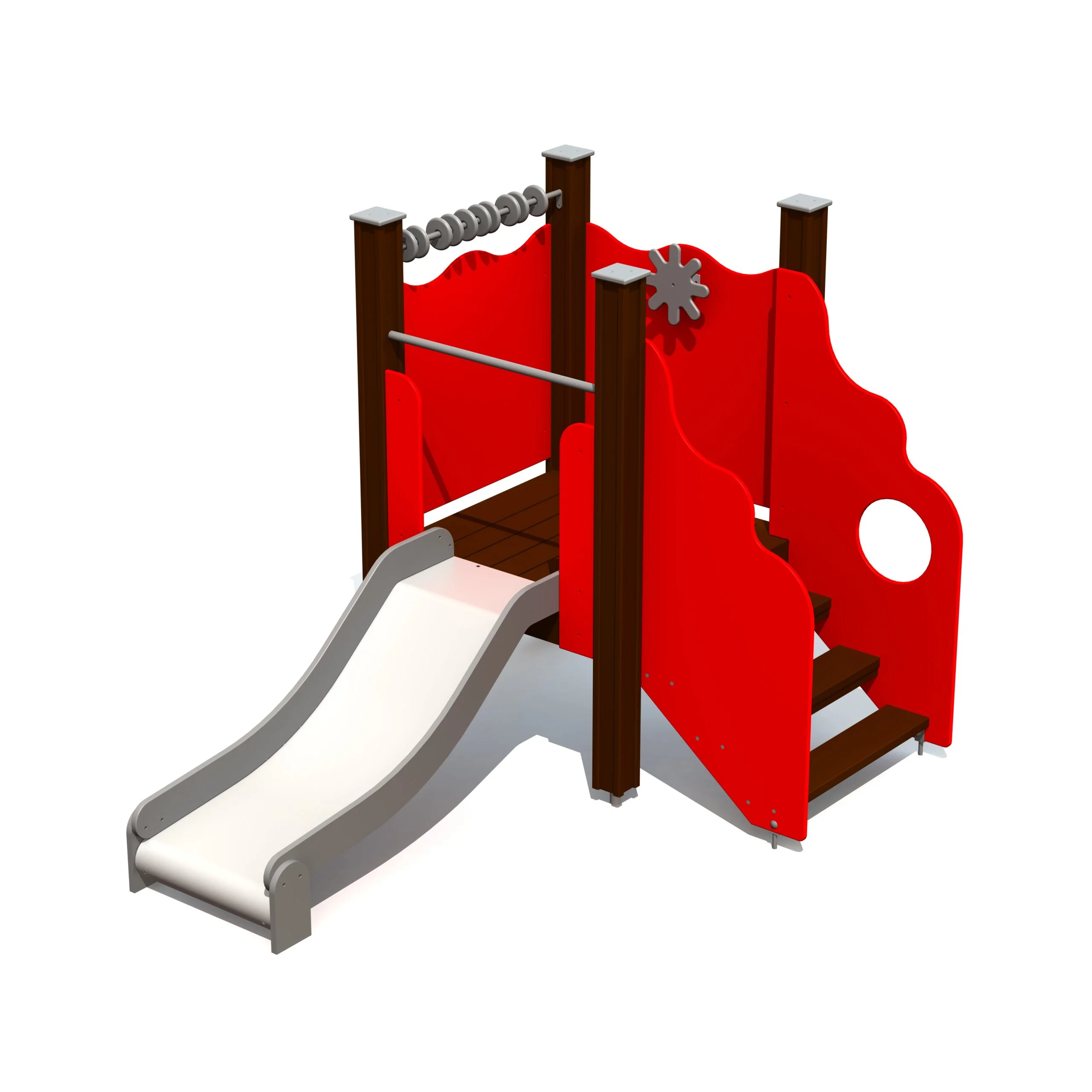 En lekfull rutschkana för de allra minsta, utformad med en låg och stabil plattform som gör den idealisk för nyfikna småbarn. Rutschkanan har en lättillgänglig trappa med säkra sidopaneler som ger extra stöd när barnen klättrar upp. Lekpanelen är utrustad med både kulram och kaptensroder, vilket uppmuntrar till fantasifull lek, rollspel och enkel räknelek. Här utvecklas finmotorik, socialt samspel och turtagning samtidigt som barnen upptäcker glädjen i att klättra och rutscha. Den låga höjden och det vänliga formspråket gör rutschkanan särskilt lämpad för förskolor och småbarnslekplatser där trygghet och tillgänglighet står i fokus.