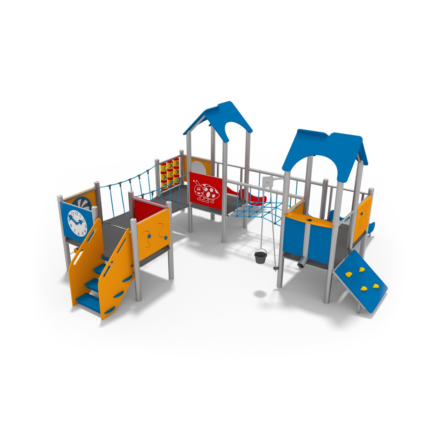 Lekställning Aloo med broar, rutschkanor och sandlek för offentlig miljö.