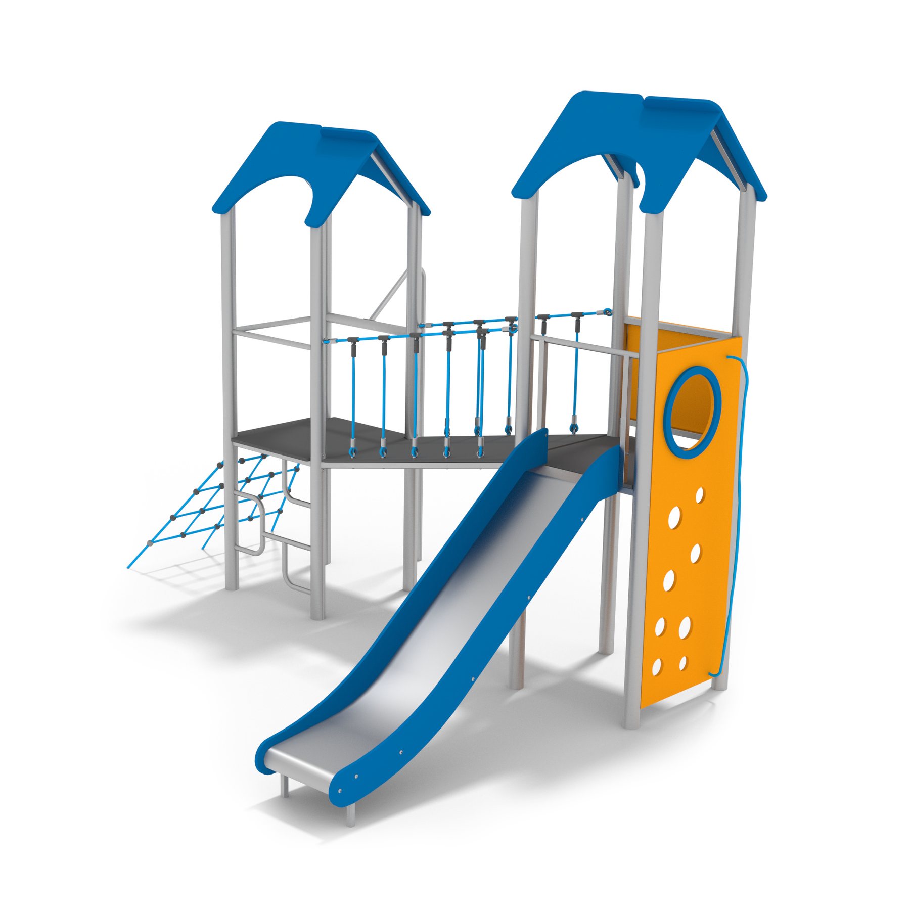 Lekställning Aluia är utvecklad för lekplatser, skolor, förskolor, parker och bostadsgårdar och anpassad för daglig användning där slitstyrka, säkerhet och låg underhållsnivå är viktiga krav. Den är utformad med klättervägg, rutschbana och bro för att skapa en tydlig och funktionell användning. Konstruktionen i rostfritt stål, HDPE och polyesterrep bidrar till lång livslängd och gör produkten lämplig för utomhusbruk året om. Den stödjer aktiviteter som klättring, rutschlek, fysisk aktivitet, motorik och koordination, vilket gör den till ett funktionellt inslag i miljöer där rörelse, lek eller träning står i fokus. Rekommenderat underlag är gummiplattor och grus.