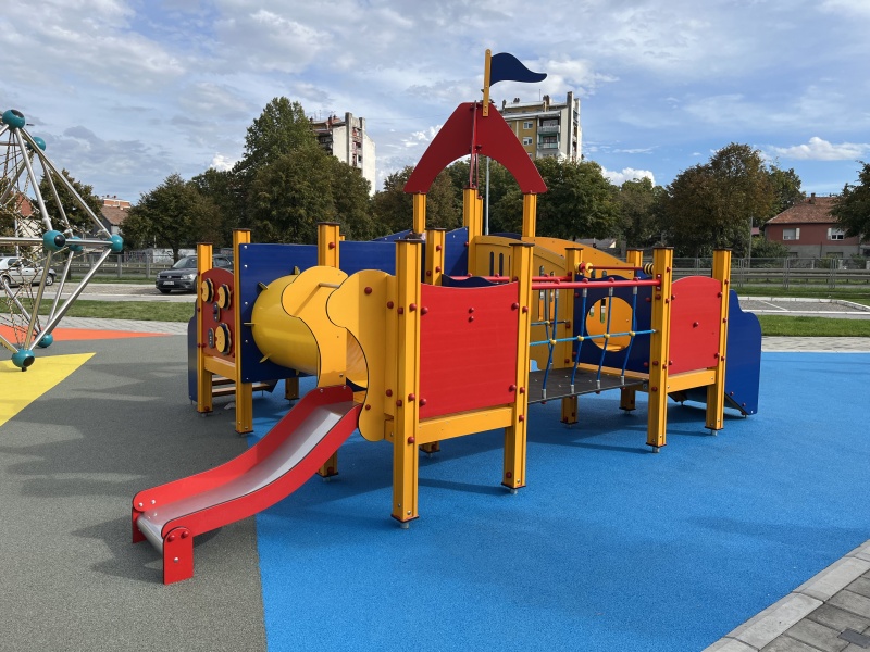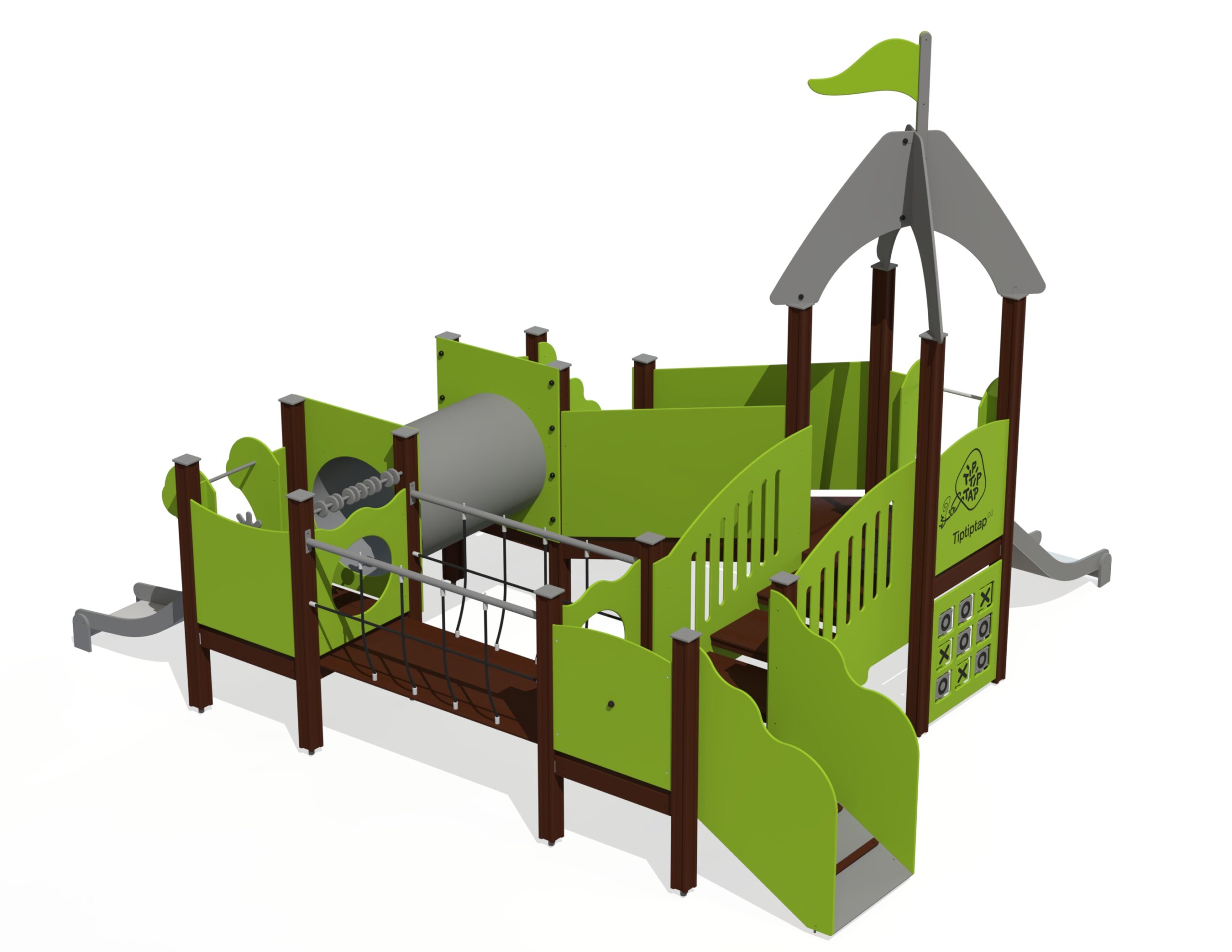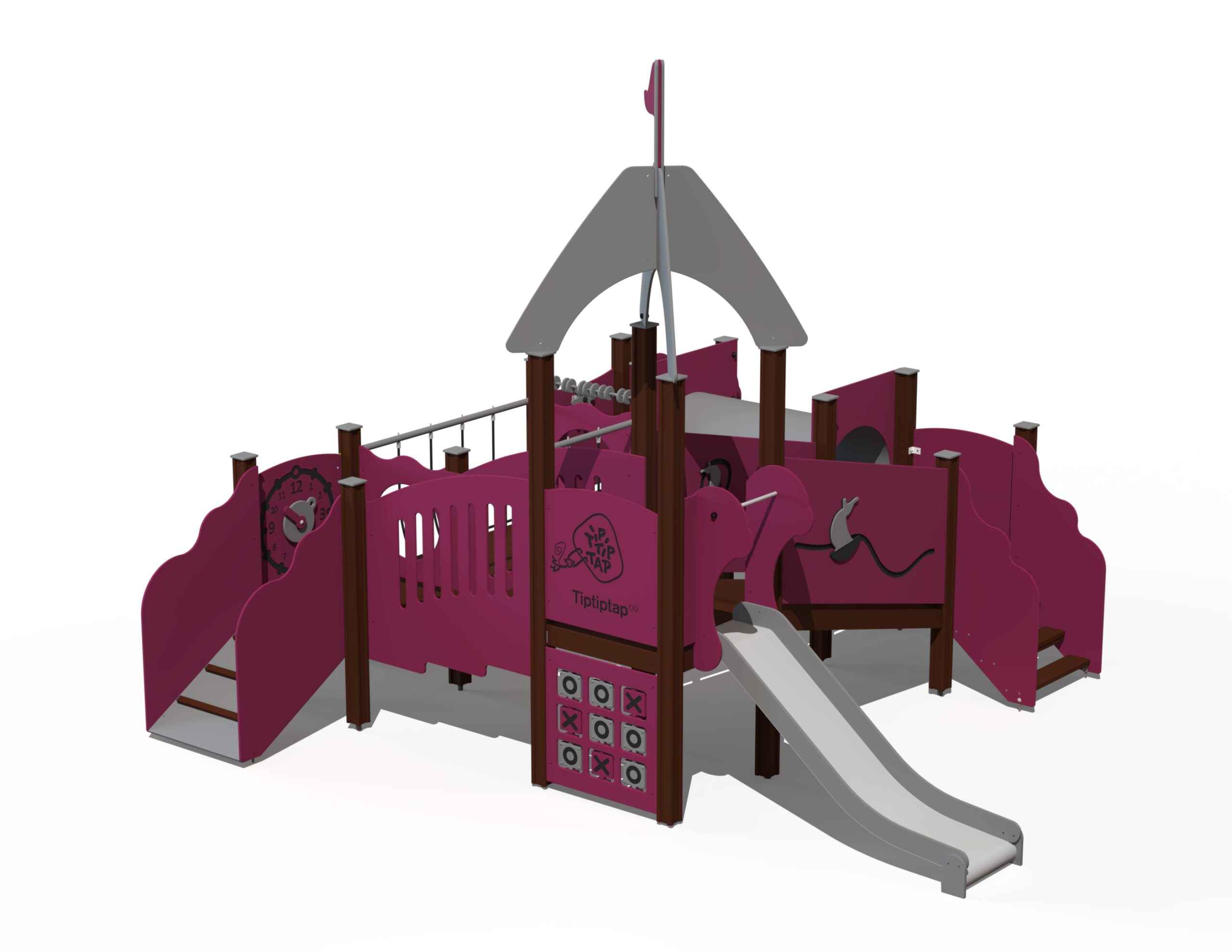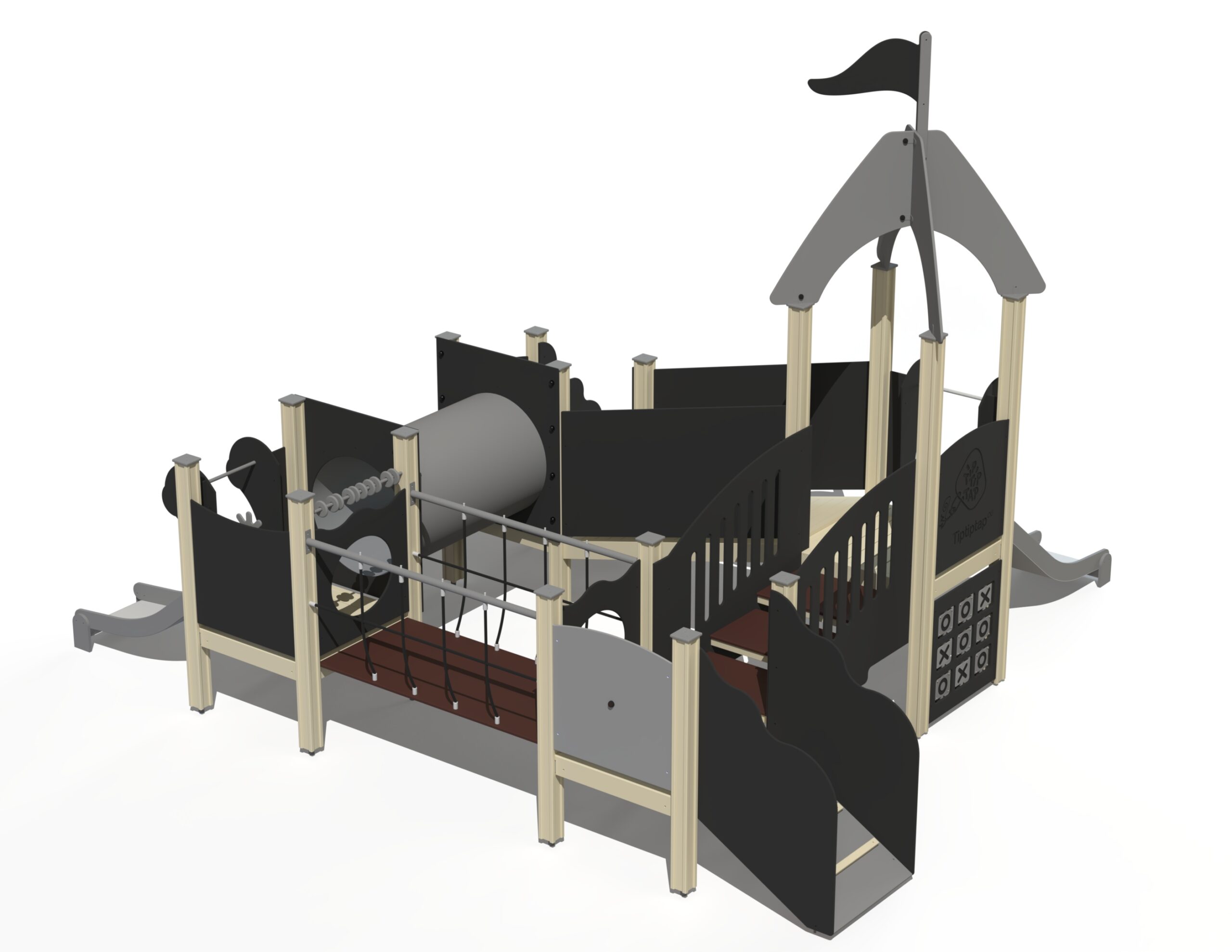 Lekplats för småbarn med fyra plattformar som binds samman via trappor med ledstänger, ramp med stegpinnar, nätbro och kryptunnel. Två rännor i olika höjder ger variation i glidlek. Kulram, roterande sifferpanel, Tic-Tac-Toe, klocka med visare, rörliga segelbåtar och kaptensroder tränar finmotorik och kognitiva färdigheter.