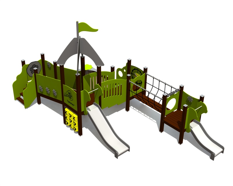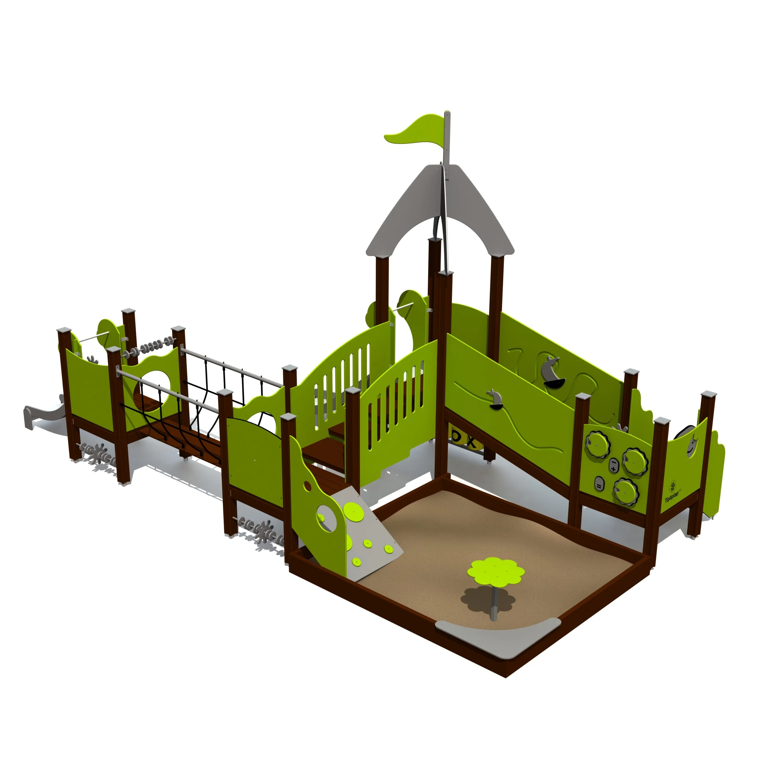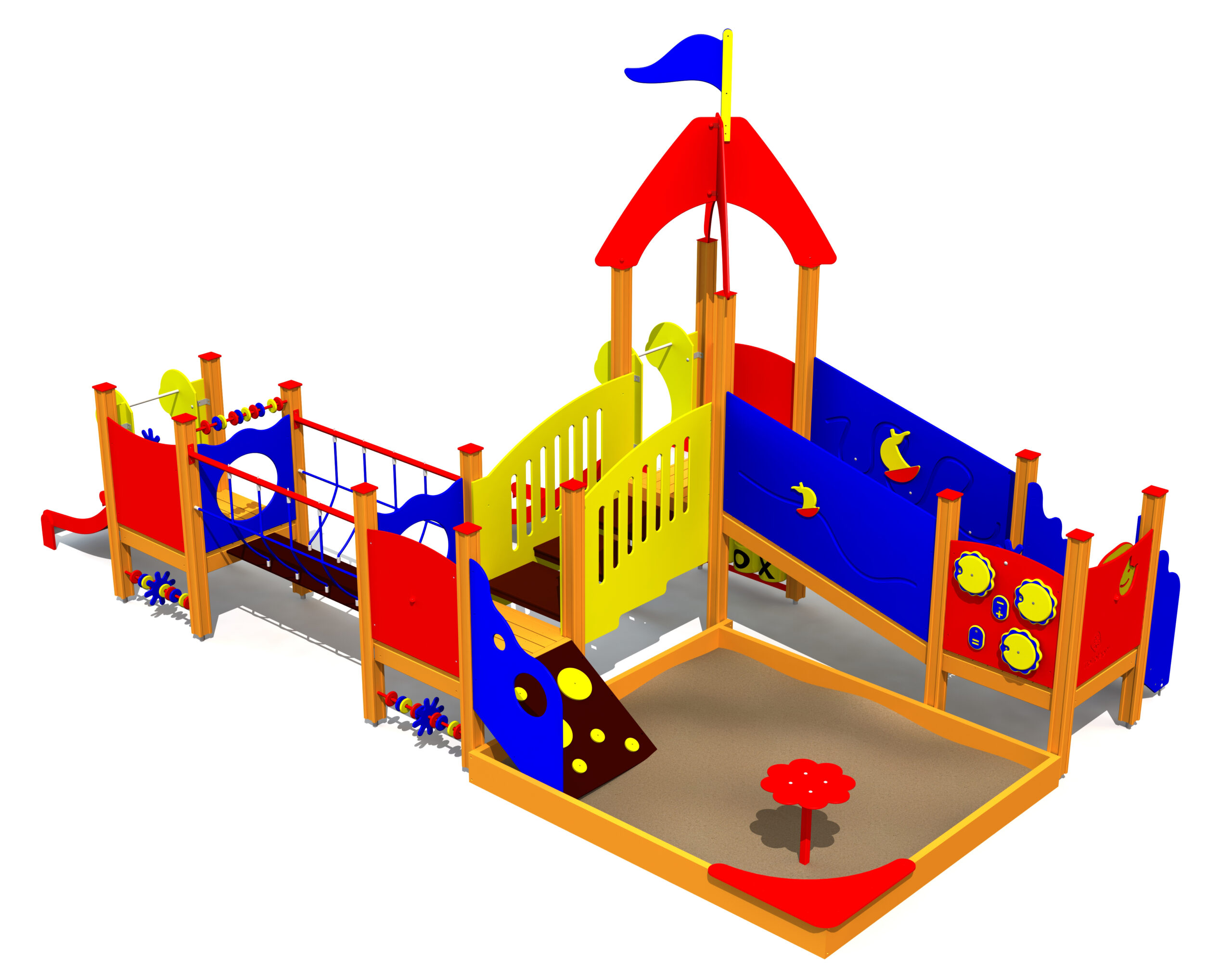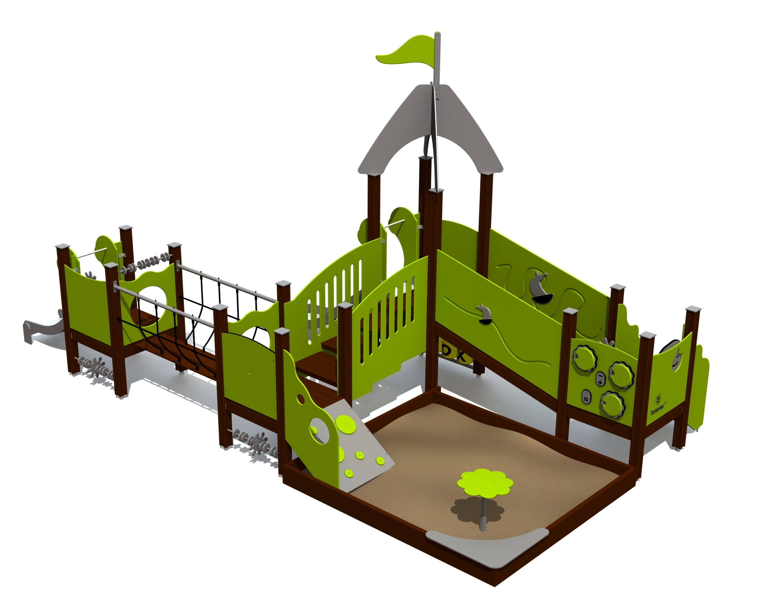 Lekplats med fyra plattformar som binds samman via trappor, ramper med stegpinnar, nätbro och kryppaneler. Rutschkana leder ner. Integrerad sandlåda med lekbord och hörnplattformar ger utrymme för sandlek. Kulram, roterande paneler, Tic-Tac-Toe, klocka, segelbåtar och fem kaptensror utvecklar finmotorik.