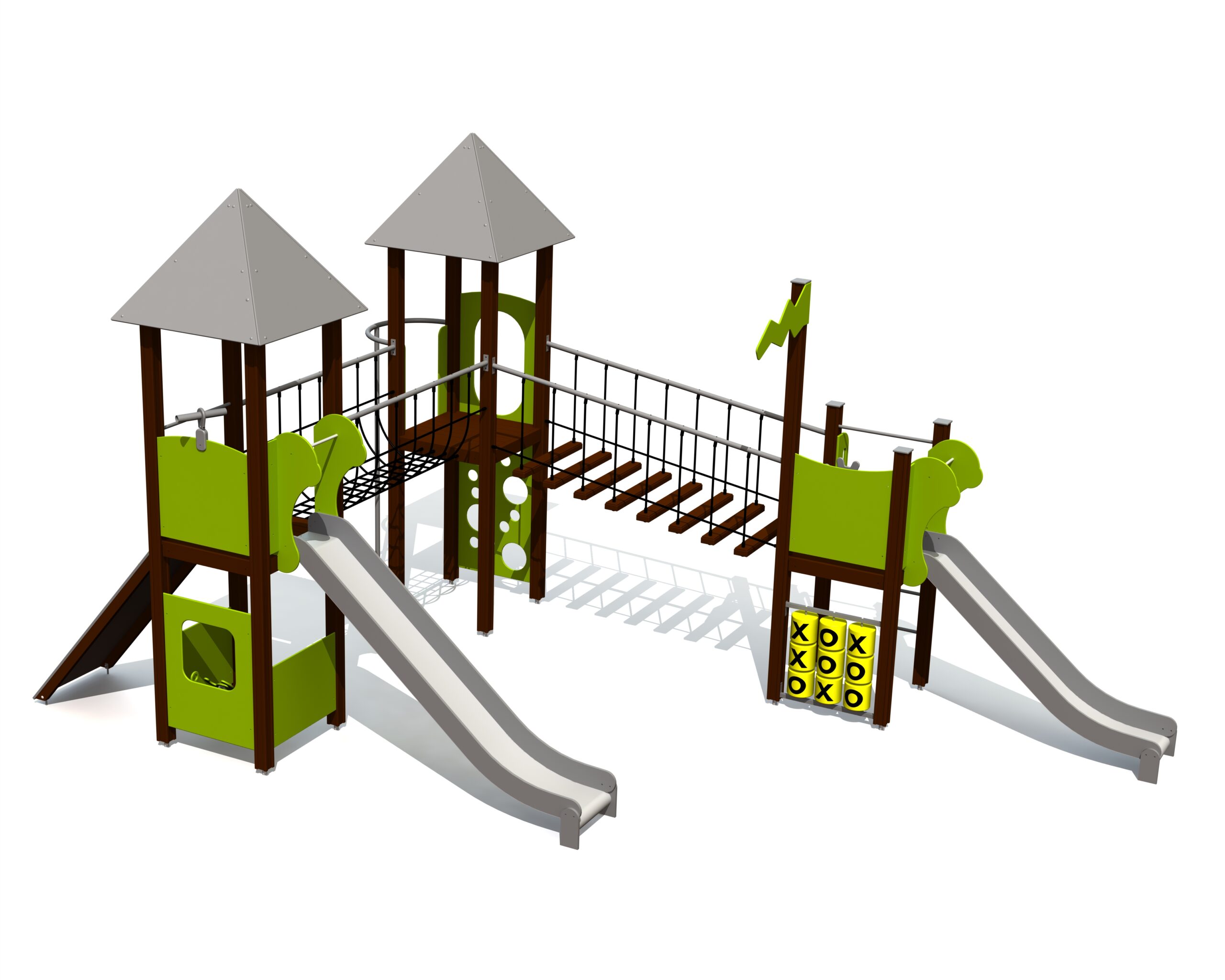 Lekplats med tre plattformar, två rutschkanor och flera klätterelement. En stege leder till den lägsta plattformen med rutschkana. En balansbro med rörliga steg leder vidare till nästa nivå där barn kan välja brandmansstång eller nätbro till den högre plattformen. Den högsta nivån kan även nås via klättringssluttning. Klättervägg, Tic-Tac-Toe, kaptensroder och kikare kompletterar leken. Under plattformen finns lekhörna med bänk som kan utrustas med köks- eller bilinstrumentpanel.