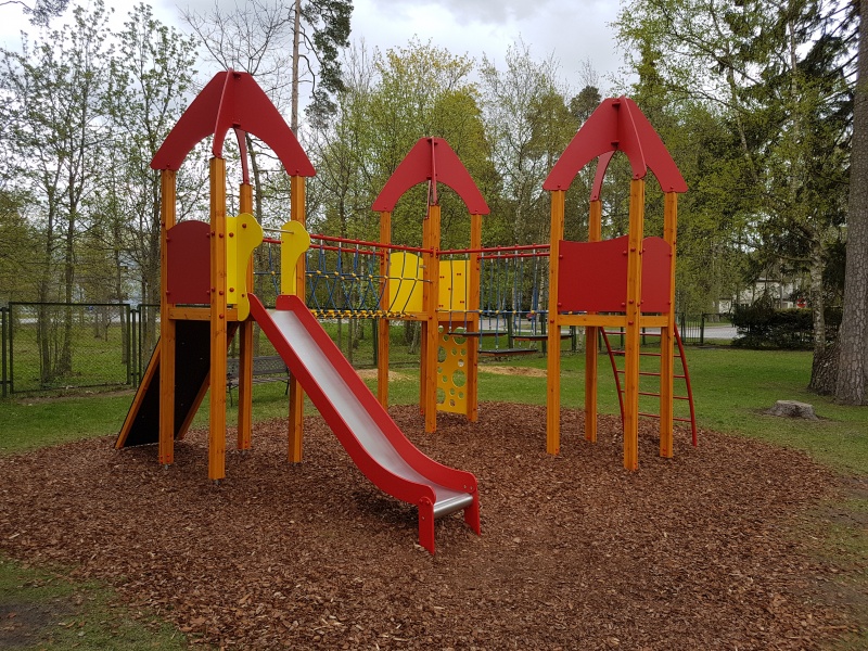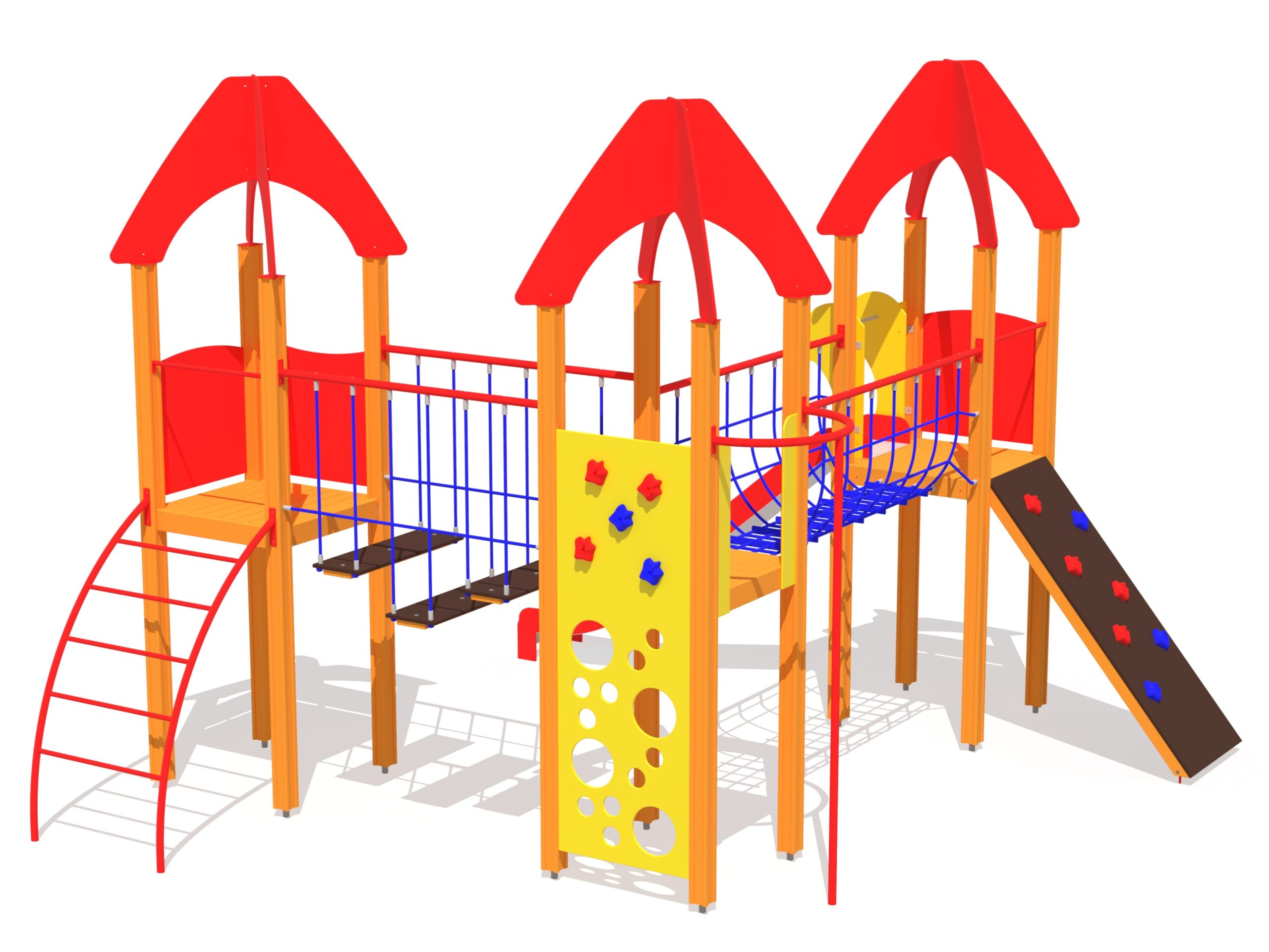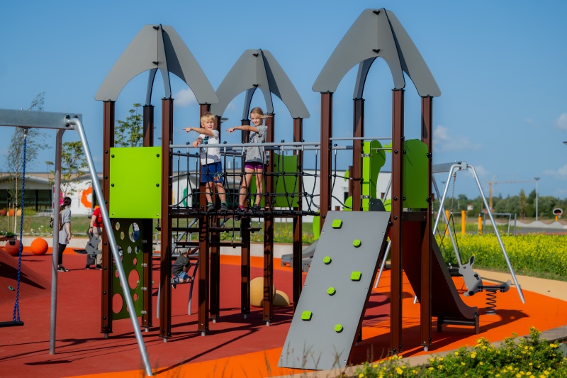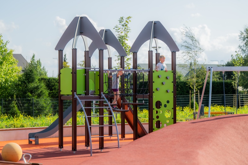 Stor och variationsrik lekställning med flera plattformar, broar och klättervägar som uppmuntrar aktiv lek och samarbete. En utmanande lösning för barn som gillar rörelse och äventyr.