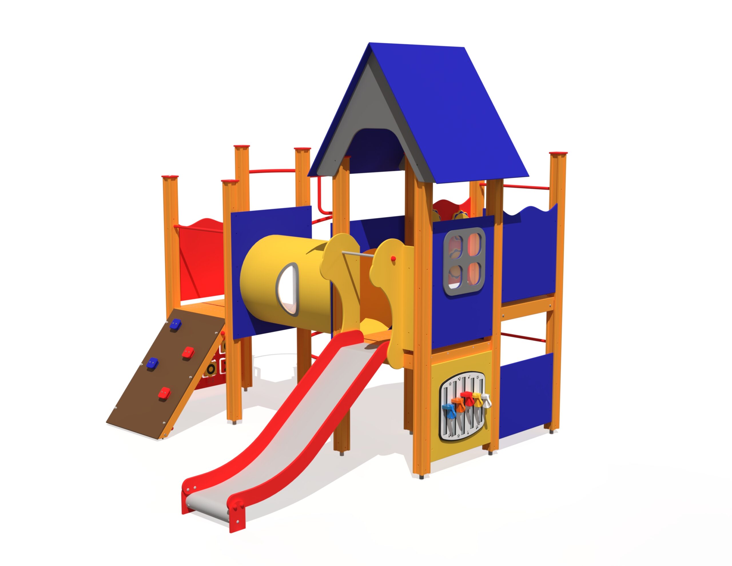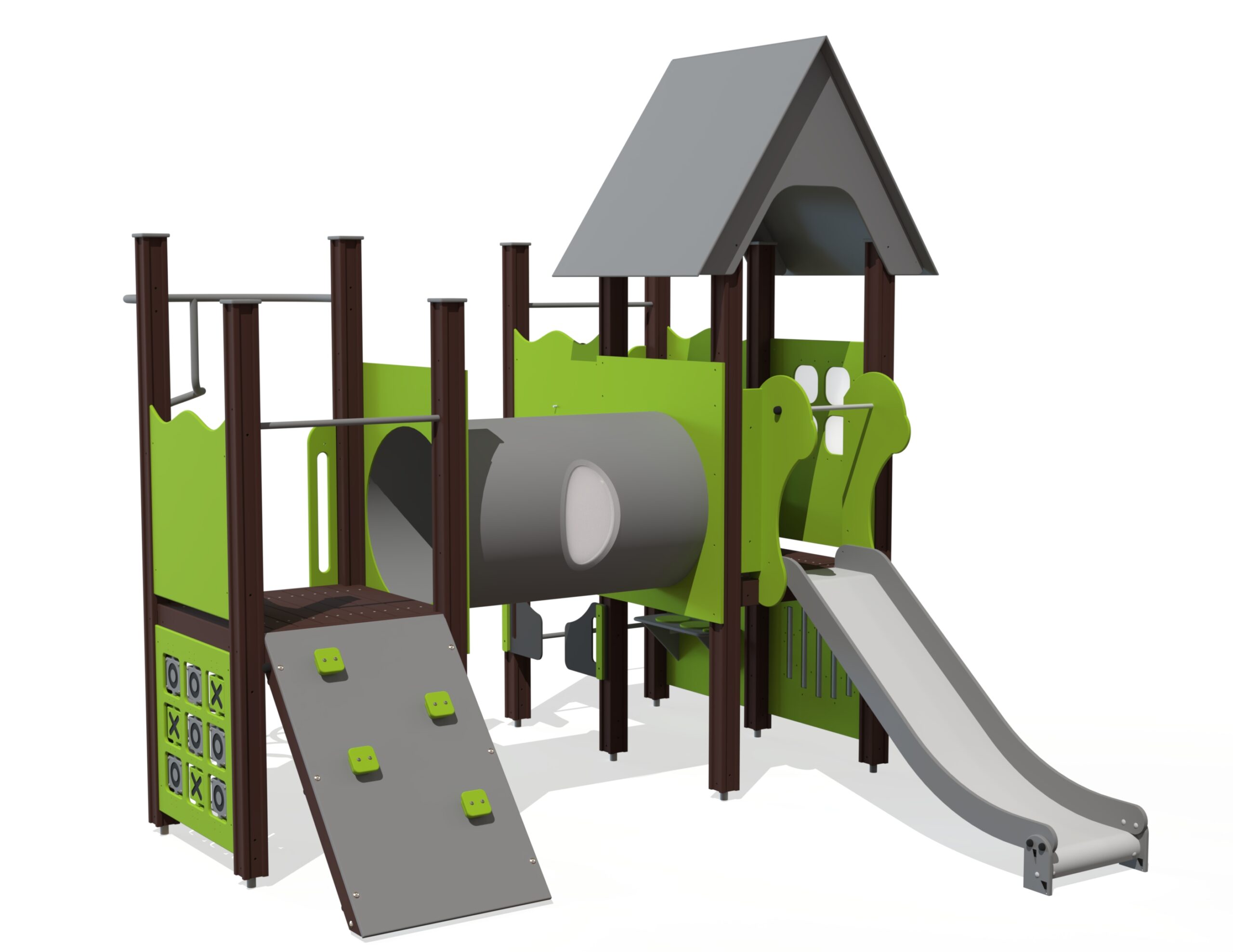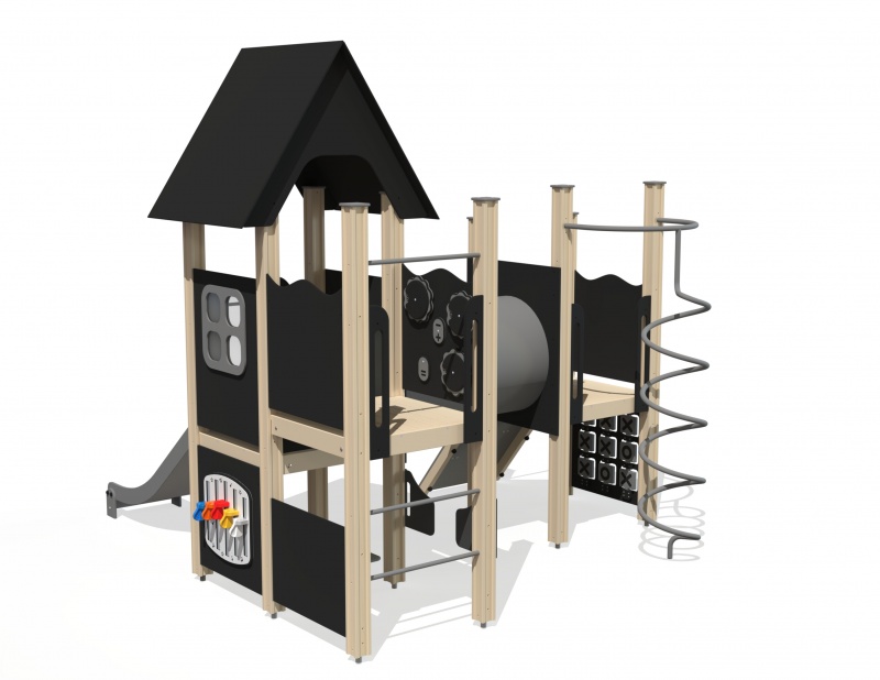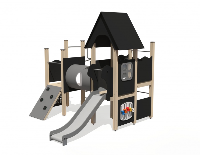 Spännande lekställning med flera nivåer, aktivitetsytor och skyddade lekmiljöer som kombinerar rörelse och lärande.