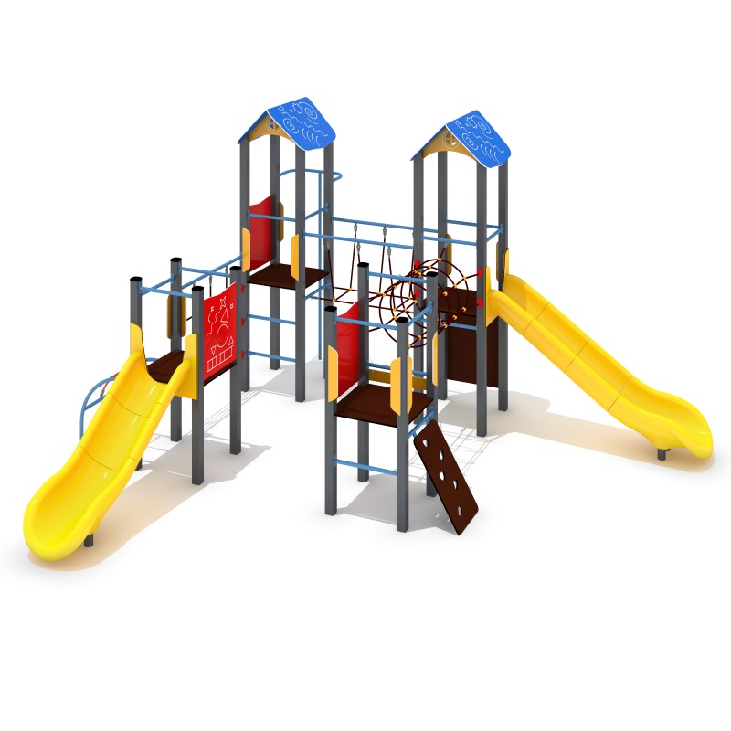 Konstruktion consistsrör med en square profil. Plattform Gjord av HPL material. Walls Gjord av HDPE material med en tjocklek 1 2 mm. A slide is Gjord av colorful, hållbart PE material that does not heat up. Nuts och washers are Gjord av rostfritt stål. Rope climbing net, Tunnel och bridge Gjord av 1 6 mm polypropylene rope med en stål core.