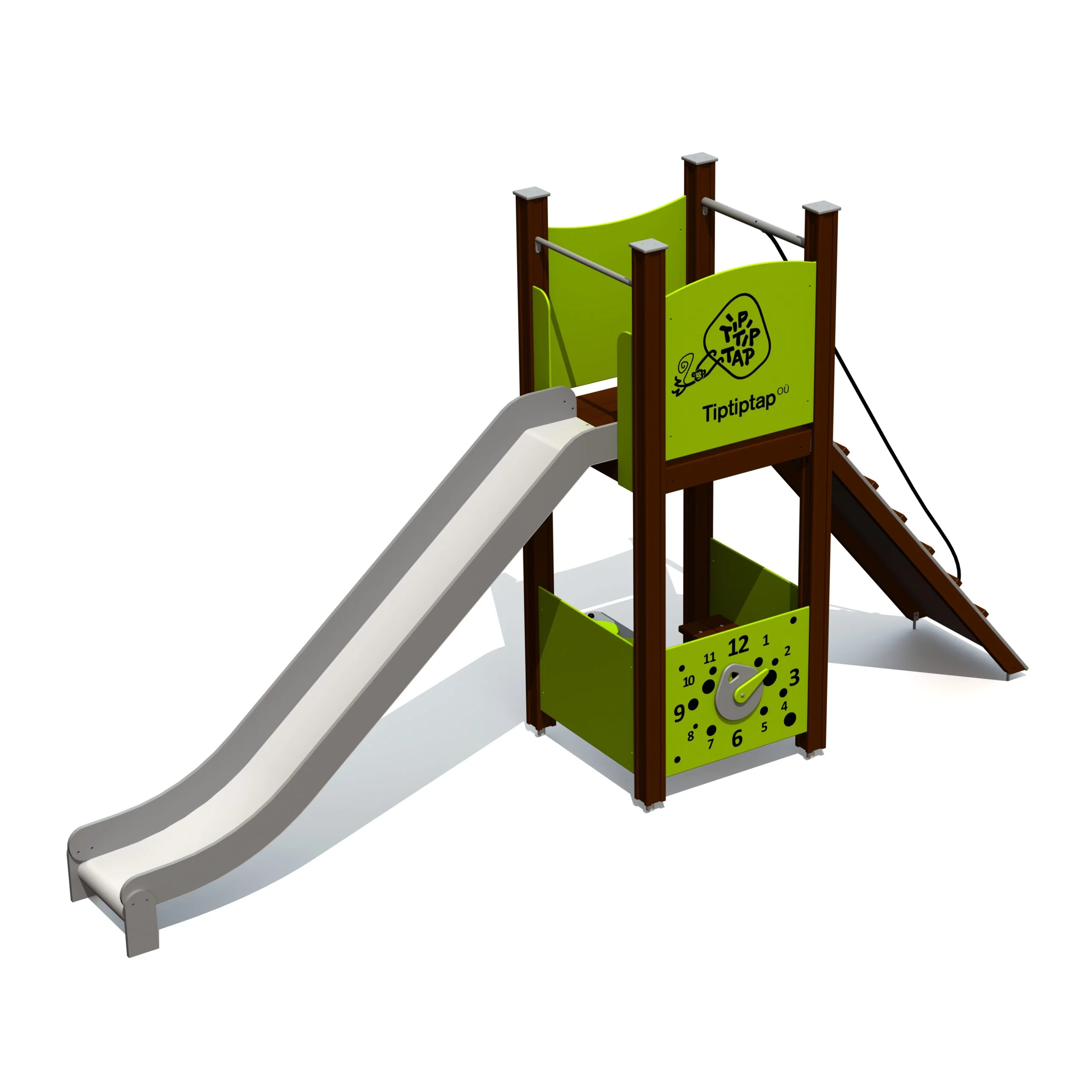 Lekställningen består av en rutschkana med ränna samt en ramp med stegpinnar som ger barnen flera sätt att ta sig upp. Under plattformen finns en lekhörna med bänk som kan kompletteras med antingen köks- eller bilinstrumentpanel för fantasifull rolllek. Utsidan är utrustad med en aktivitetspanel i form av en klocka som hjälper barnen att bekanta sig med tid. Sidopanelerna kan bytas ut mot olika aktivitetsväggar eller tematiska tryckta motiv såsom djur, fåglar, fiskar, träd eller bär. Utformningen av panelerna fastställs i samråd med kunden vid beställning.