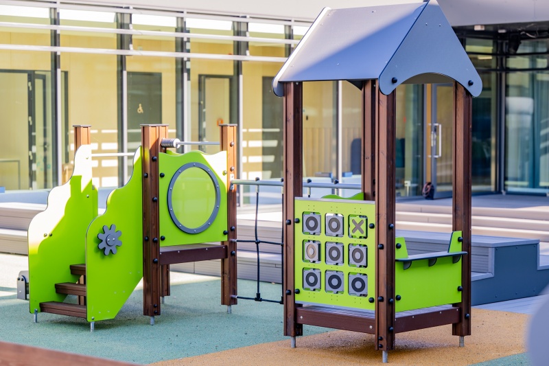 Småbarnsanpassad lekplats med rutschkana och flera pedagogiska aktivitetspaneler.