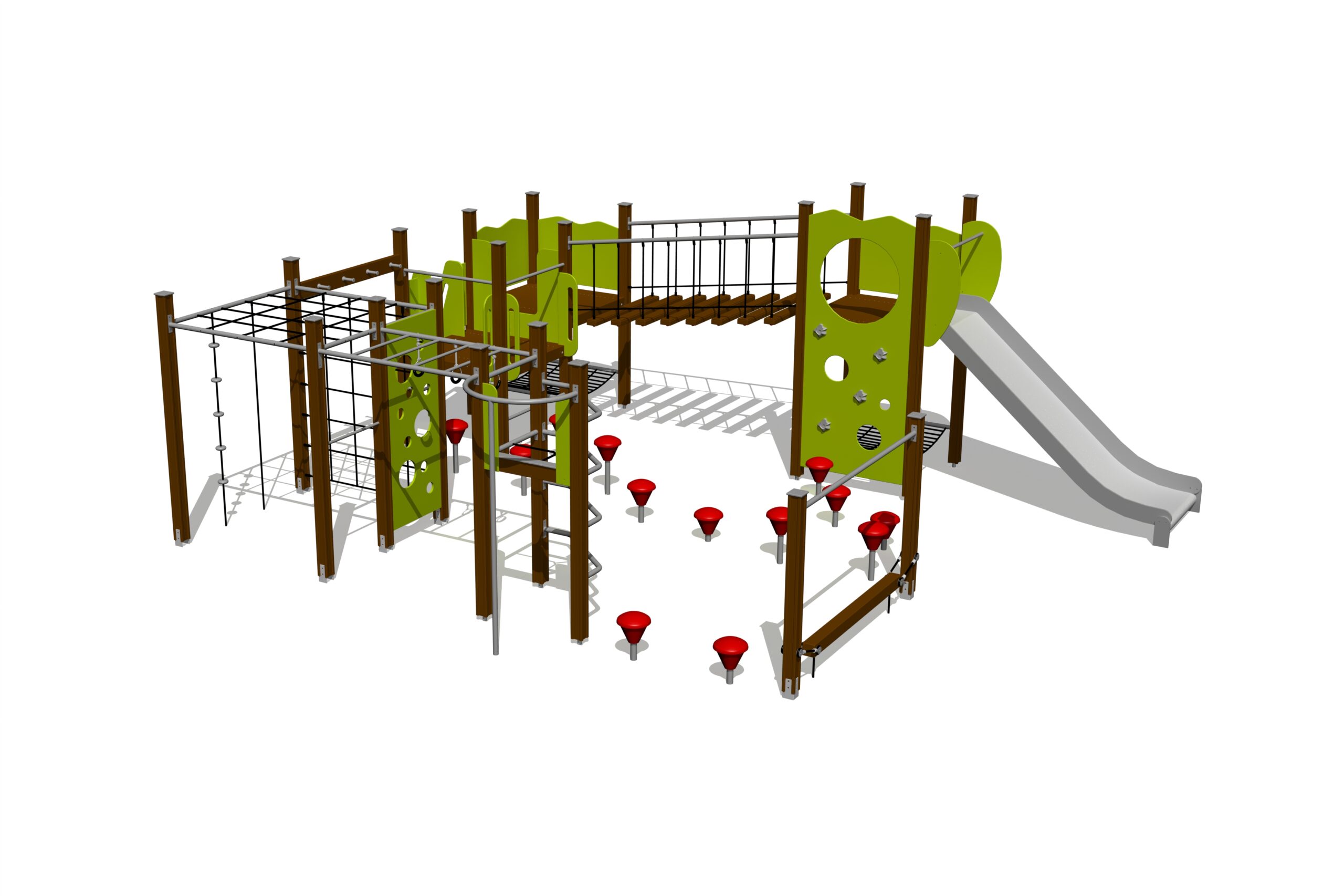 Lekcenter med tre plattformar som nås via olika stegar. Två plattformar binds samman med balansbro med rörliga steg och nät under. Utrustningen innehåller horisontell och vertikal nätvägg, stegar, monkey bars, klättervägg med hål, klätterrep, balansbalk och balansställ. Extra bred rutschkana och brandmansstång ger säker nedfart.