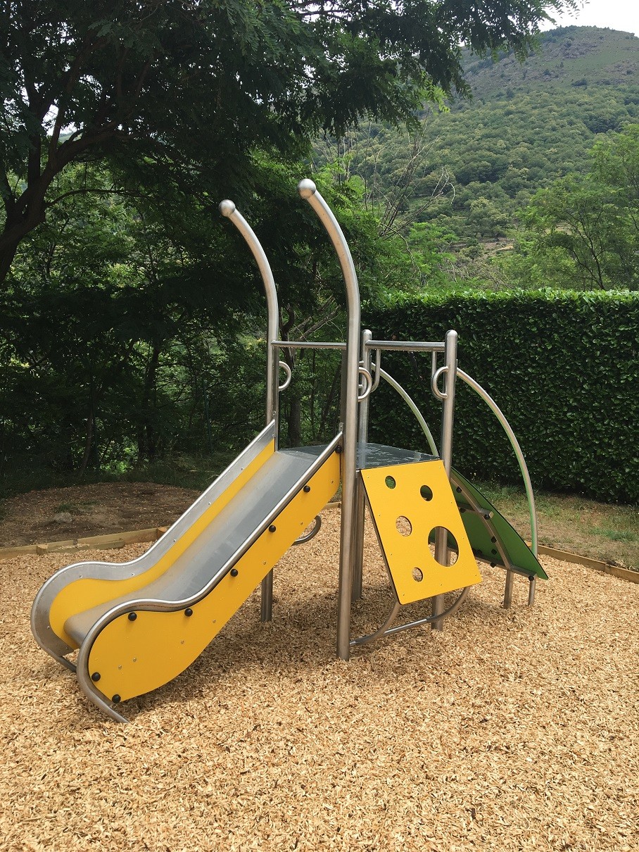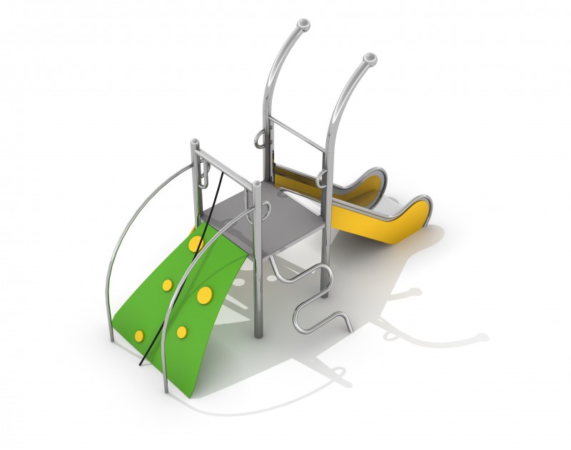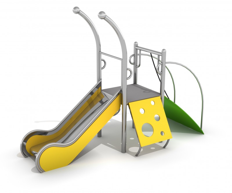 Lekställning DOMETO 1-1 för offentlig utemiljö med fokus på säker användning, robust konstruktion och lång livslängd vid daglig drift. Material: rostfritt stål och pulverlackerat stål.