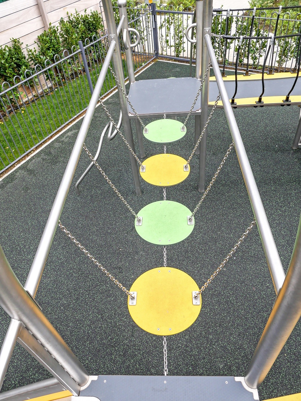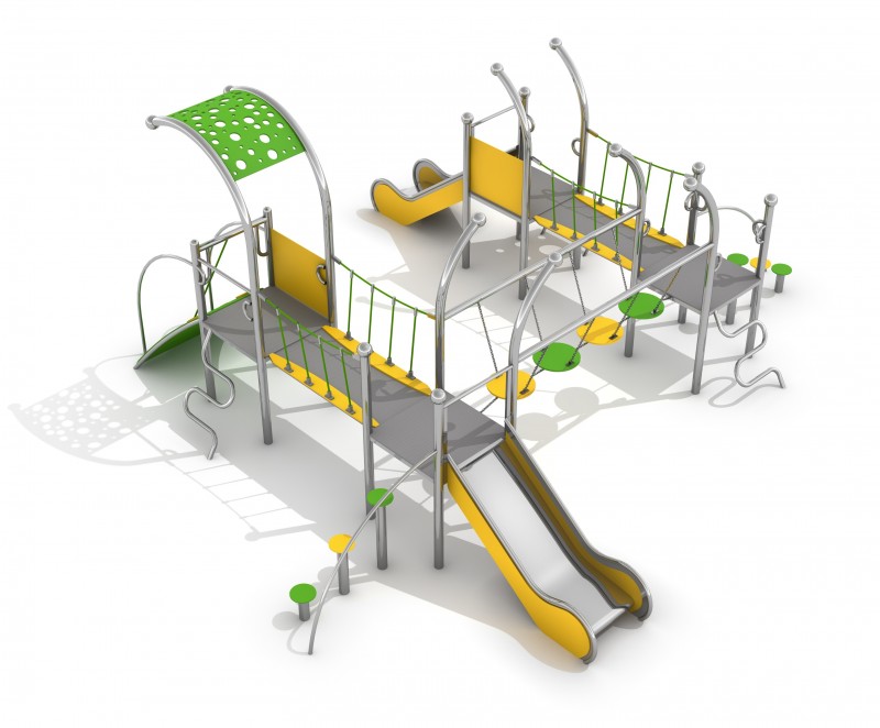 Lekställning DOMETO 4-1 för offentlig utemiljö med fokus på säker användning, robust konstruktion och lång livslängd vid daglig drift. Material: rostfritt stål och pulverlackerat stål.