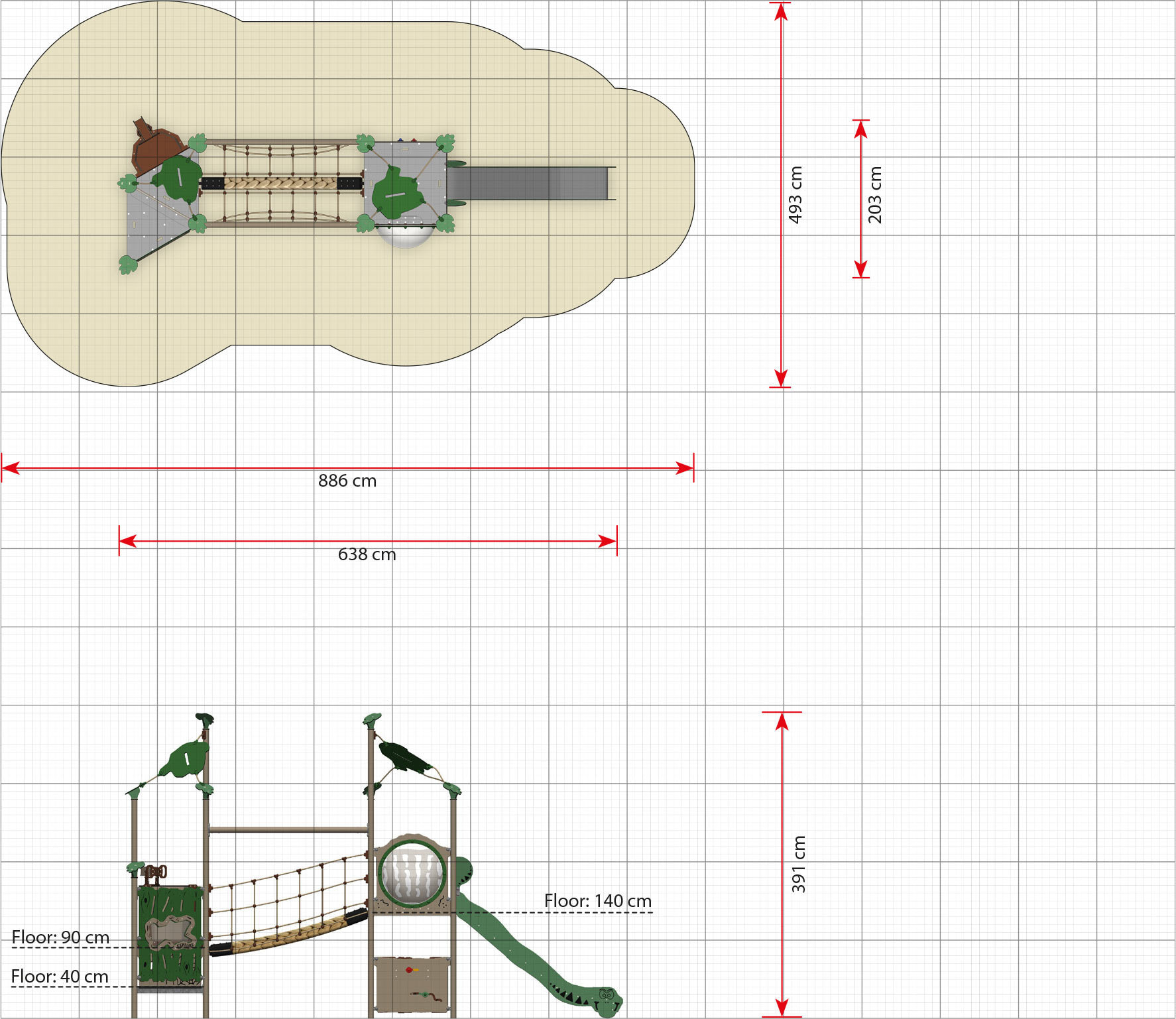 Lekställning Ersa är utvecklad för lekplatser där barn behöver varierade utmaningar i samma produkt. Den kombinerar lekvärde med robust konstruktion och uppmuntrar till klättring, balans och social lek. Produkten passar väl i förskola, skola och parkmiljö där hög användning ställer krav på kvalitet och driftsäkerhet. Mått (L x B x H): 638 cm x 203 cm x 391 cm. Max fallhöjd: 140 cm. Rekommenderad ålder: Från 3 år.