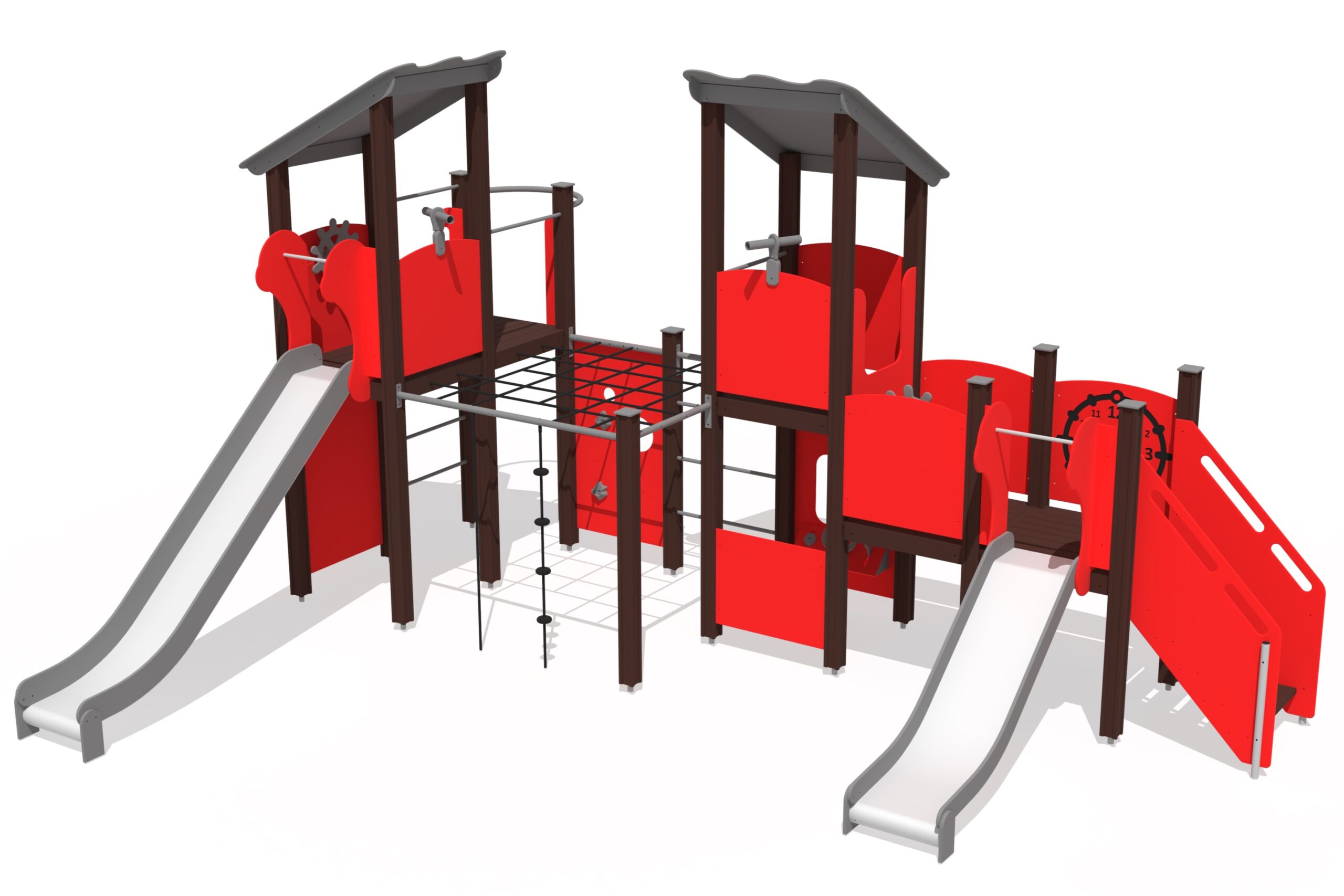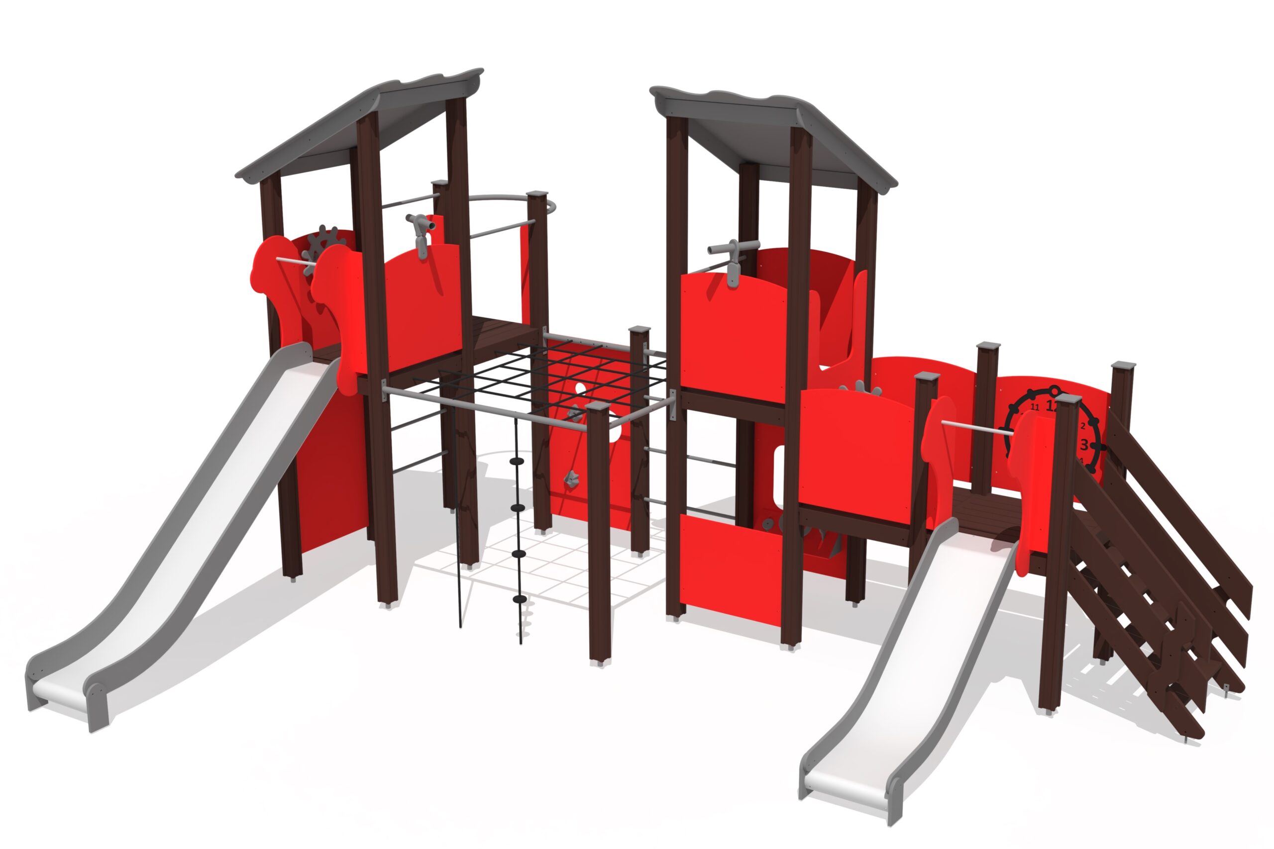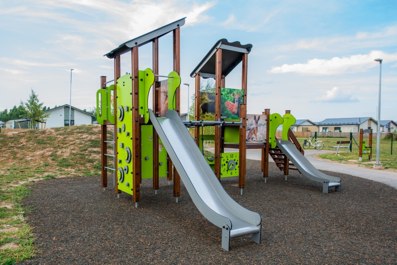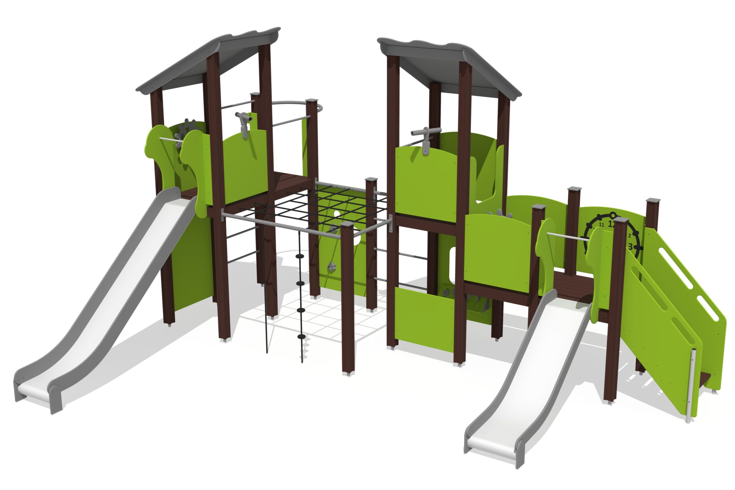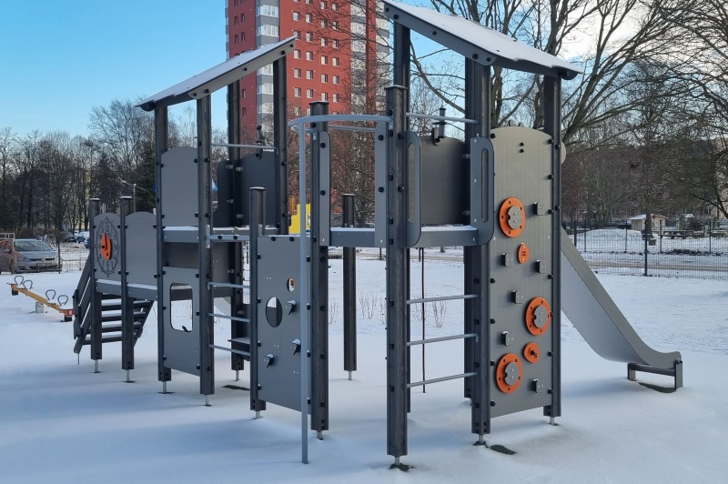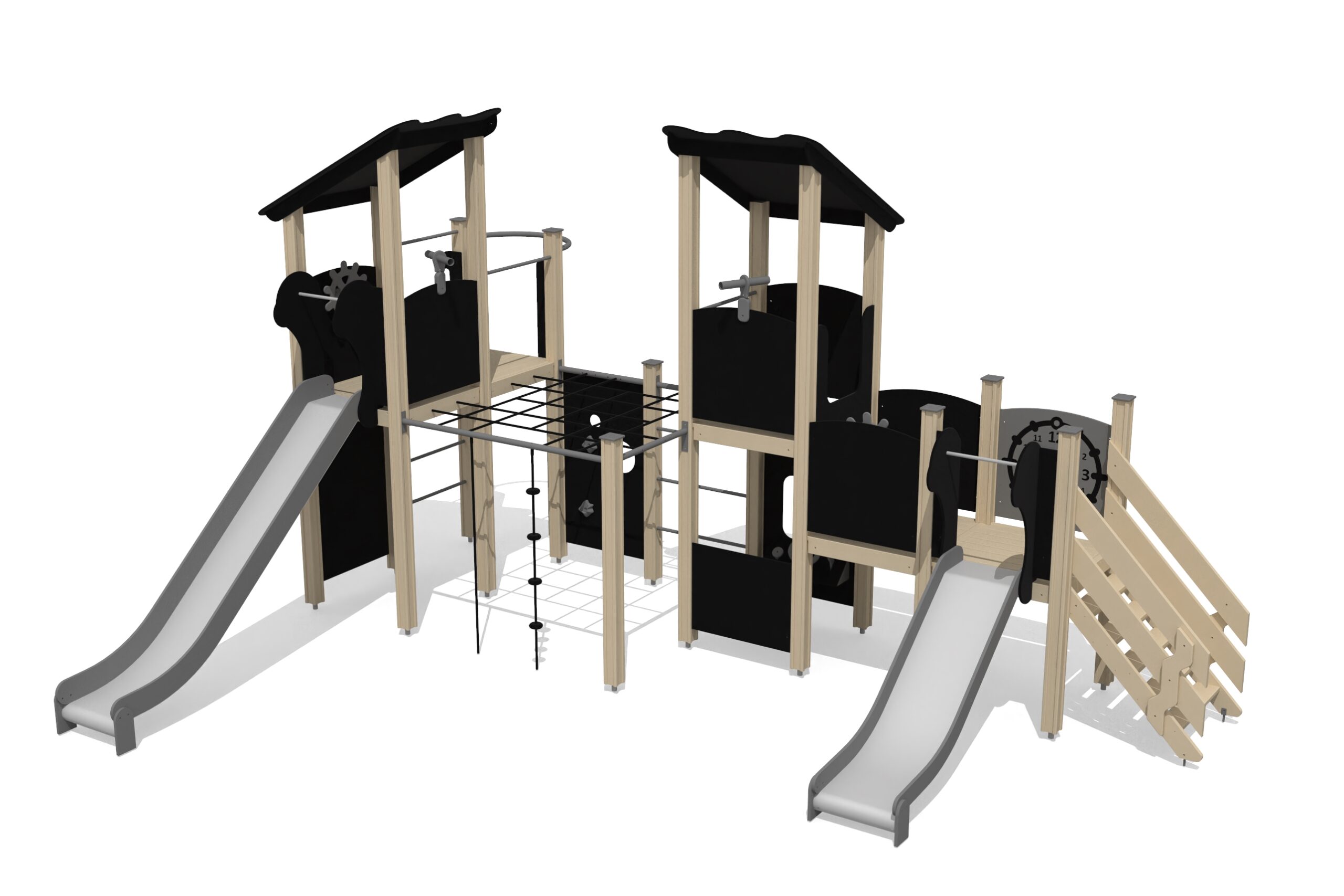 Lekcenter med fem plattformar och två rutschkanor. Trappor leder till nedre plattform med rutschkana, klockpanel och vridhjul. Stegar, klätterväggar och nät leder till högre nivåer. Rutschkana och brandmansstång ger nedfart. Angränsande klätterkomplex med nätväggar, klätterrep och klättervägg utmanar barnens skicklighet. Kikare och lekhörna med bänk kompletterar leken.