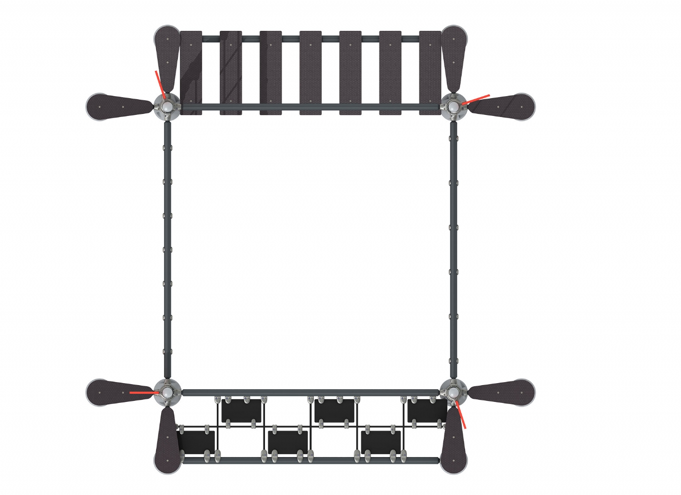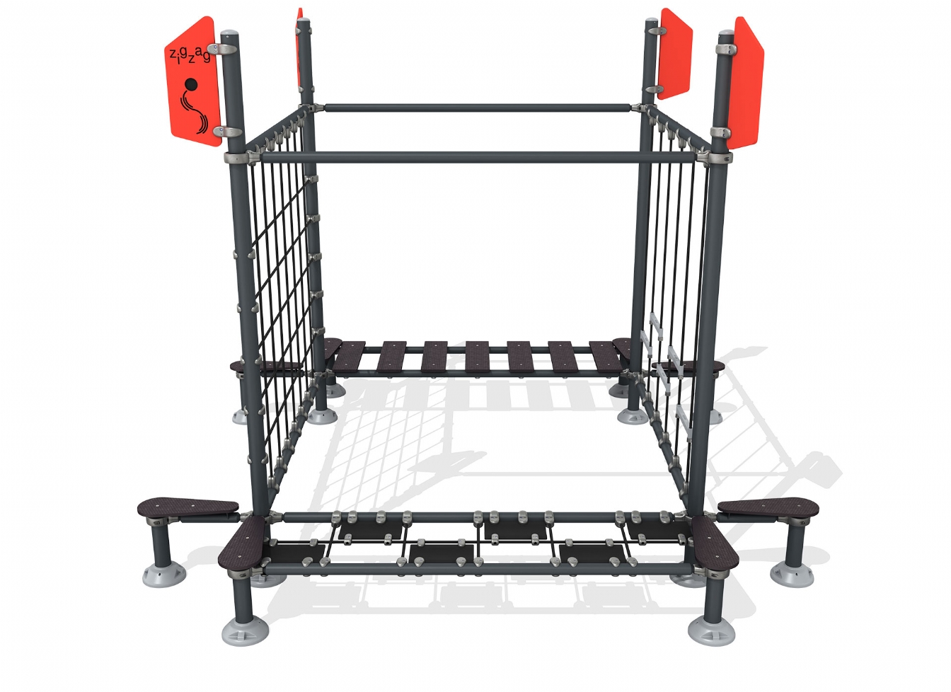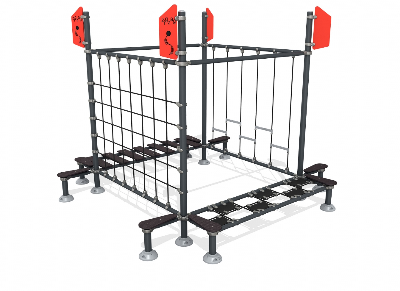 Lekställning Ilari i metallprofil, HDPE och HPL för offentlig miljö.