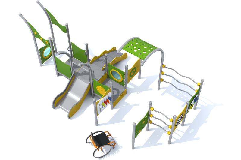 Lekställning INFANO-I 6 för offentlig utemiljö med fokus på säker användning, robust konstruktion och lång livslängd vid daglig drift. Material: rostfritt stål och HPL.