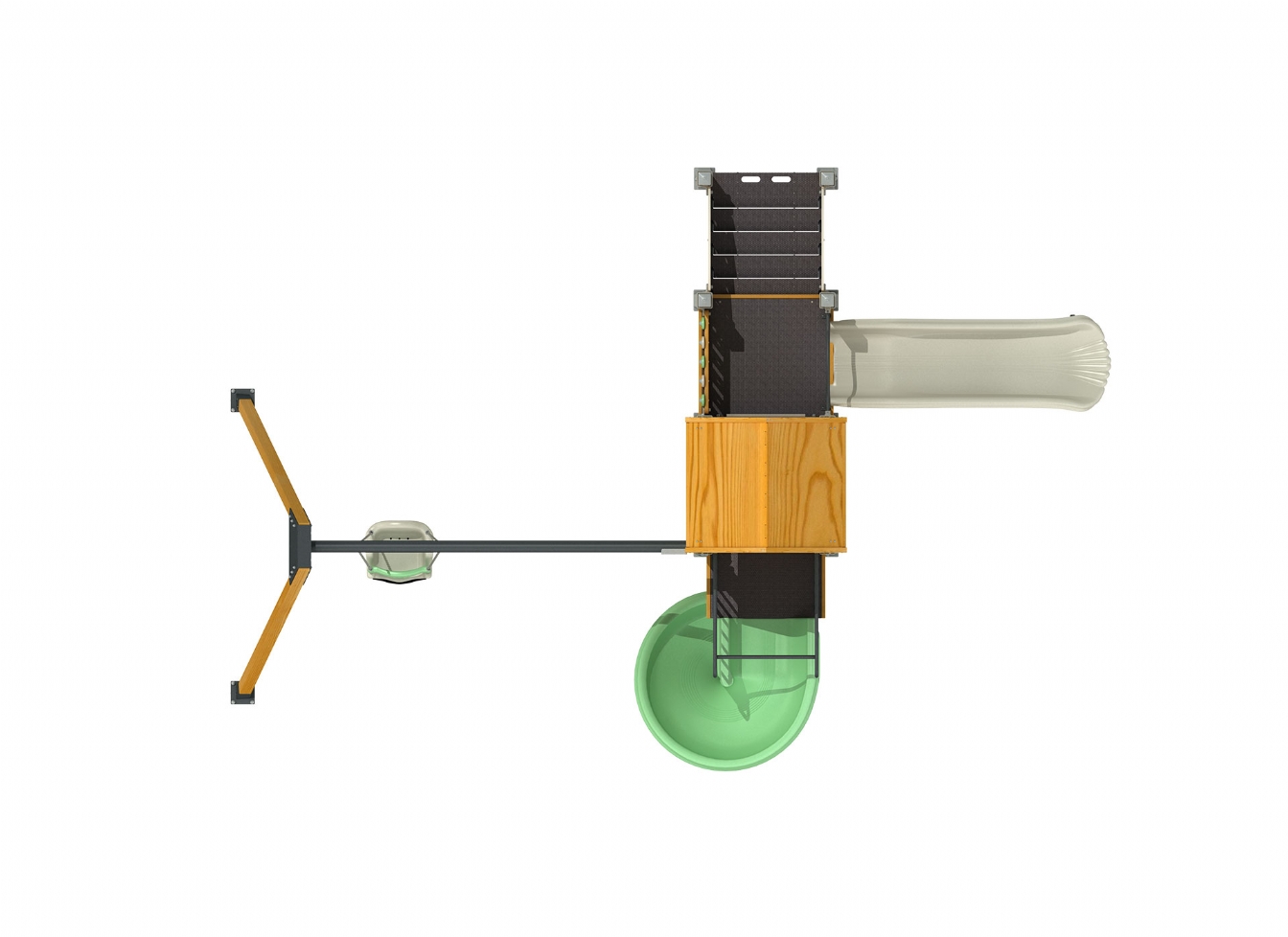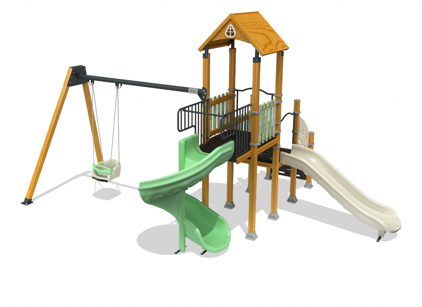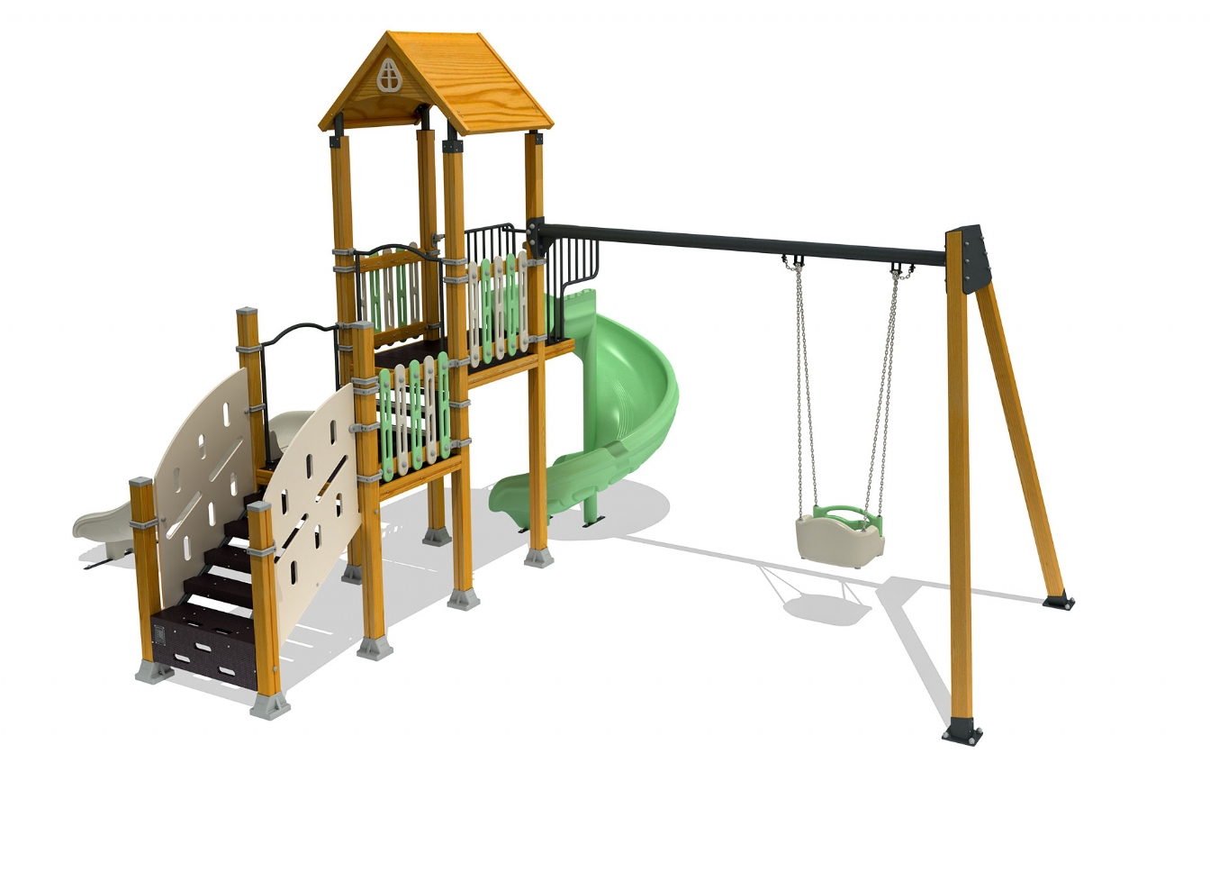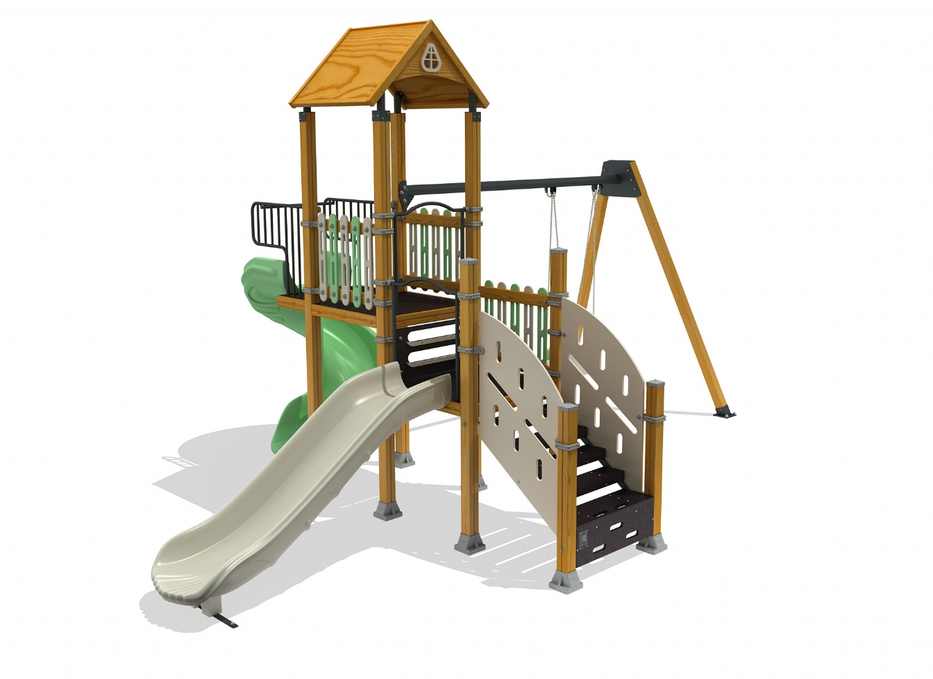 Lekställning Jarar i polyeten, plåt och impregnerad furu för offentlig miljö.