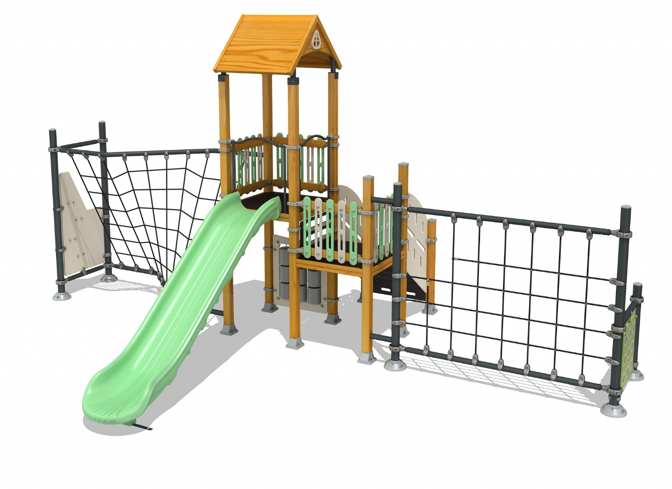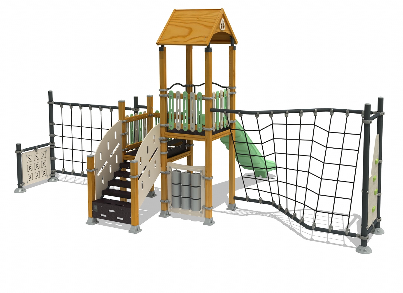 Lekställning Jaren i polyeten, plåt och impregnerad furu för offentlig miljö.