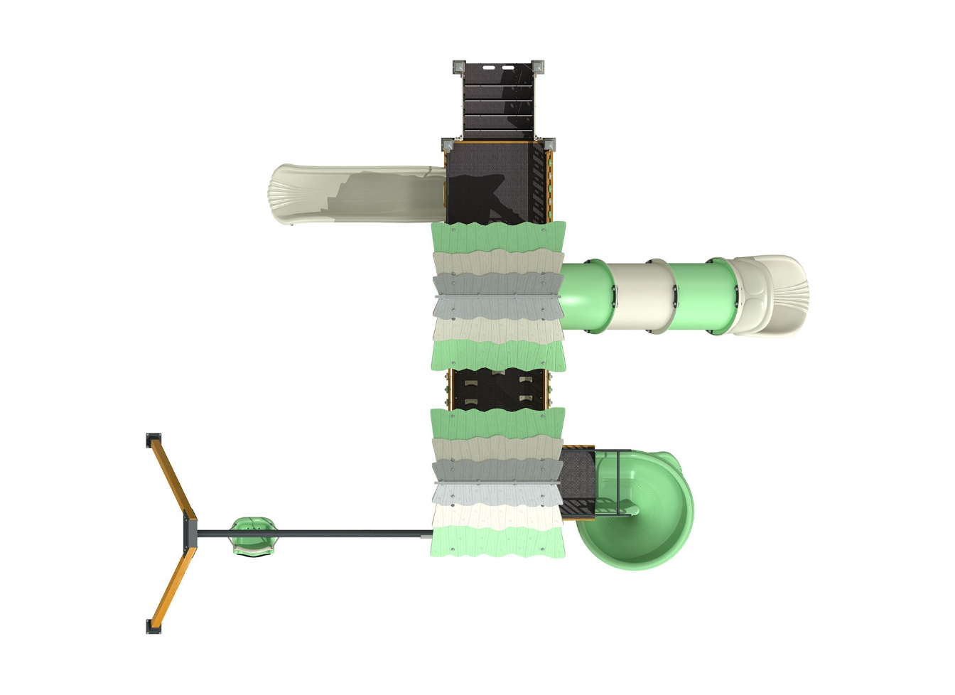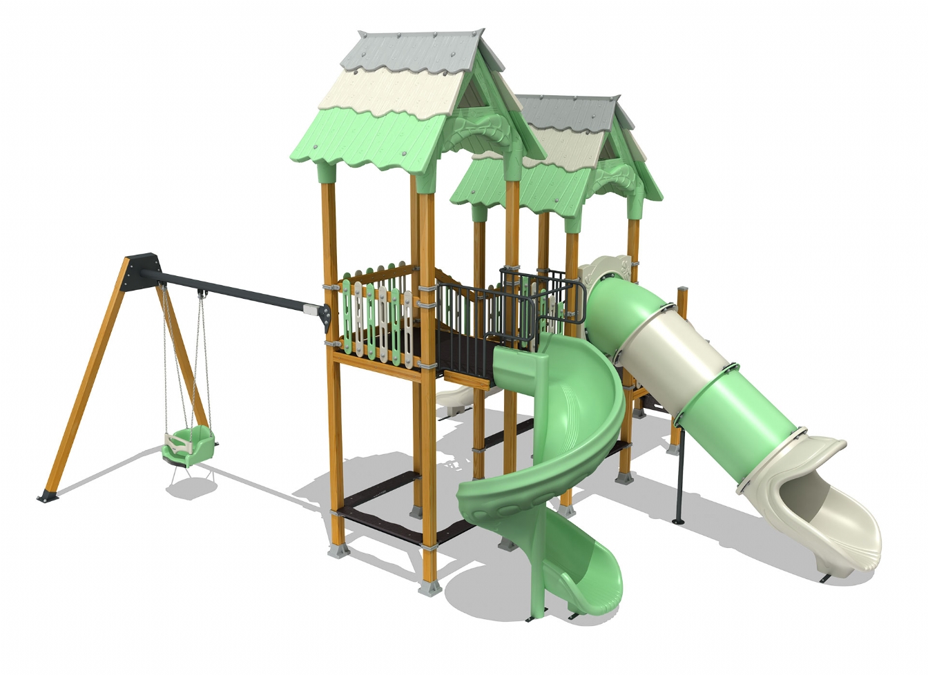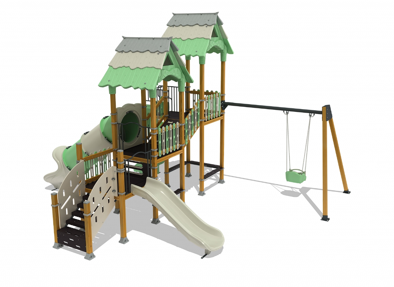 Lekställning Jarena i polyeten, plåt och impregnerad furu för offentlig miljö.