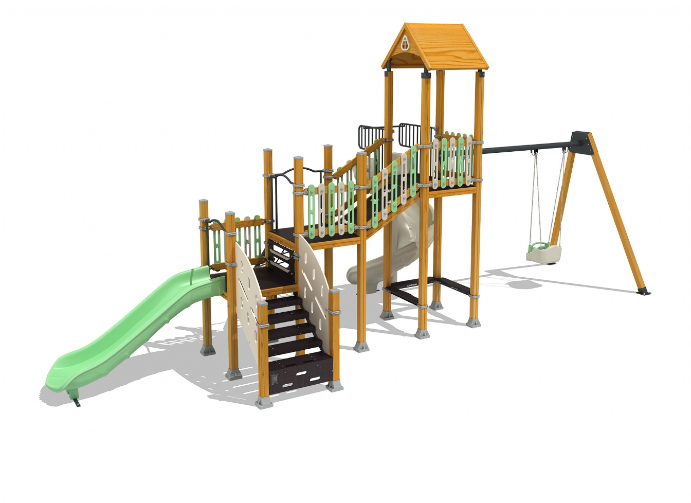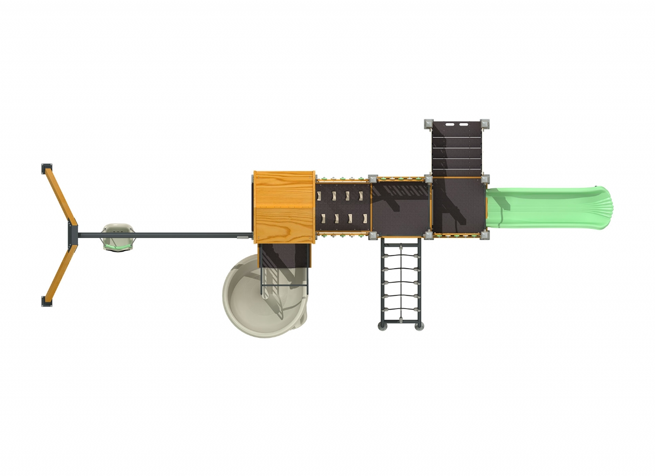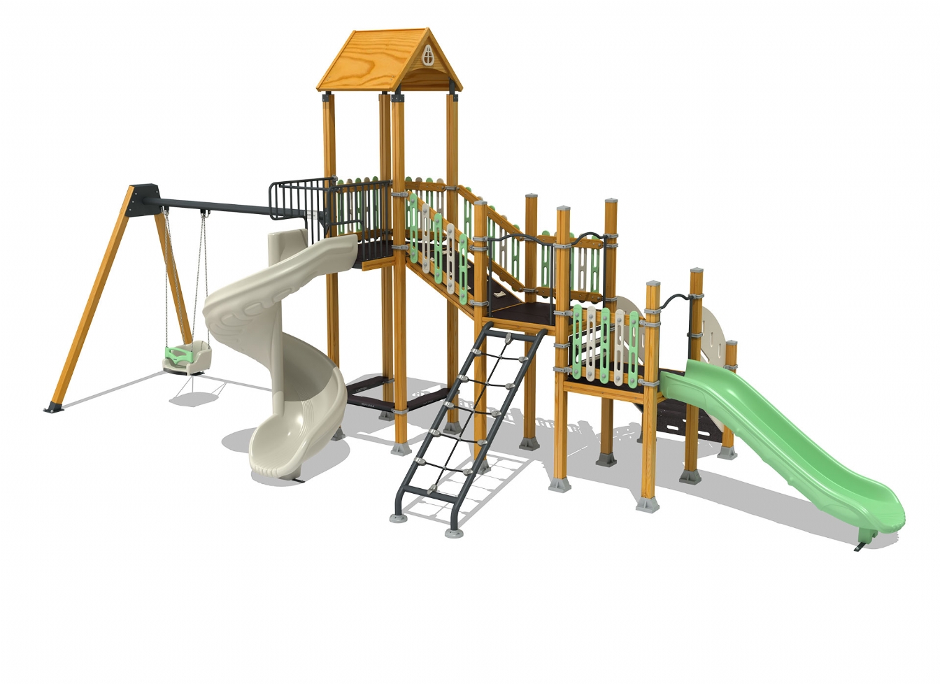 Lekställning Jaria i polyeten, plåt och impregnerad furu för offentlig miljö.