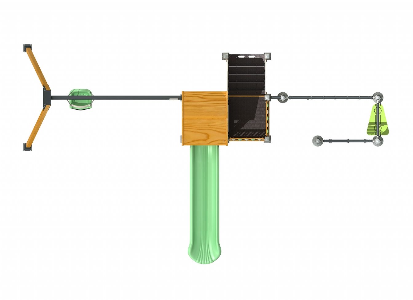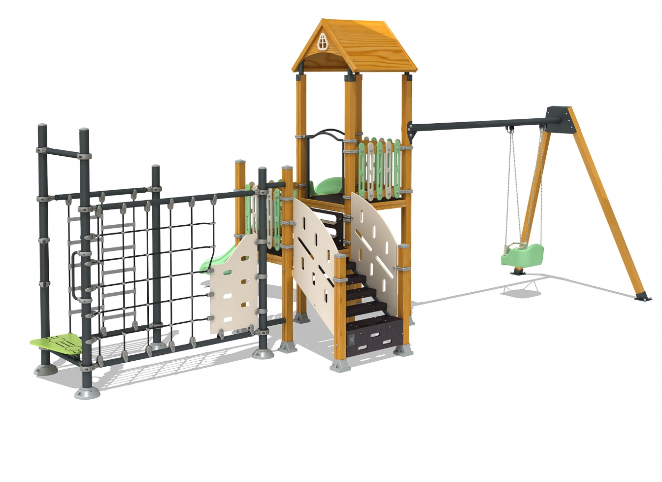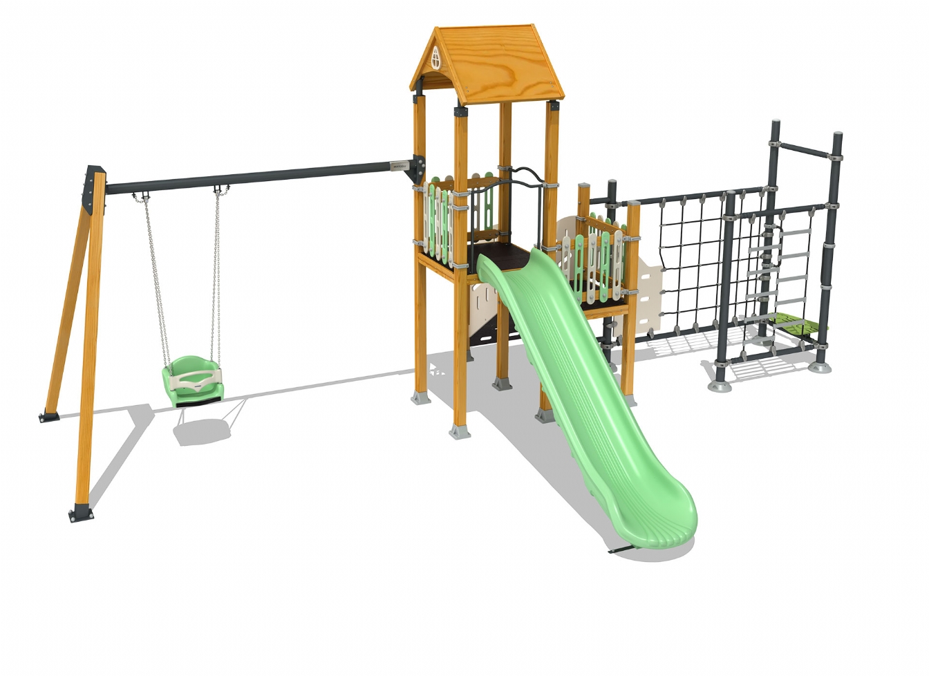 Lekställning Jaril i polyeten, plåt och impregnerad furu för offentlig miljö.