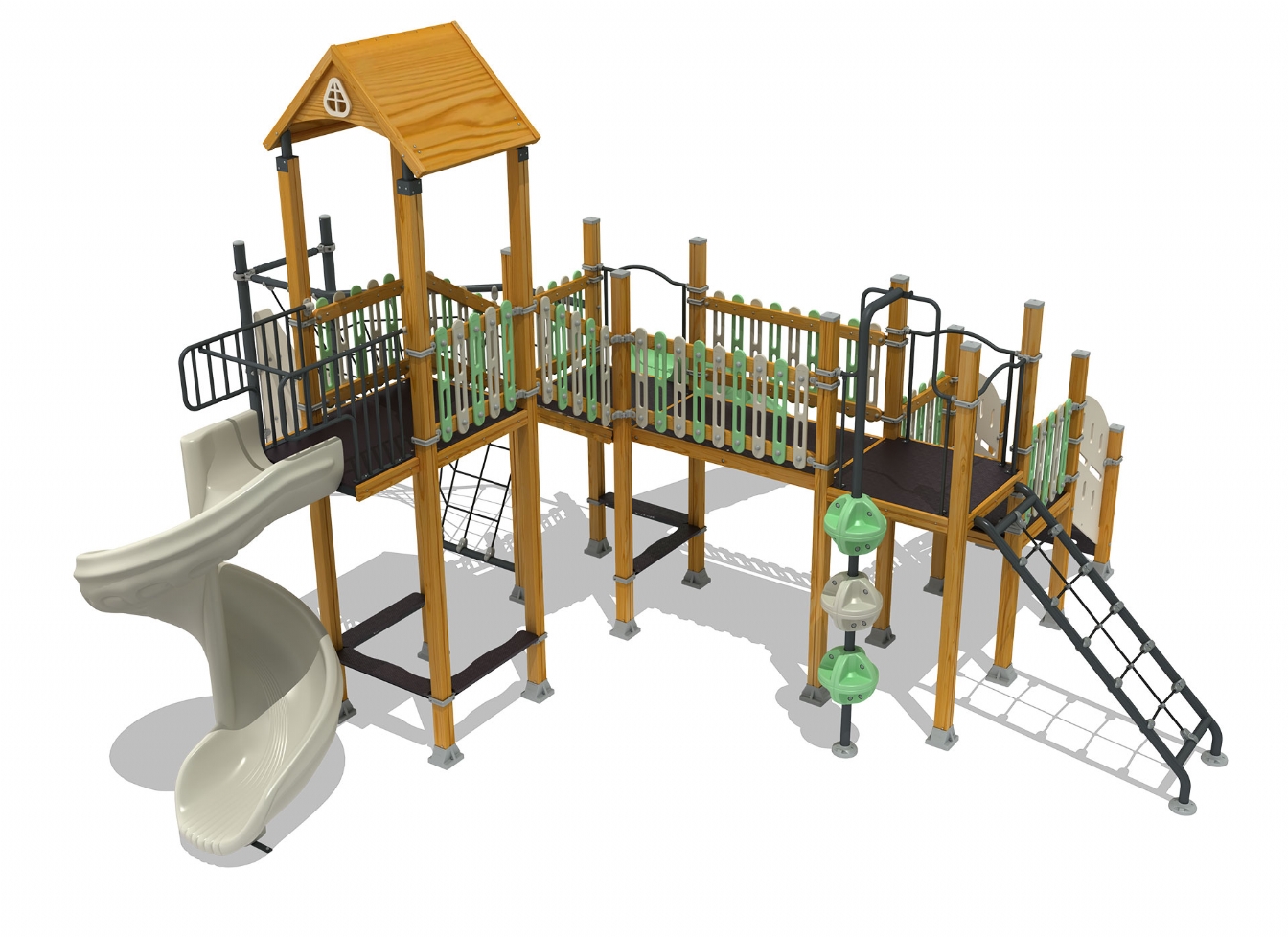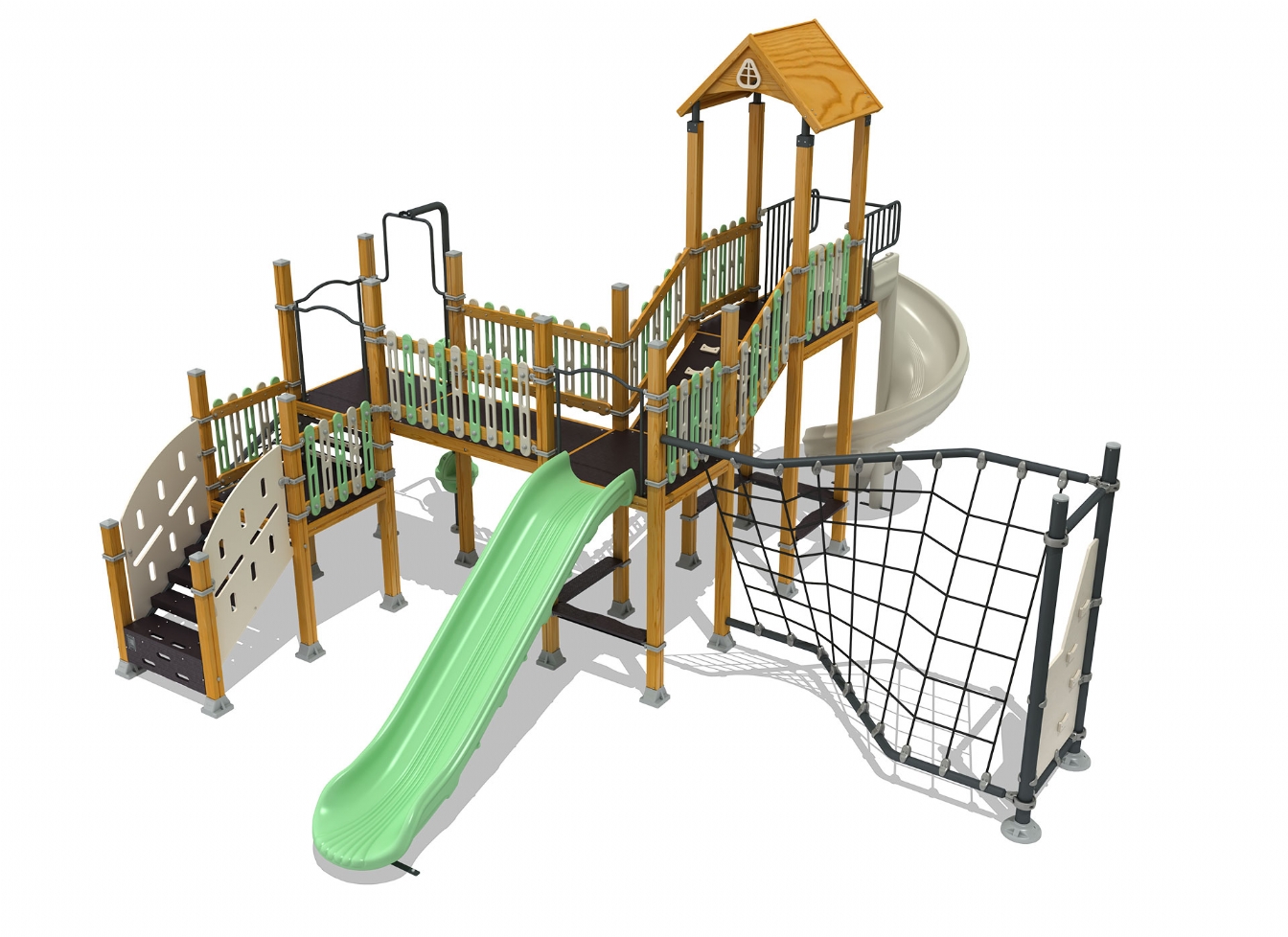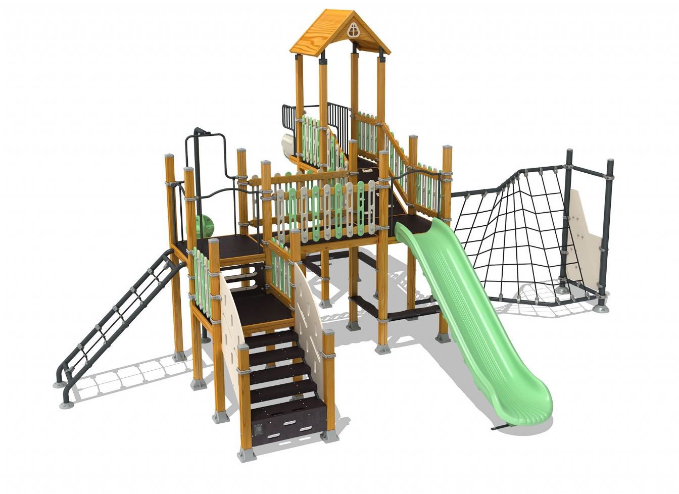 Lekställning Jarin i polyeten, plåt och impregnerad furu för offentlig miljö.