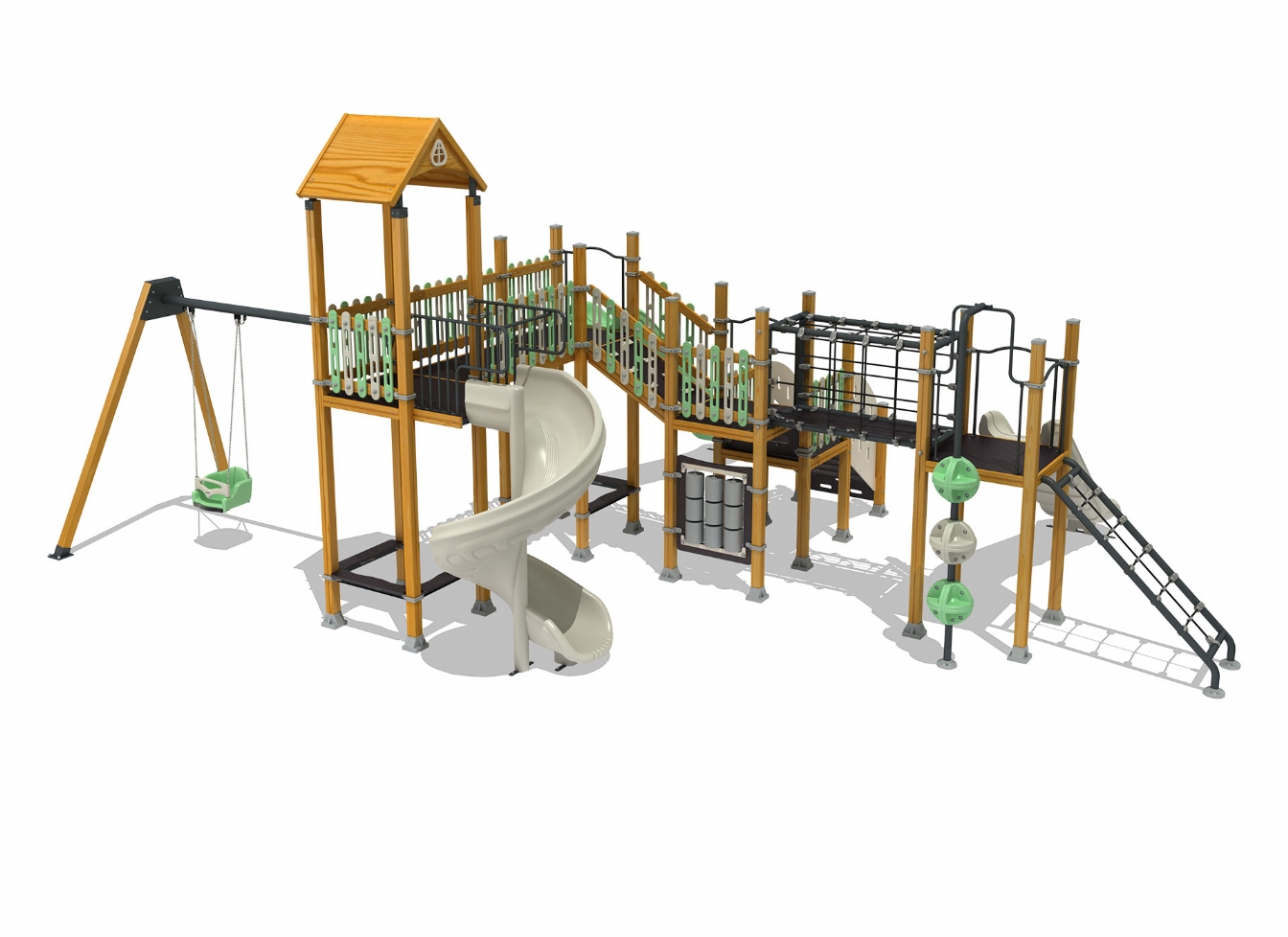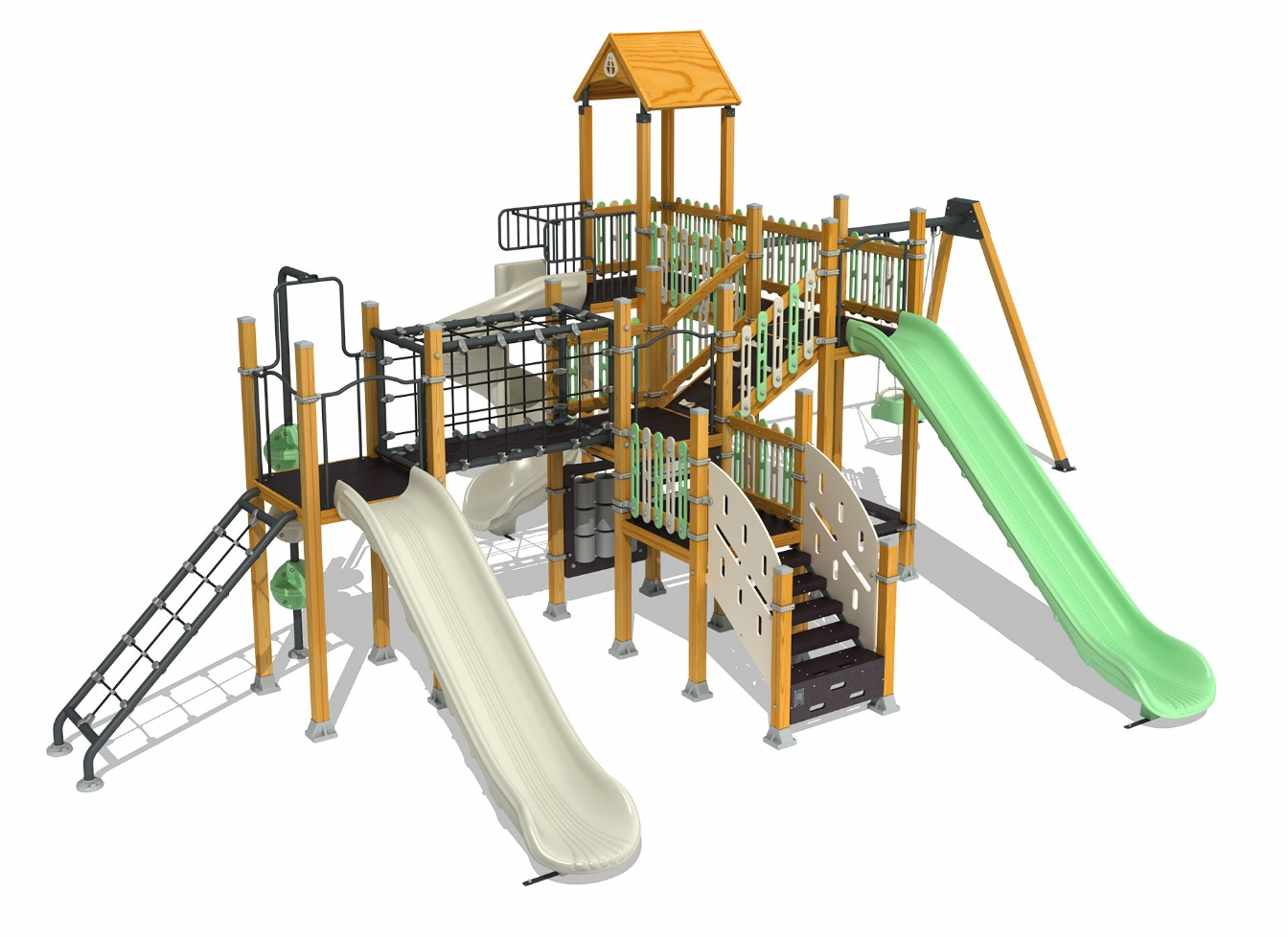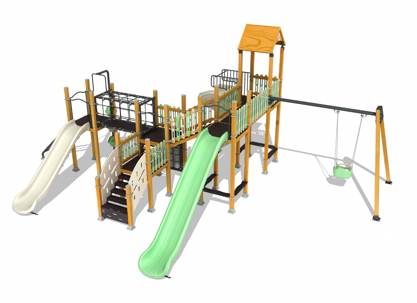 Lekställning Jaris i polyeten, plåt och impregnerad furu för offentlig miljö.