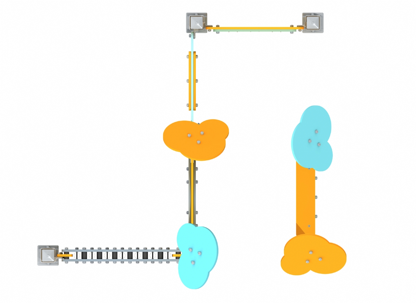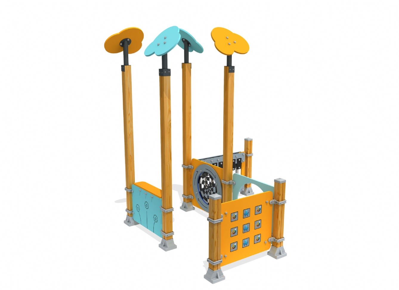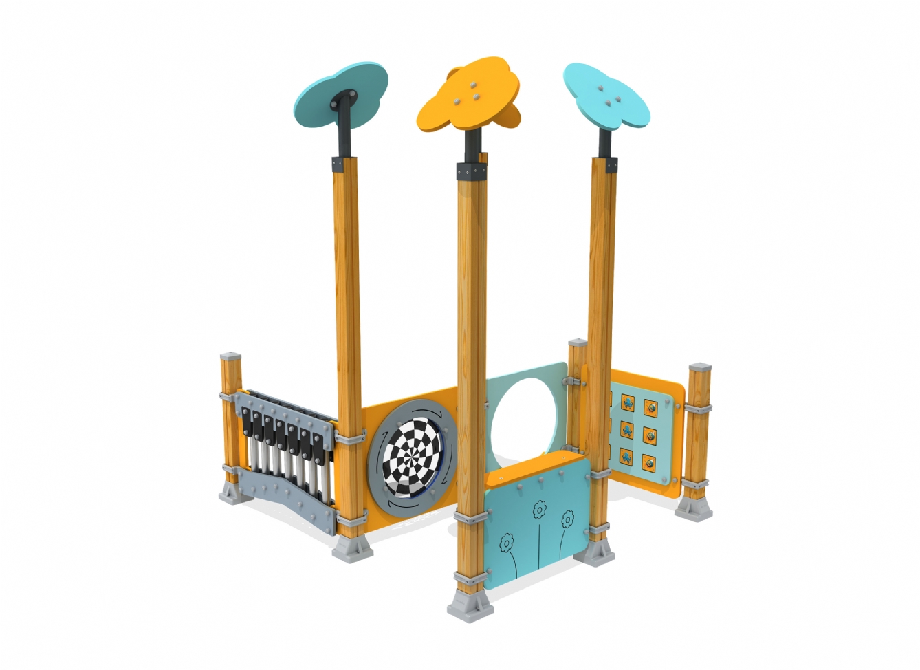 Lekställning Jarora i polyeten, plåt och impregnerad furu för offentlig miljö.