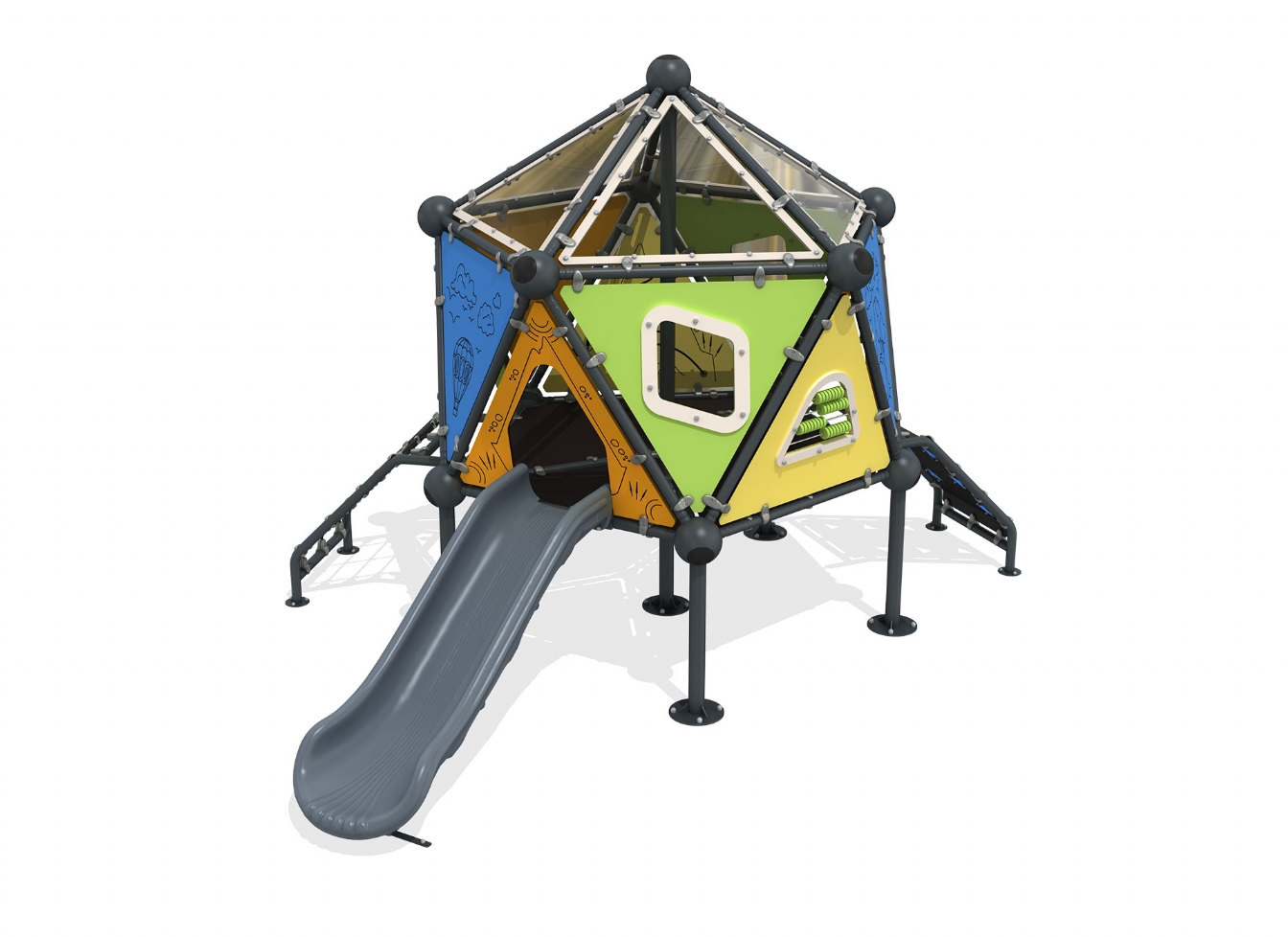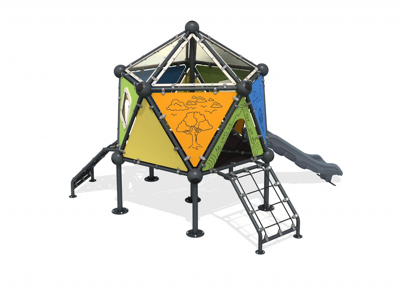 Lekställning Jaruno är utvecklad för lekplatser, skolor, förskolor och andra offentliga utemiljöer. Produkten har bredd 472 cm, djup 448 cm och höjd 337 cm. Specifikationen omfattar säkerhetszon L 781 x W 740 samt rutschhöjd 100 cm. Utförandet i stålvajer och metallprofil ger en tålig konstruktion som lämpar sig för återkommande användning i krävande miljöer. Den är anpassad för upp till 10 barn och rekommenderad ålder 5-12.