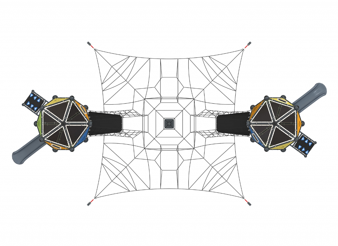 Lekställning Kelu i stålvajer och metallprofil för offentlig miljö.