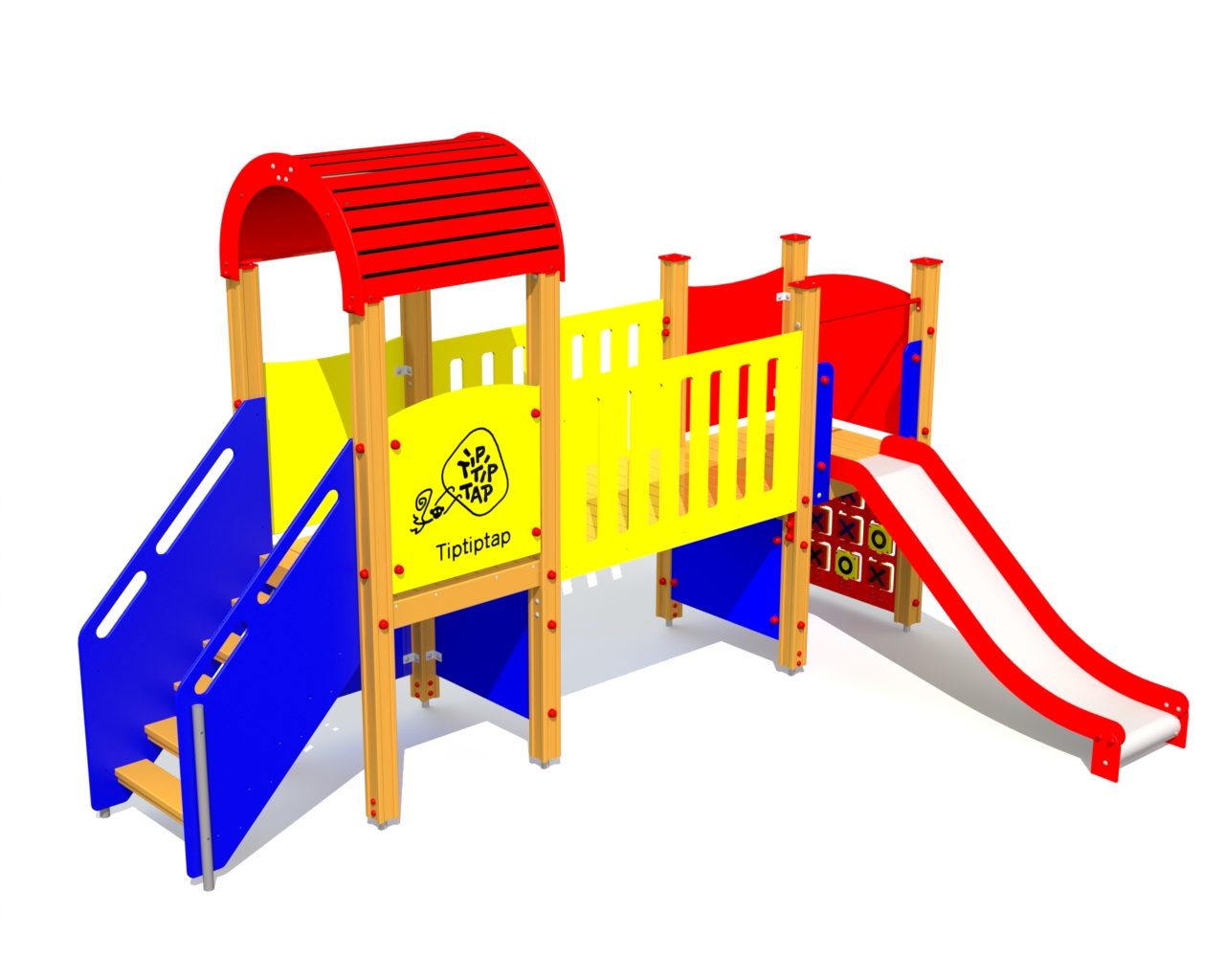 Lekcenter med lång bro, rutschkana och flera aktivitetsväggar som uppmuntrar både rörelselek och kreativt utforskande. Konstruktionen ger barn möjlighet att balansera, klättra och leka tillsammans i en trygg och varierad miljö.