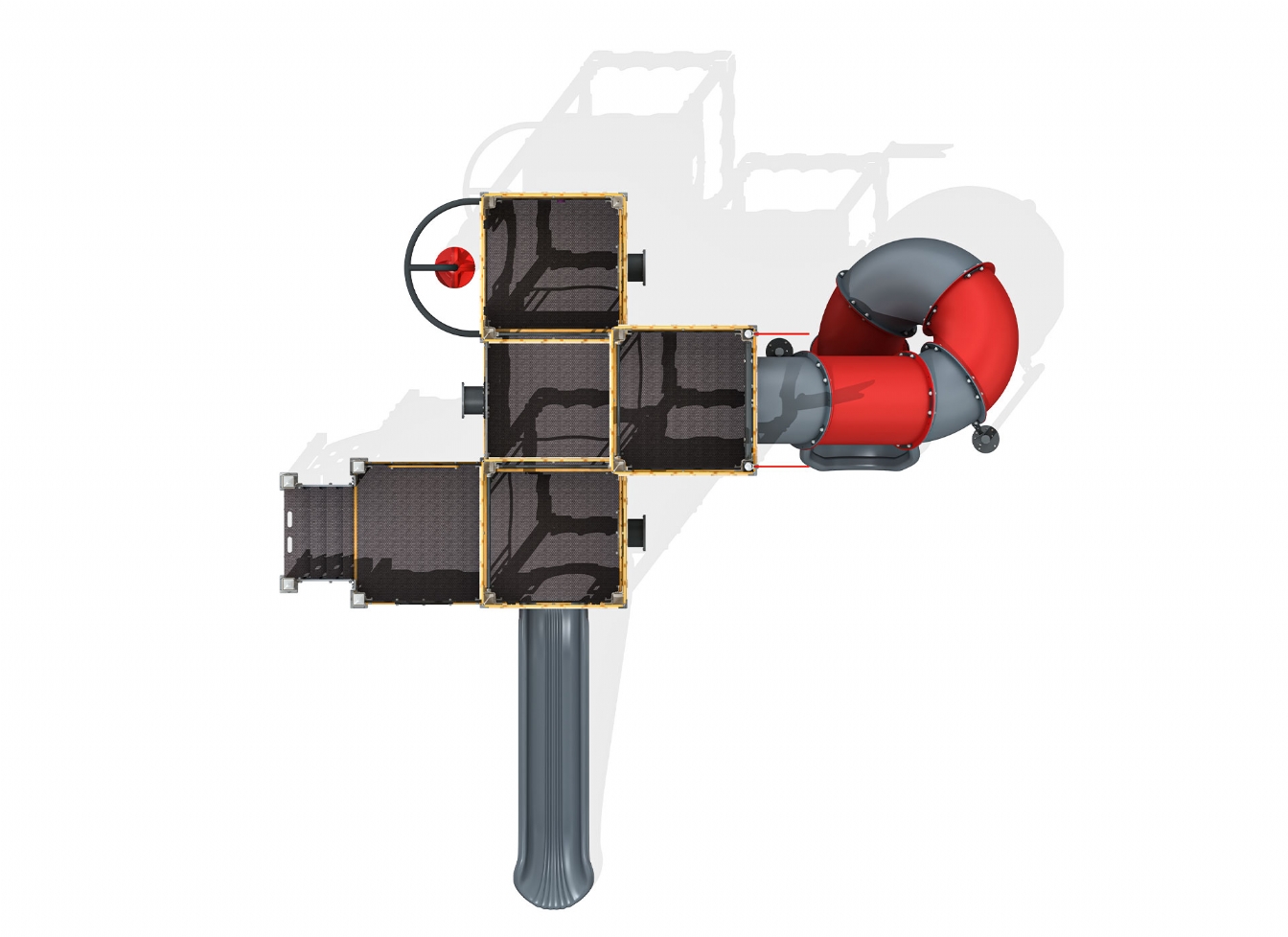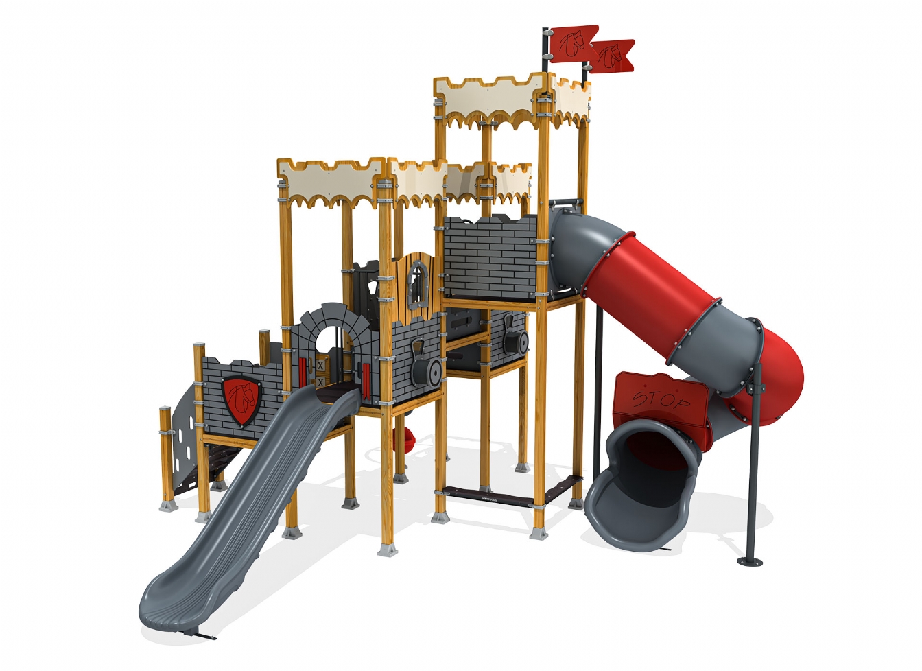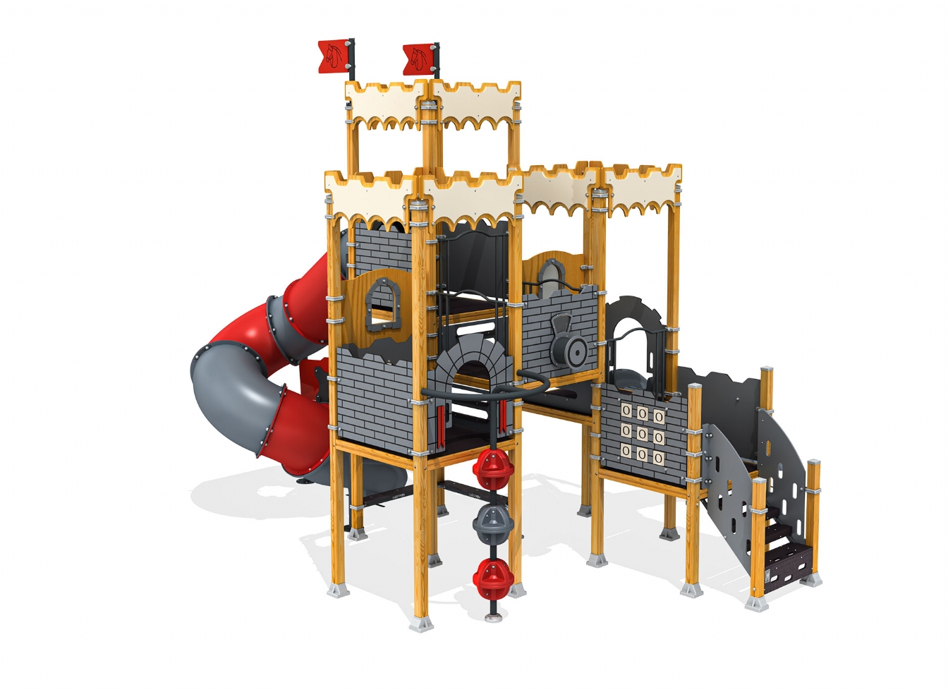 Lekställning Lorar är utvecklad för lekplatser, skolor, förskolor och andra offentliga utemiljöer. Produkten har bredd 697 cm, djup 616 cm och höjd 527 cm. Specifikationen omfattar säkerhetszon L 965 x W 949 samt rutschhöjd 150 cm. Utförandet i metallprofil, polykarbonat och marinplywood ger en tålig konstruktion som lämpar sig för återkommande användning i krävande miljöer. Den är anpassad för upp till 28 barn och rekommenderad ålder 3-12.