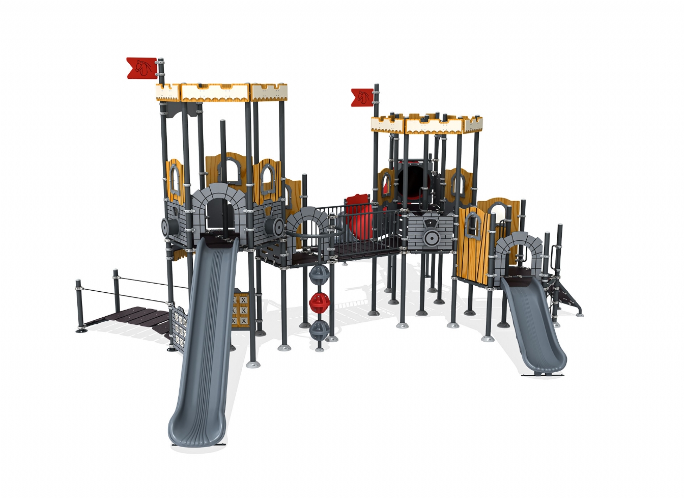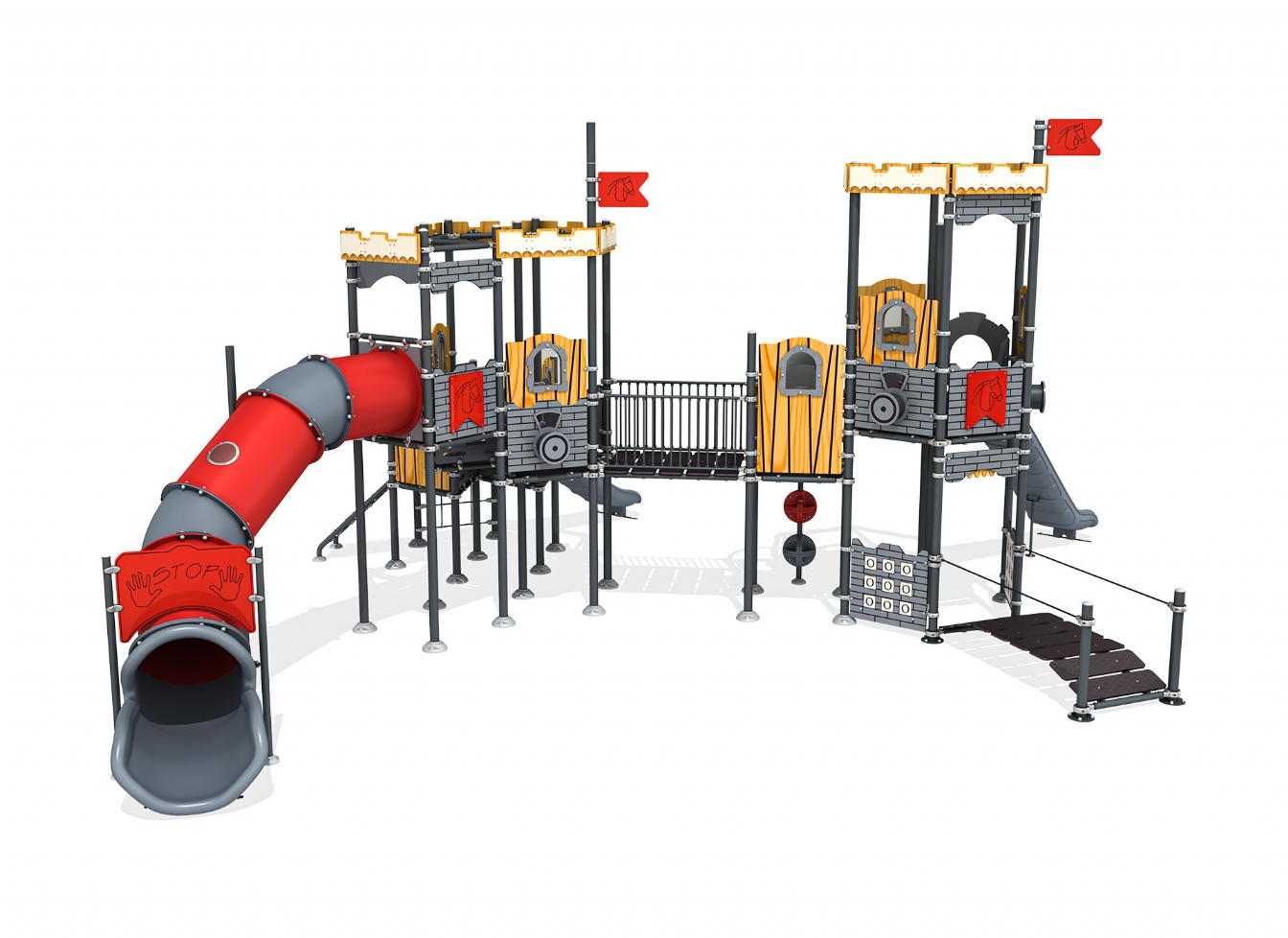 Lekställning Loro är utvecklad för lekplatser, skolor, förskolor och andra offentliga utemiljöer. Produkten har bredd 987 cm, djup 962 cm och höjd 503 cm. Specifikationen omfattar säkerhetszon L 1381 x W 1273 samt rutschhöjd 100. Utförandet i metallprofil, polykarbonat och marinplywood ger en tålig konstruktion som lämpar sig för återkommande användning i krävande miljöer. Den är anpassad för upp till 37 barn och rekommenderad ålder 3-12.
