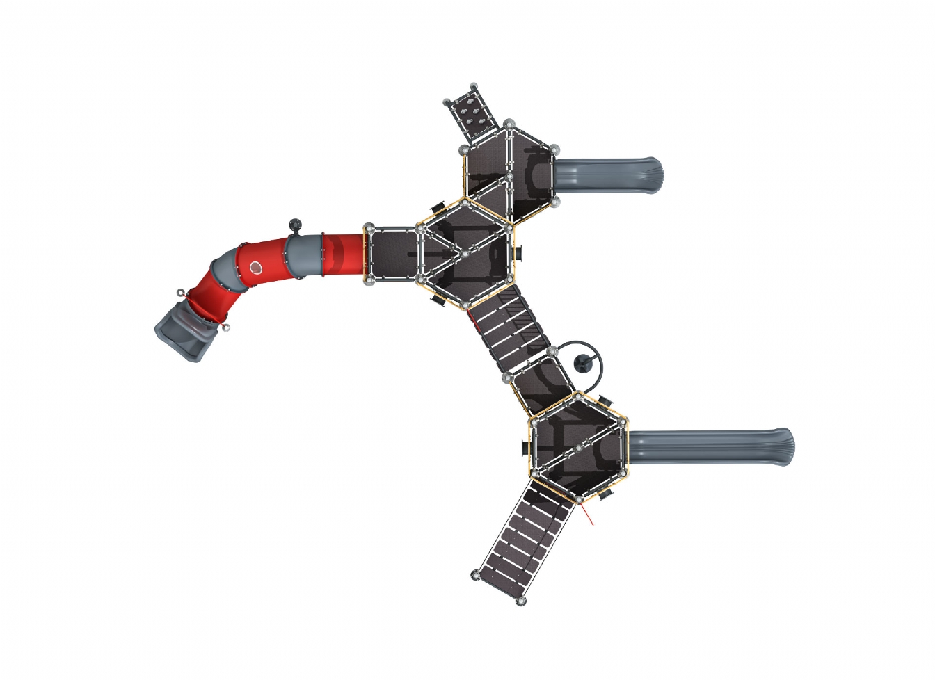 Lekställning Loro i metallprofil, polykarbonat och marinplywood för offentlig miljö.