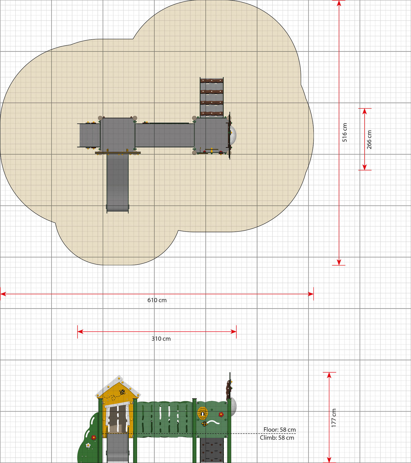 Lekställning Mapor är utvecklad för lekplatser där barn behöver varierade utmaningar i samma produkt. Den kombinerar lekvärde med robust konstruktion och uppmuntrar till klättring, balans och social lek. Produkten passar väl i förskola, skola och parkmiljö där hög användning ställer krav på kvalitet och driftsäkerhet. Mått (L x B x H): 310 cm x 266 cm x 177 cm. Max fallhöjd: 58 cm. Rekommenderad ålder: Från 0 år.