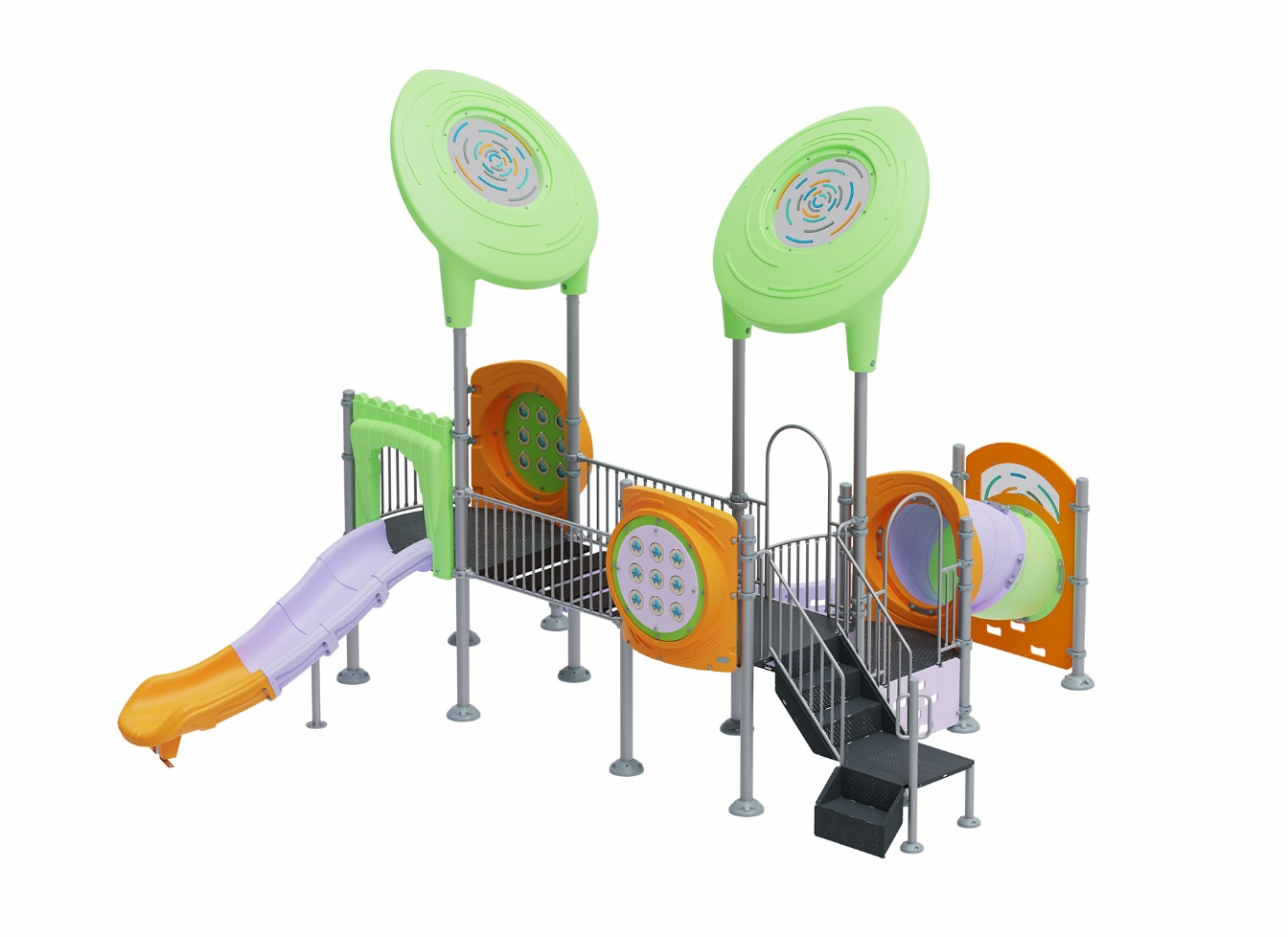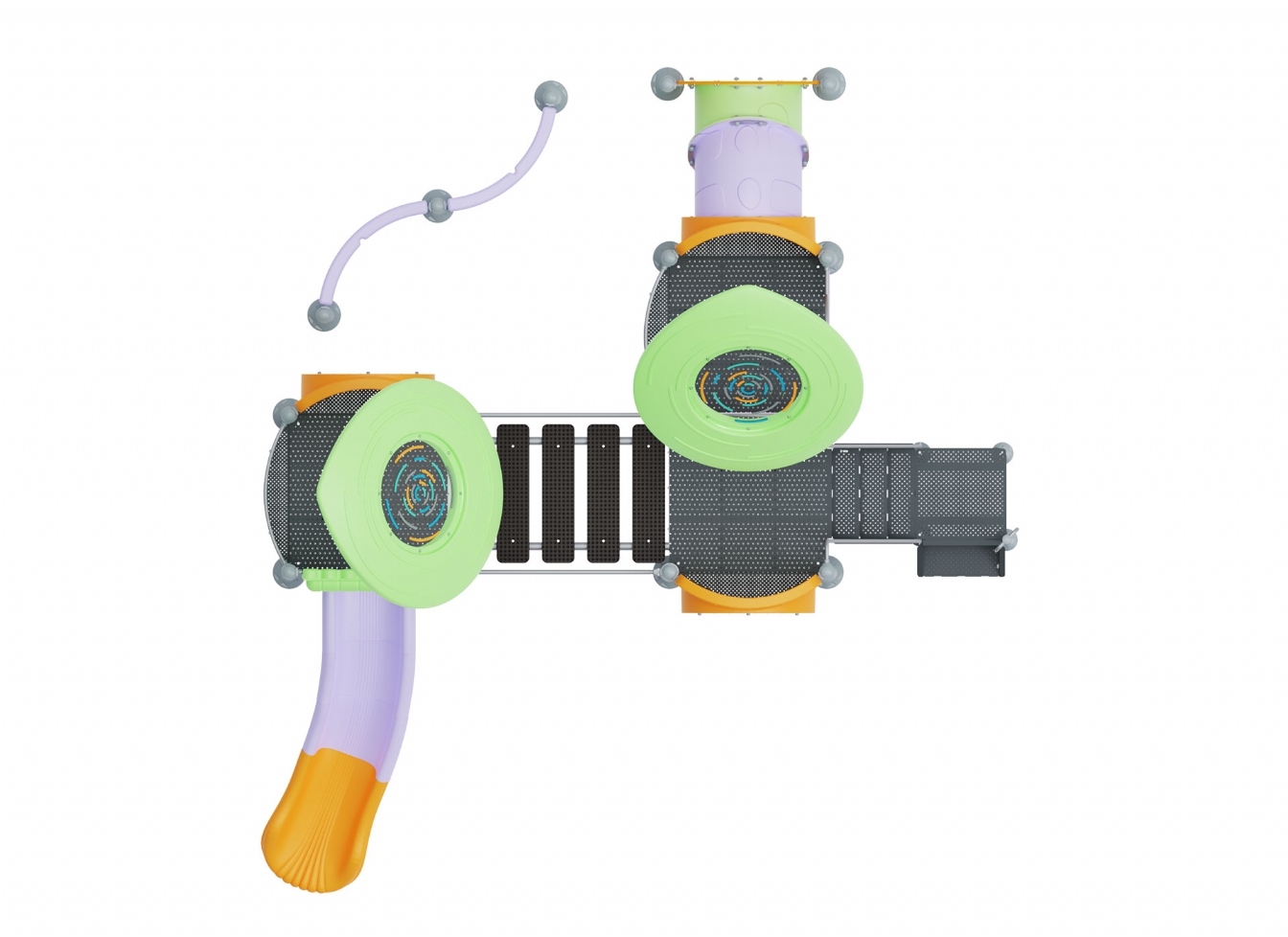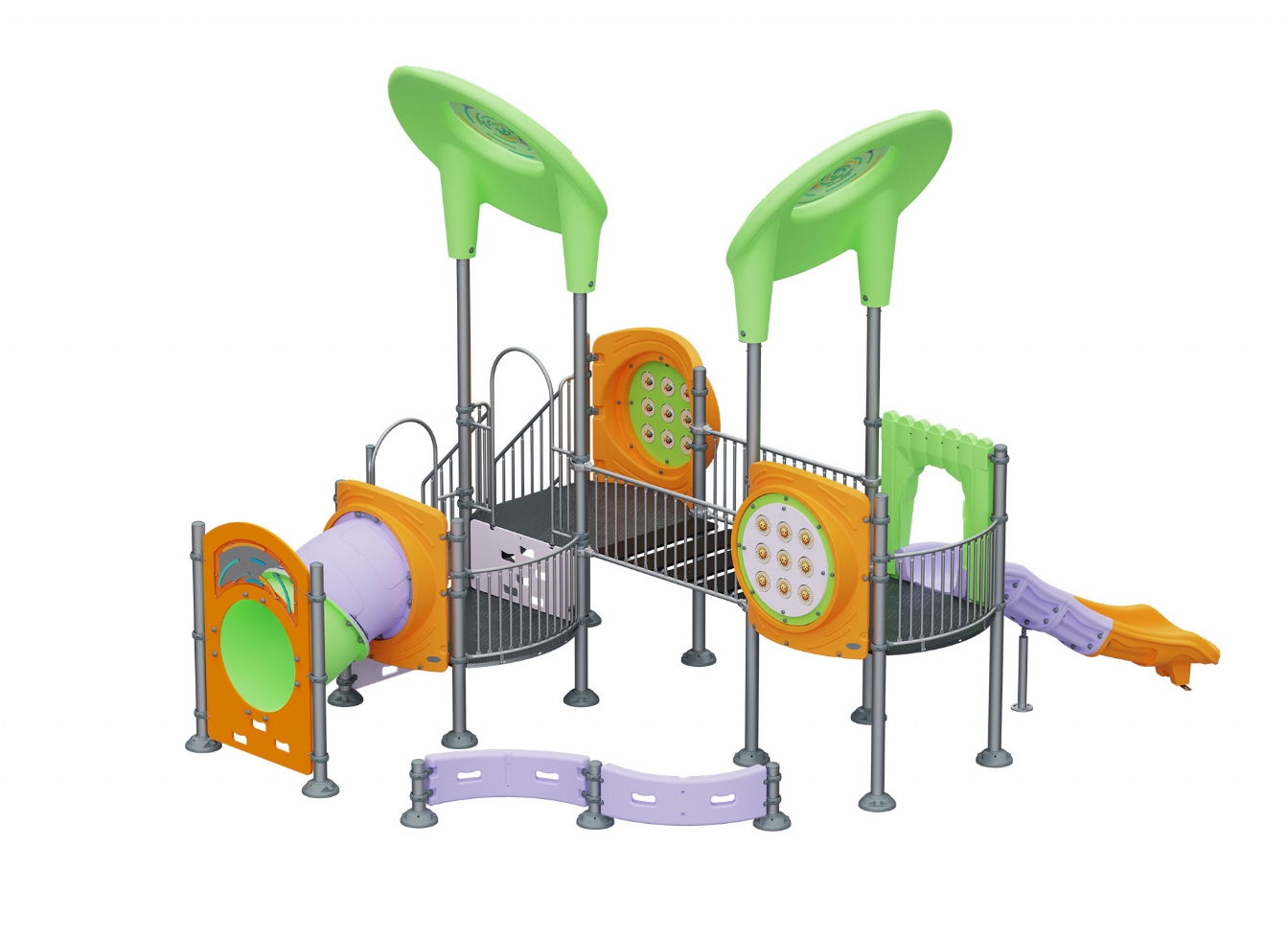 Lekställning Marari i metallprofil, polykarbonat och marinplywood för offentlig miljö.