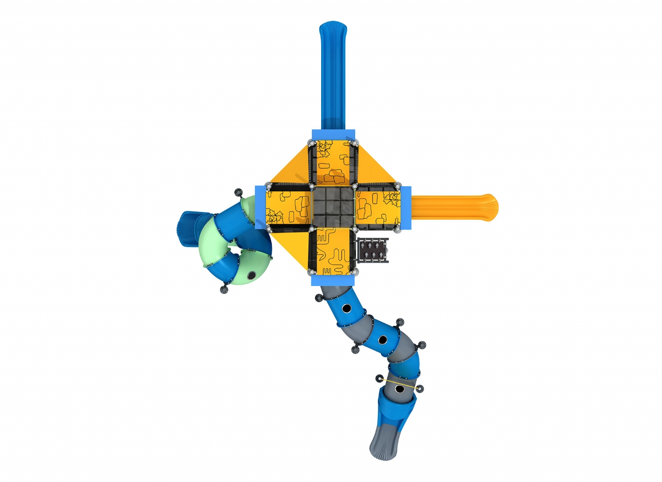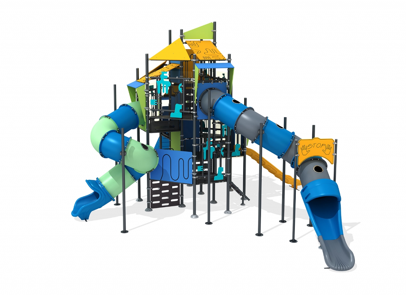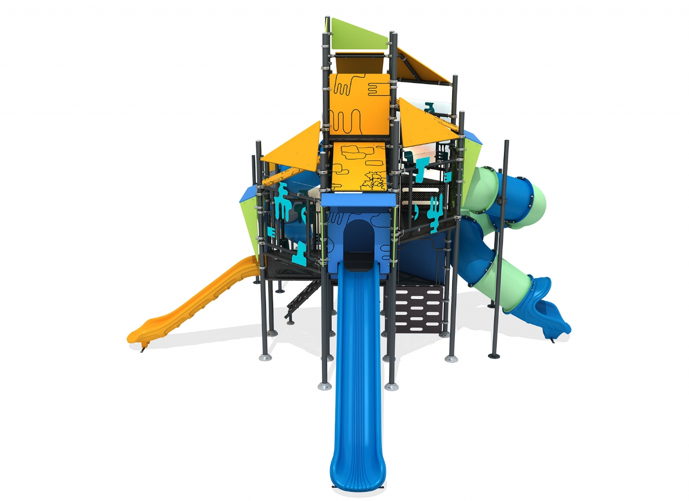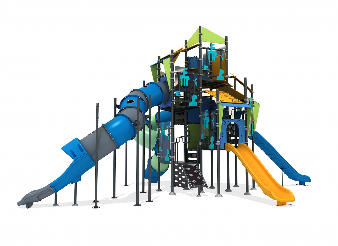 Lekställning Marela i metallprofil, polykarbonat och marinplywood för offentlig miljö.
