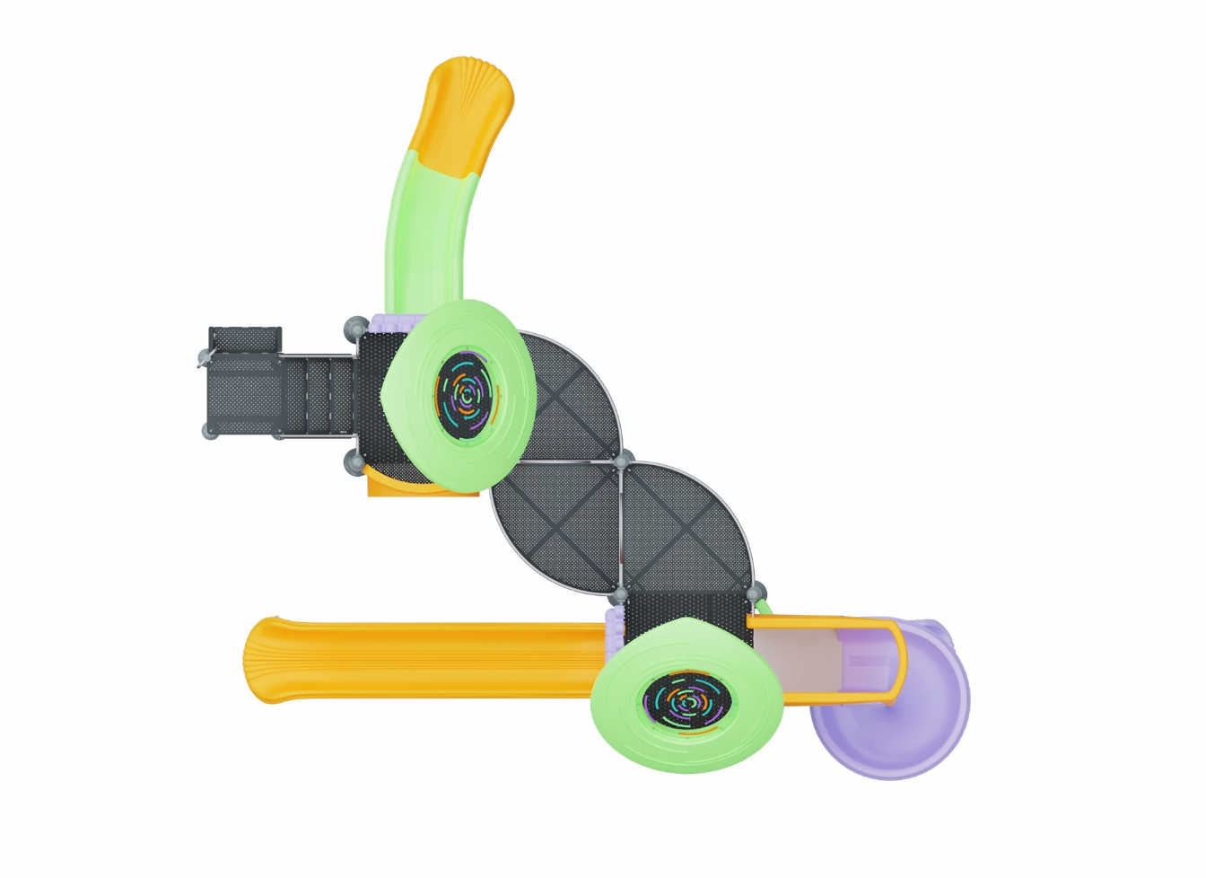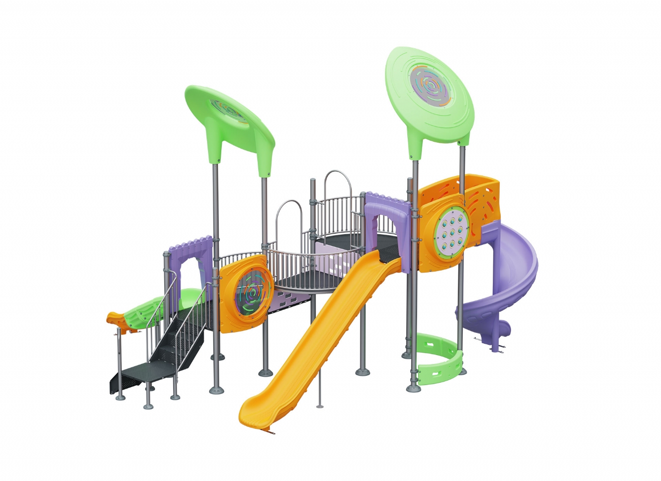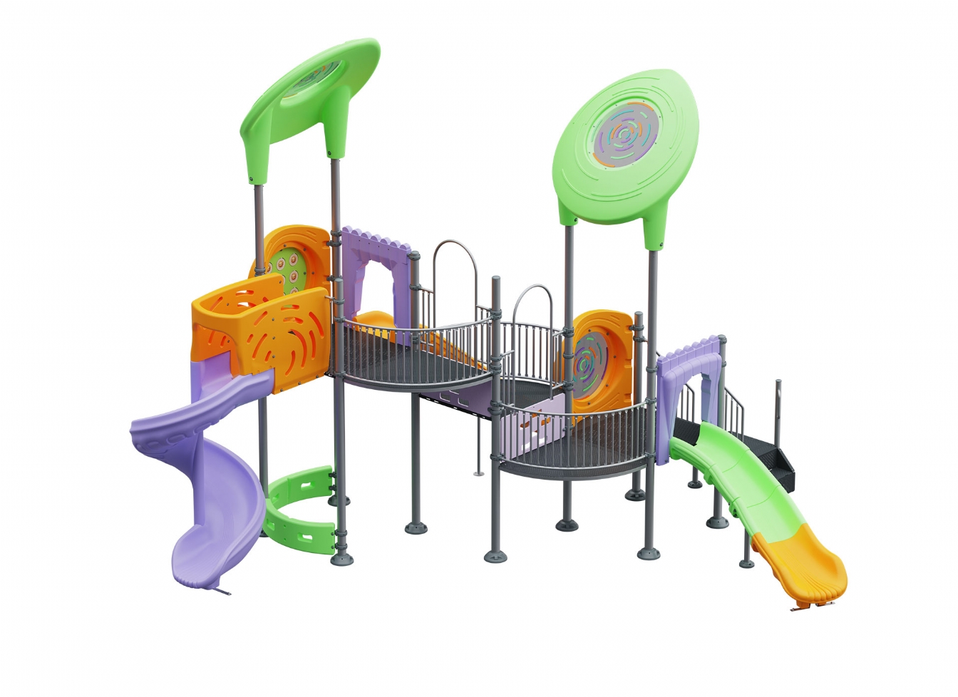 Lekställning Mareno i metallprofil, polykarbonat och marinplywood för offentlig miljö.