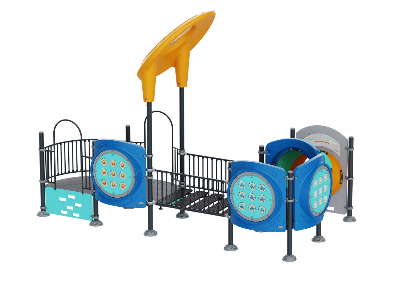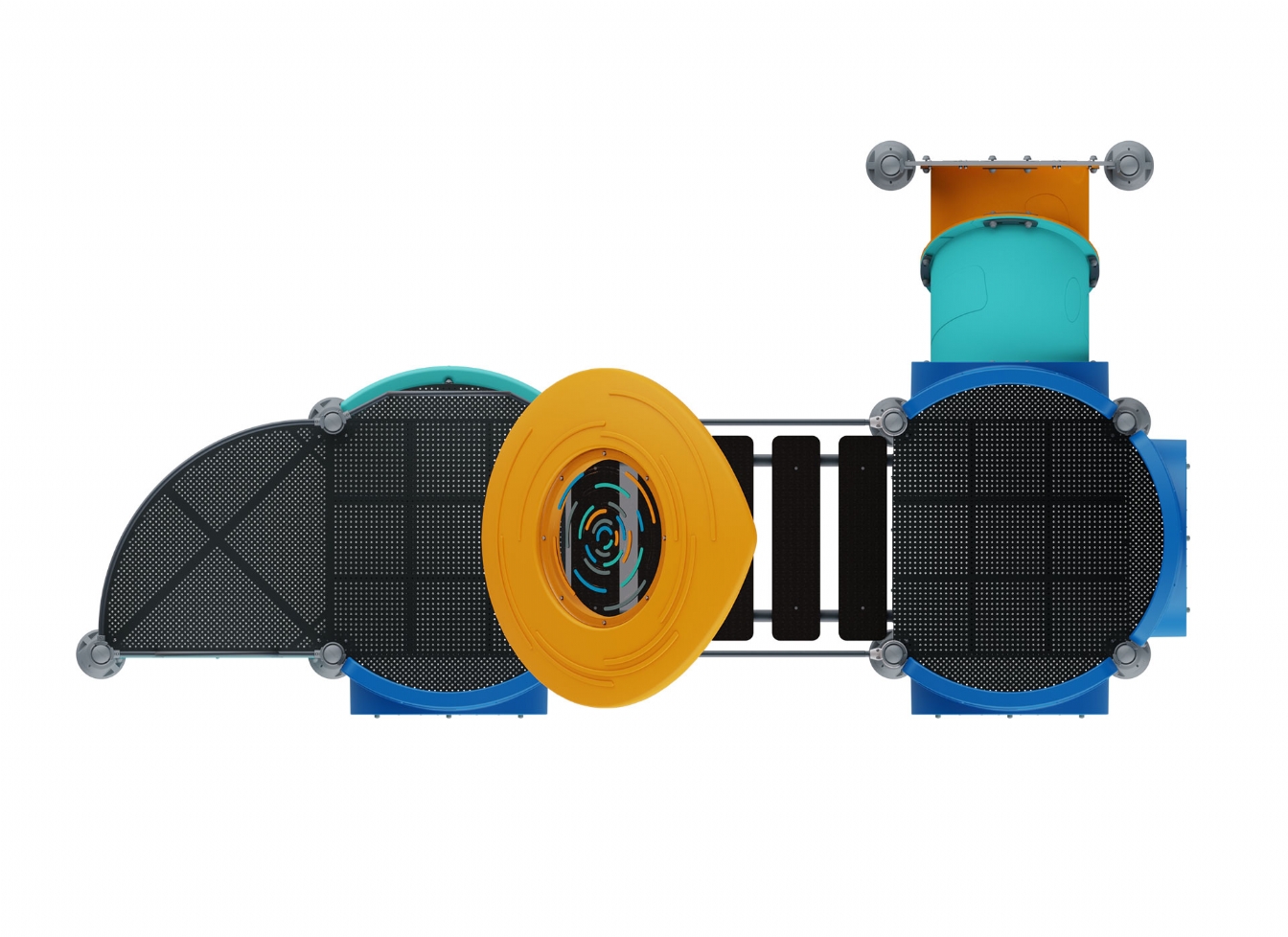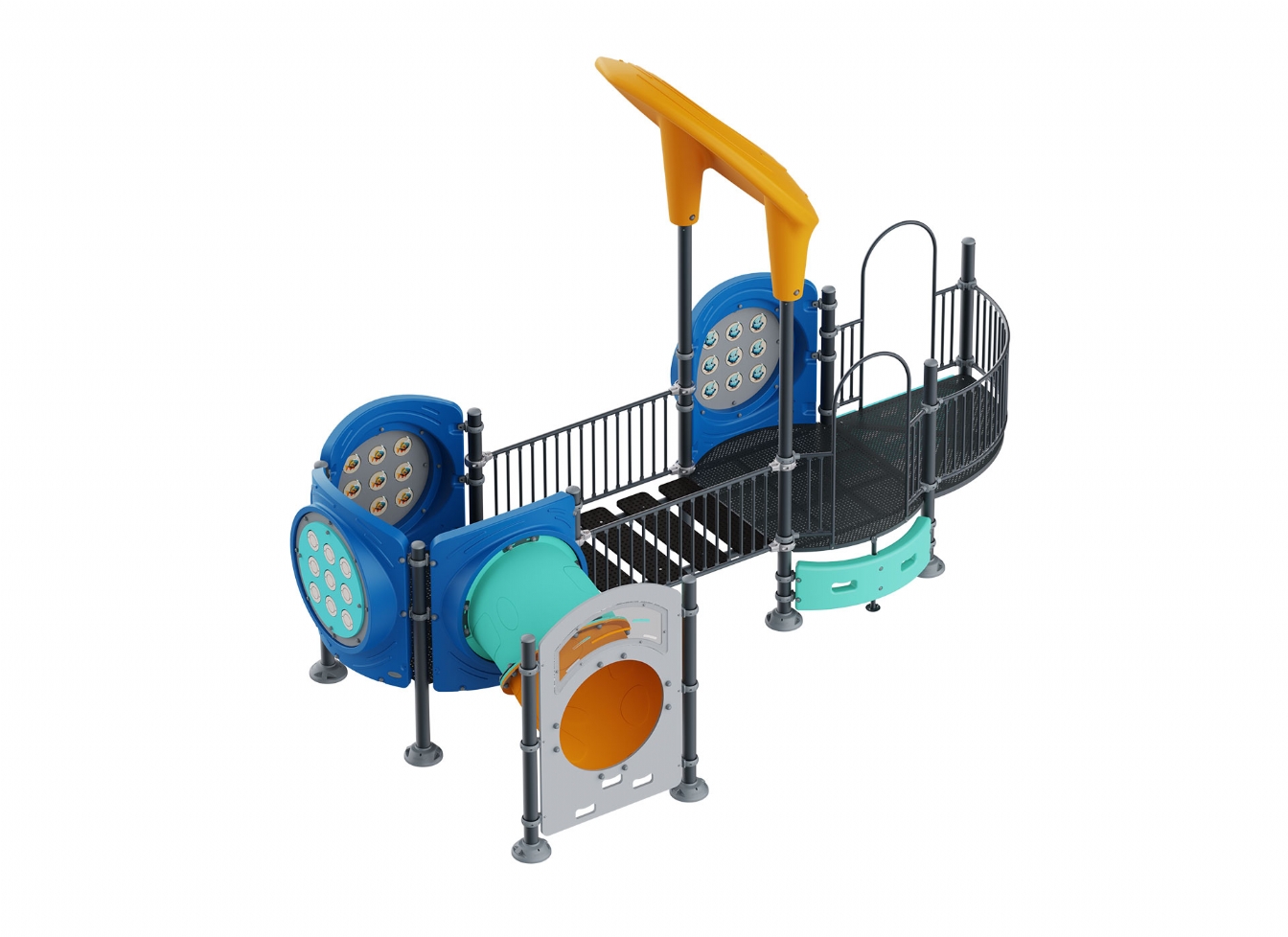 Lekställning Marilo i metallprofil, polykarbonat och marinplywood för offentlig miljö.