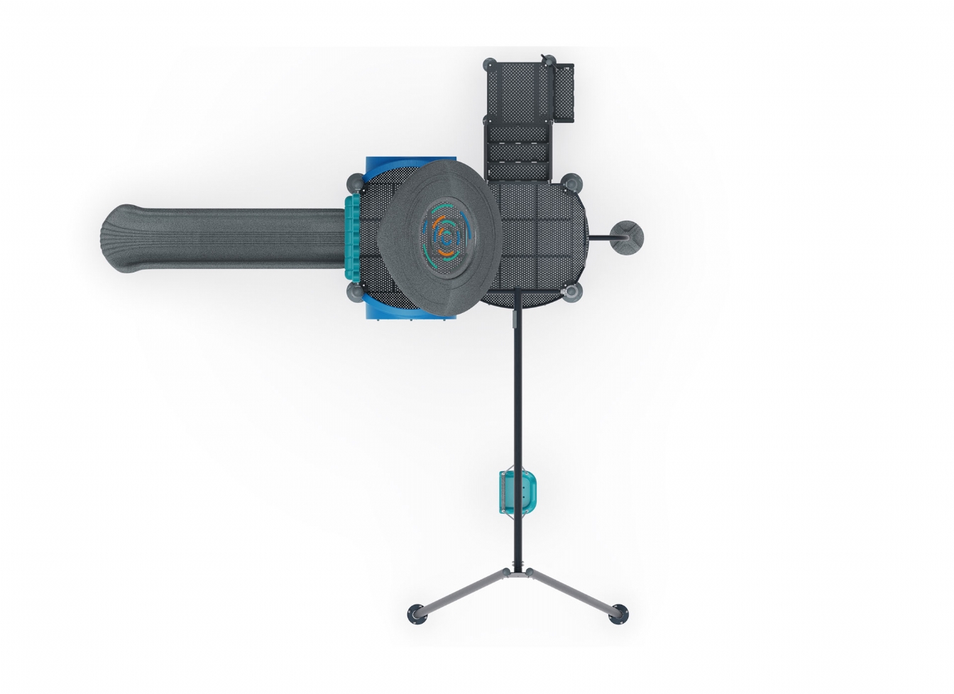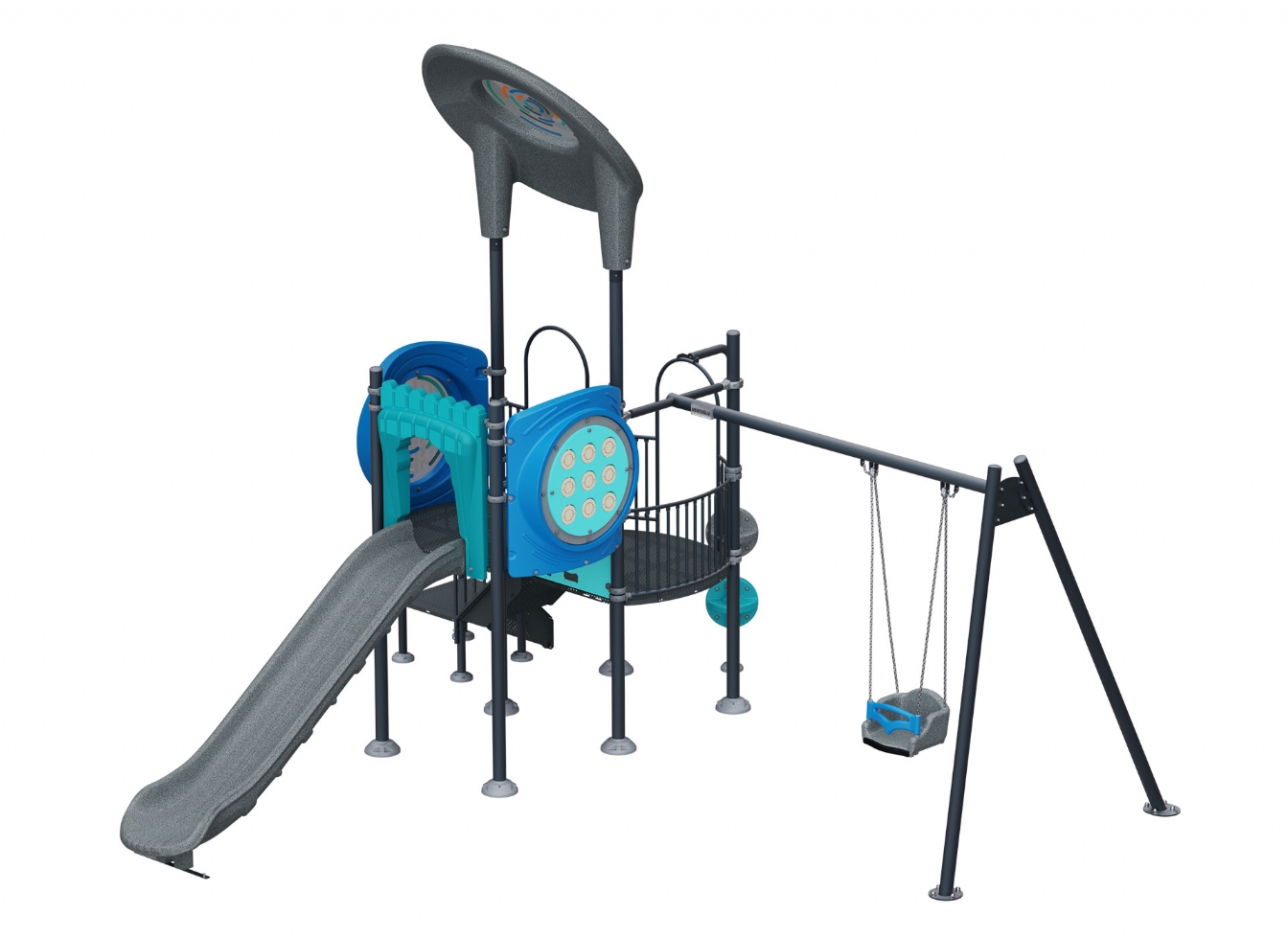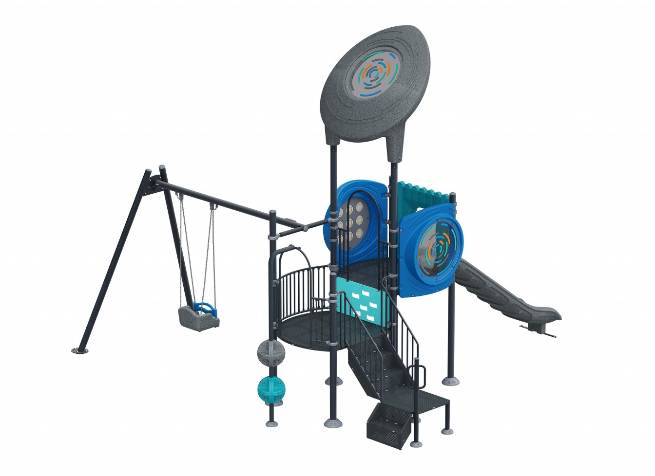 Lekställning Marira i metallprofil, polykarbonat och marinplywood för offentlig miljö.