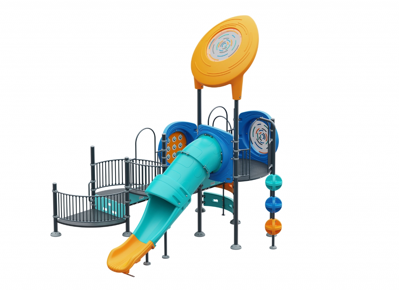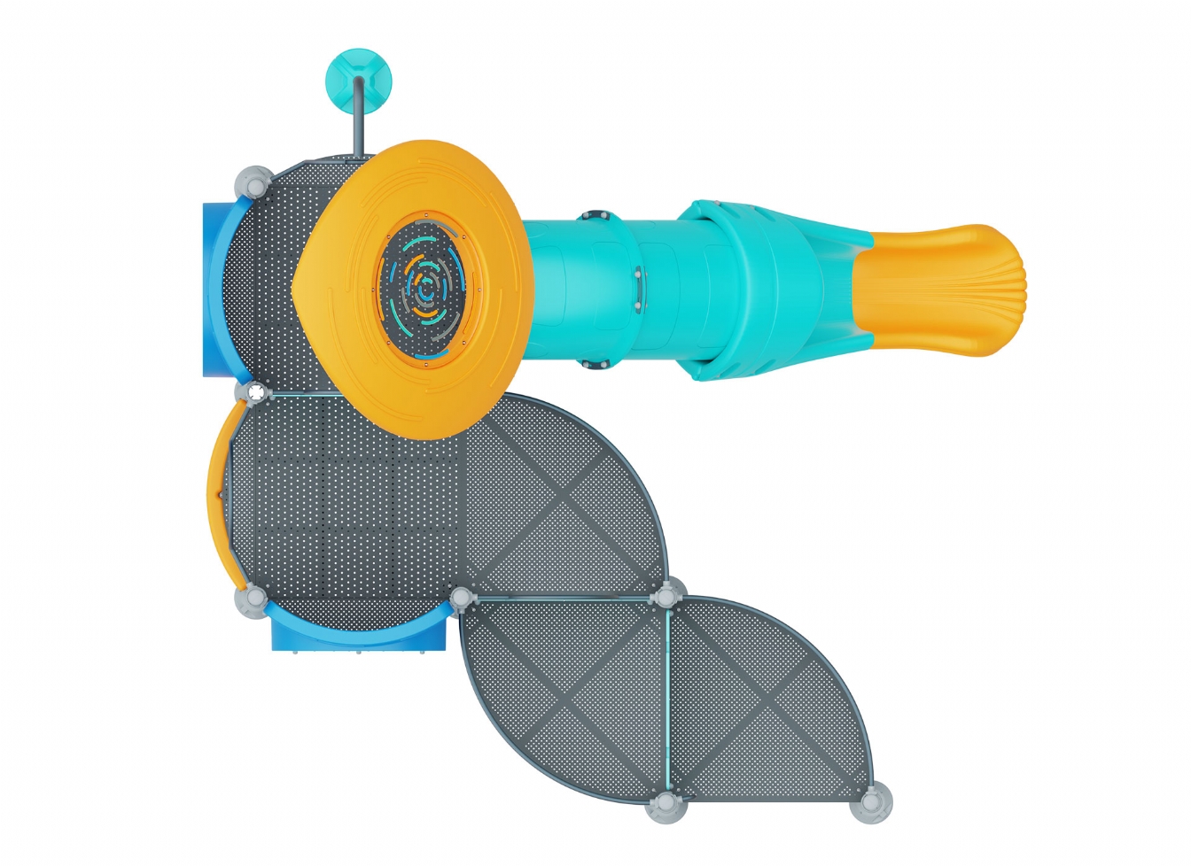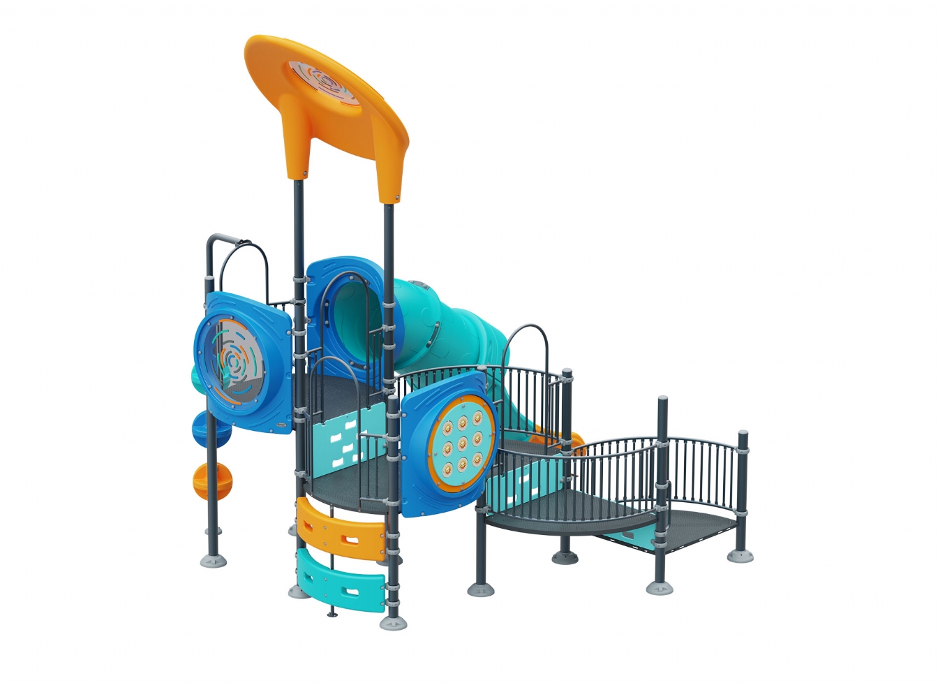 Lekställning Marola i metallprofil, polykarbonat och marinplywood för offentlig miljö.