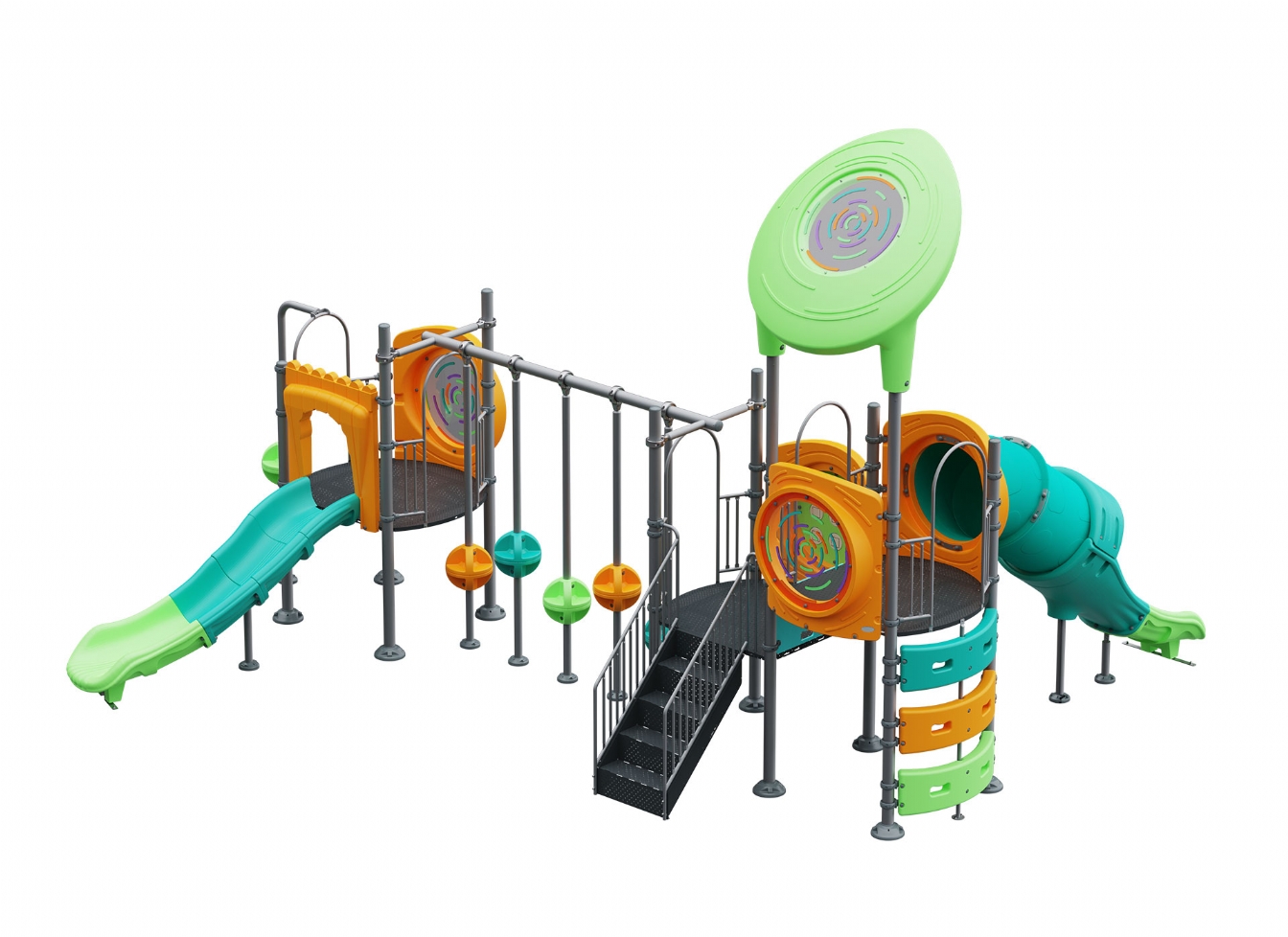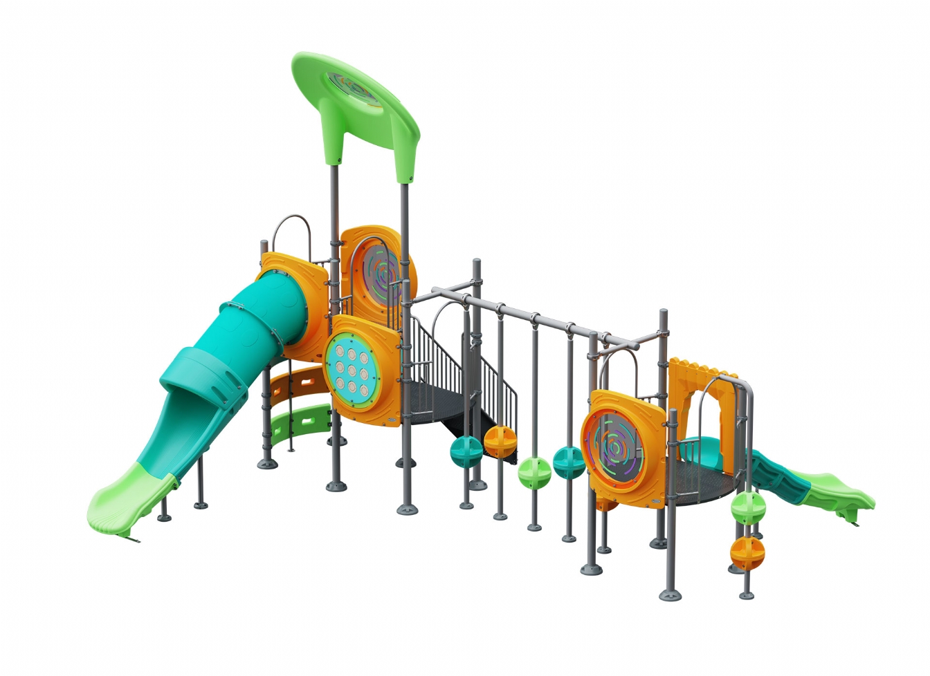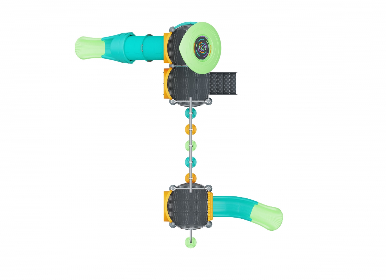 Lekställning Marula i metallprofil, polykarbonat och marinplywood för offentlig miljö.