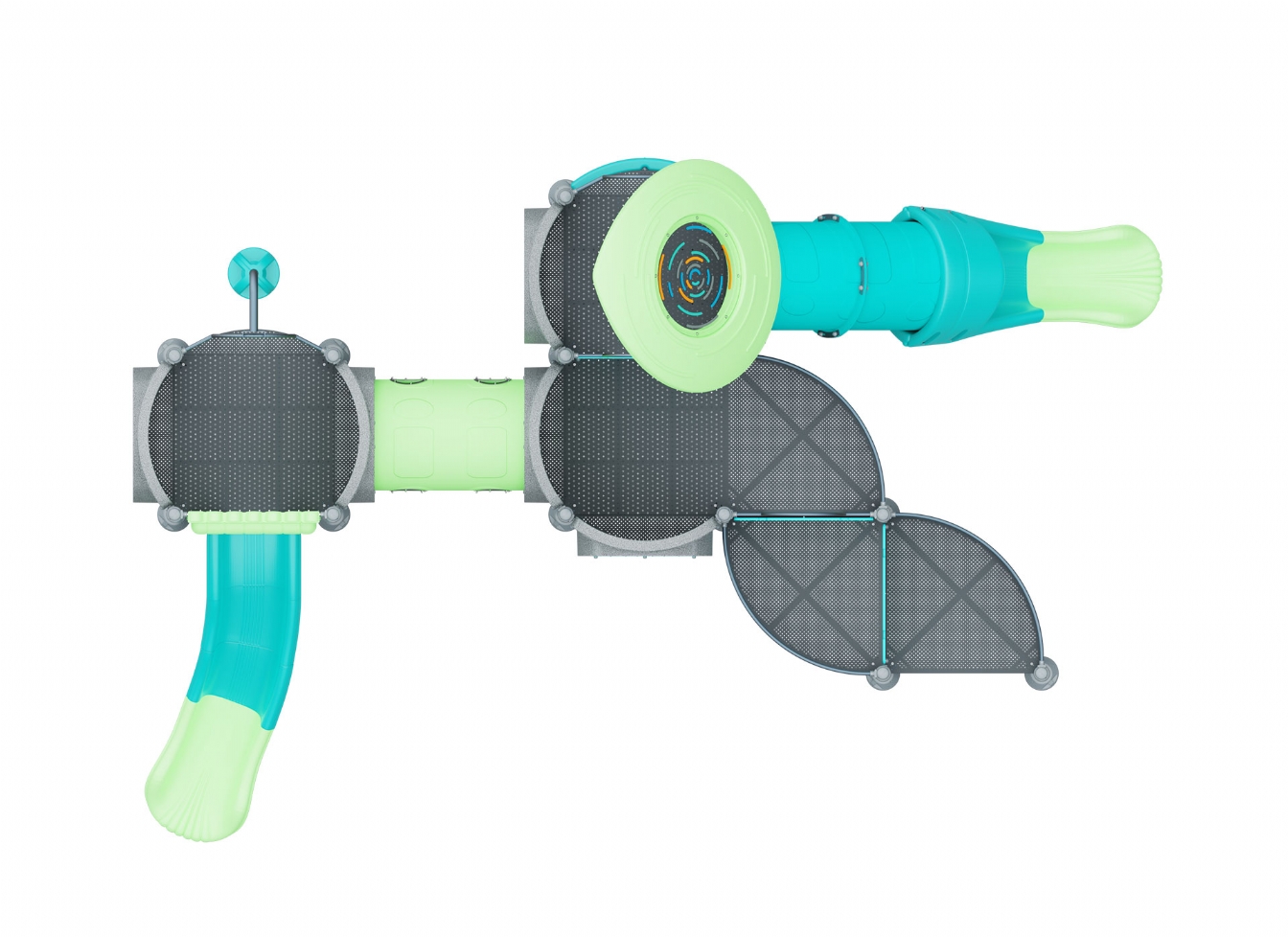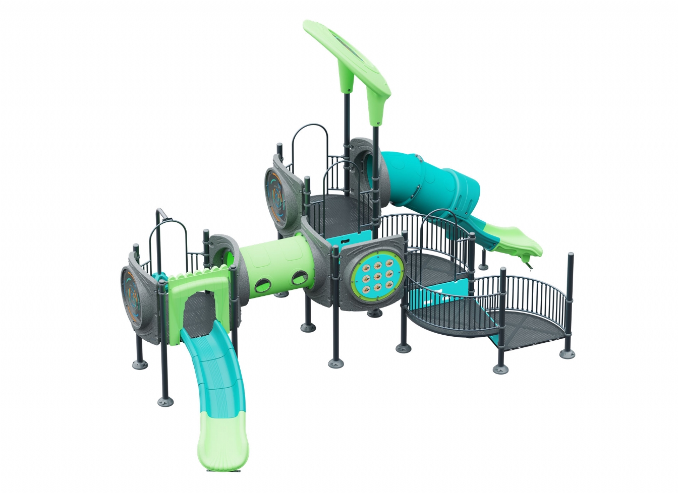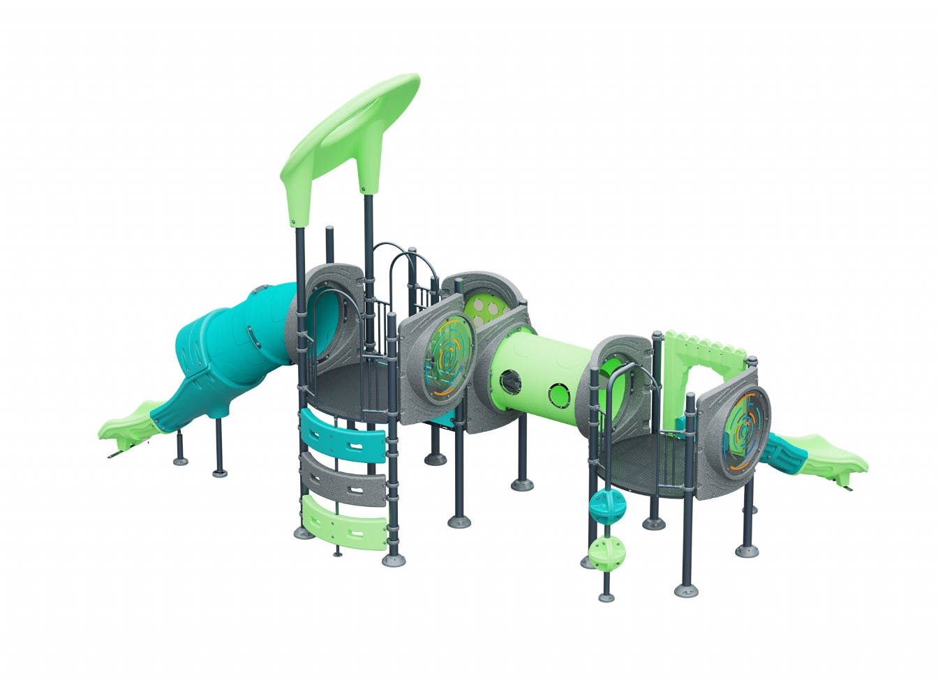 Lekställning Nora i metallprofil, polykarbonat och marinplywood för offentlig miljö.