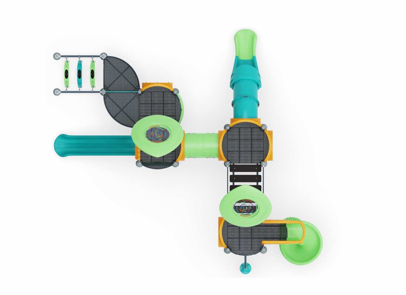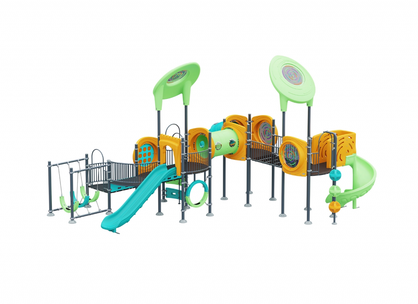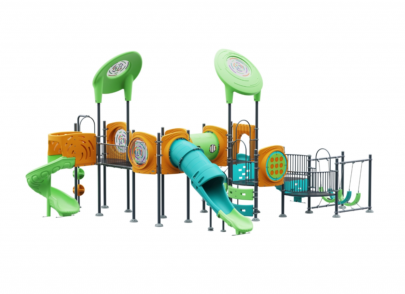 Lekställning Norar i metallprofil, polykarbonat och marinplywood för offentlig miljö.