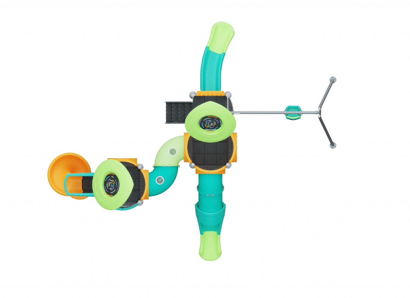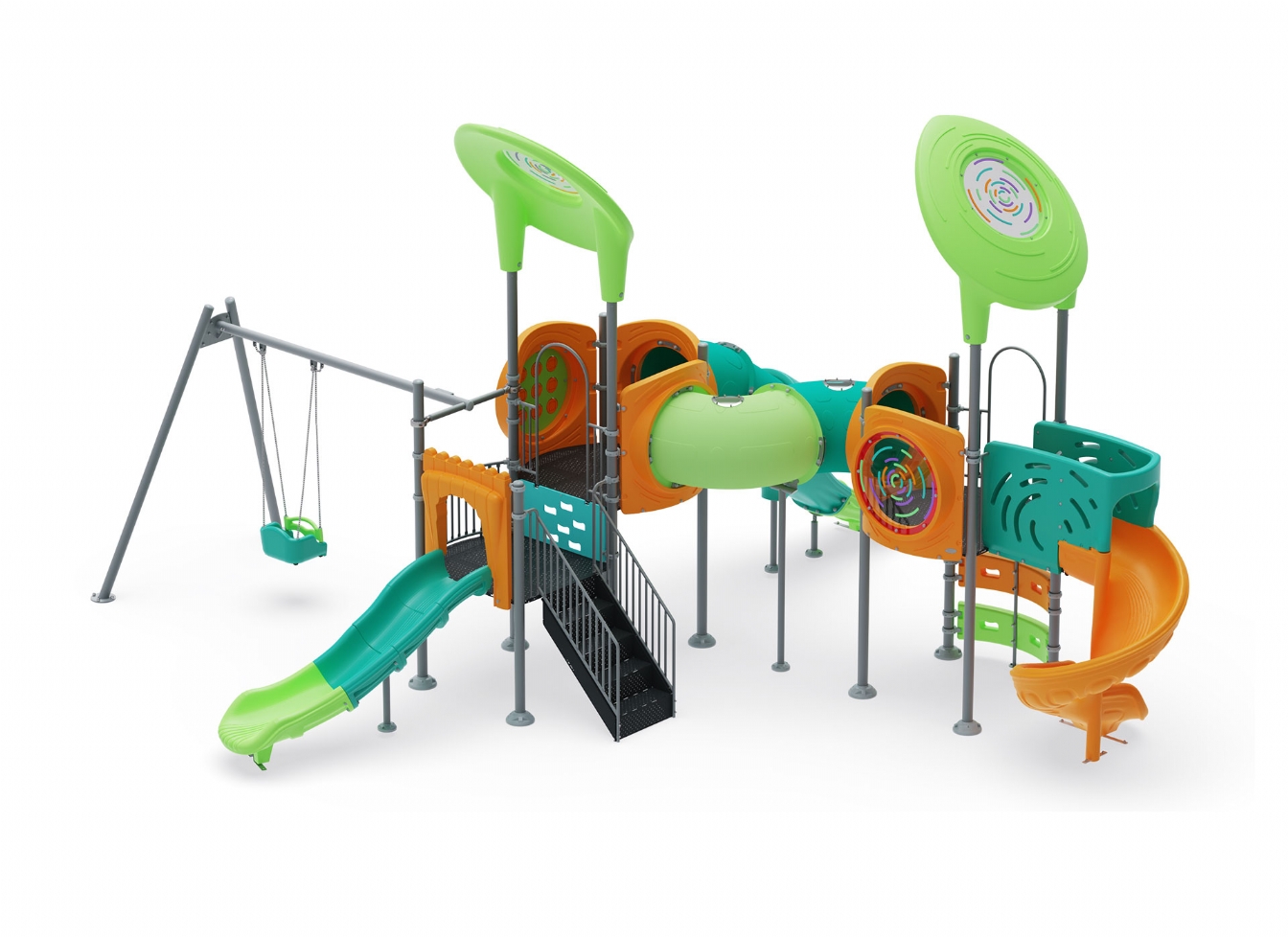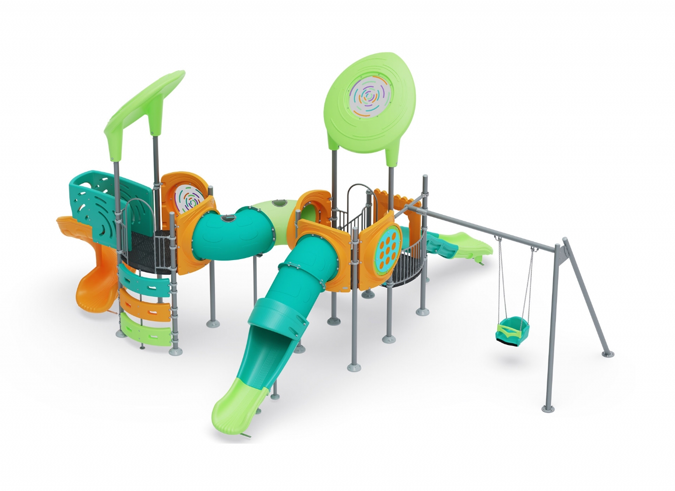 Lekställning Nore i metallprofil, polykarbonat och marinplywood för offentlig miljö.