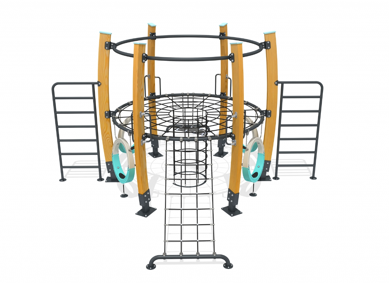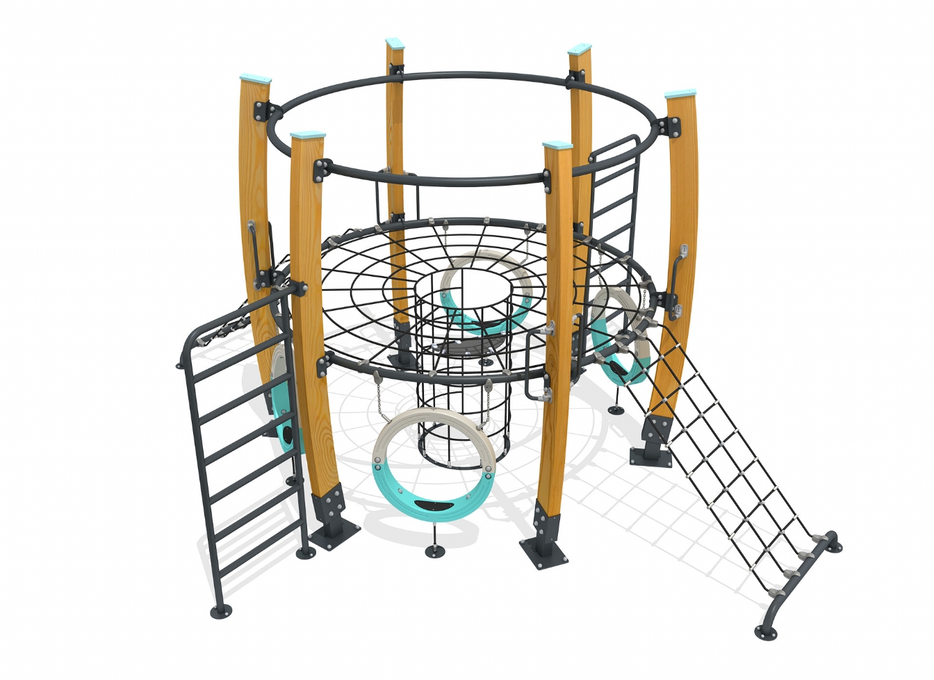 Lekställning Norena i metallprofil, polyeten och trä för offentlig miljö.