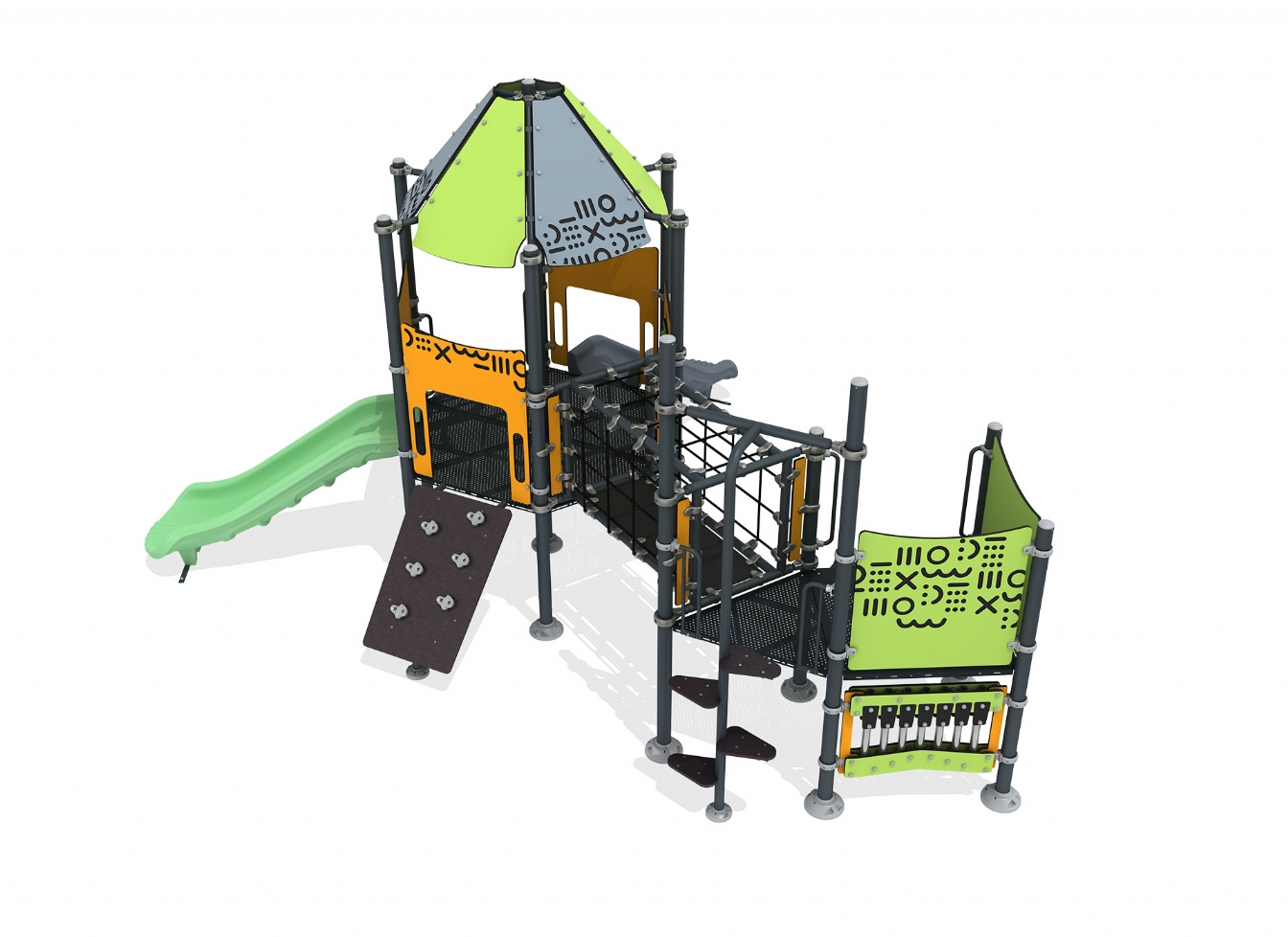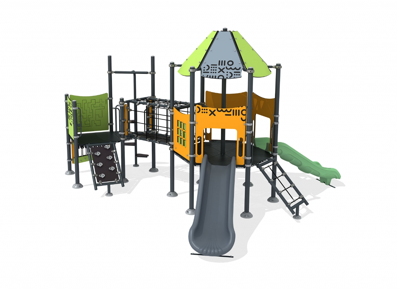 Lekställning Noreno är utvecklad för lekplatser, skolor, förskolor och andra offentliga utemiljöer. Produkten har bredd 589 cm, djup 511 cm och höjd 362 cm. Specifikationen omfattar säkerhetszon L 872 x W 825 samt rutschhöjd 100 cm. Utförandet i stålvajer, marinplywood och gummi ger en tålig konstruktion som lämpar sig för återkommande användning i krävande miljöer. Den är anpassad för upp till 32 barn och rekommenderad ålder 3-12.